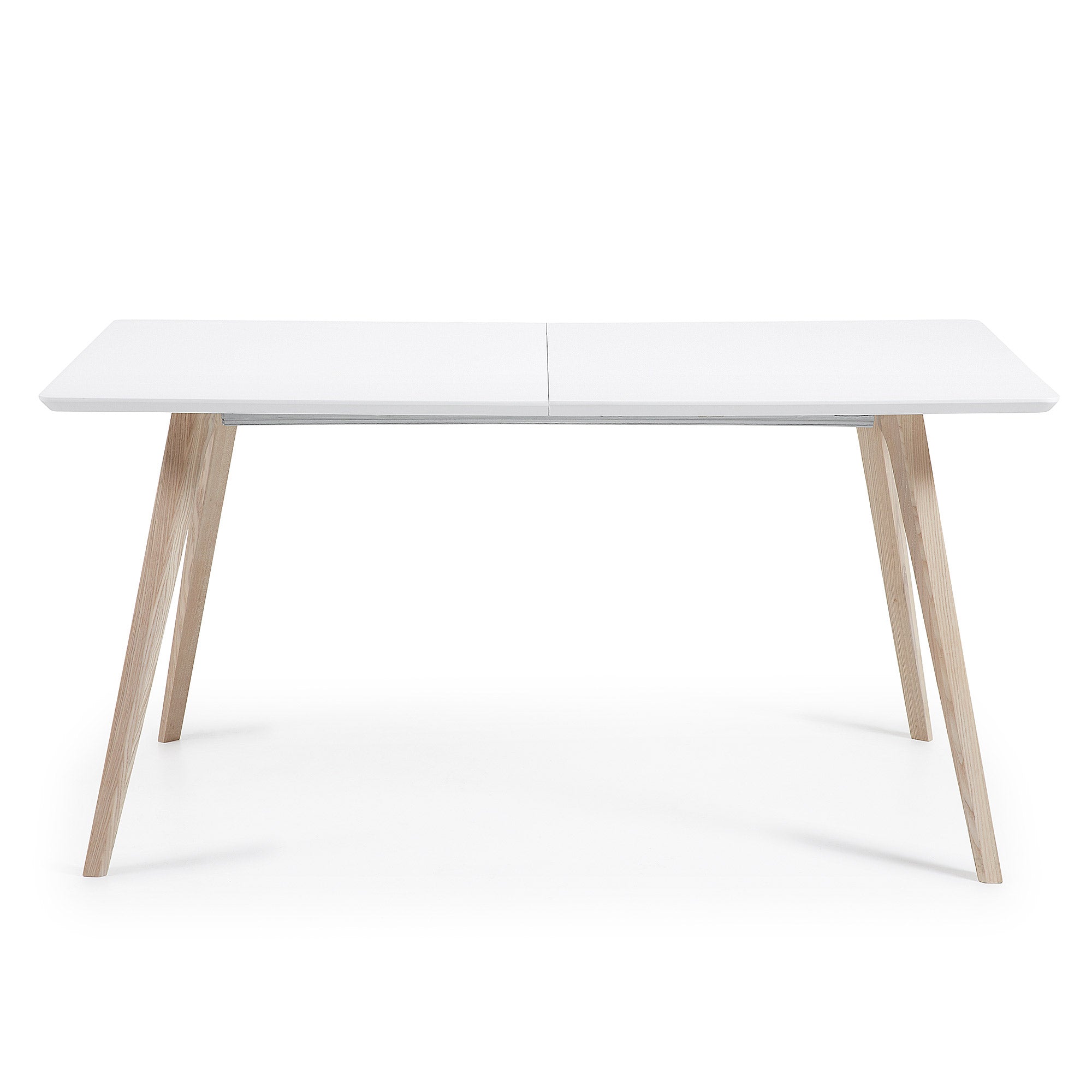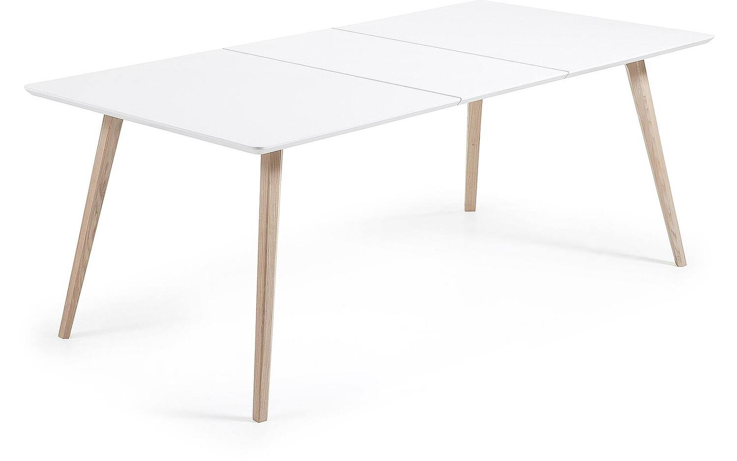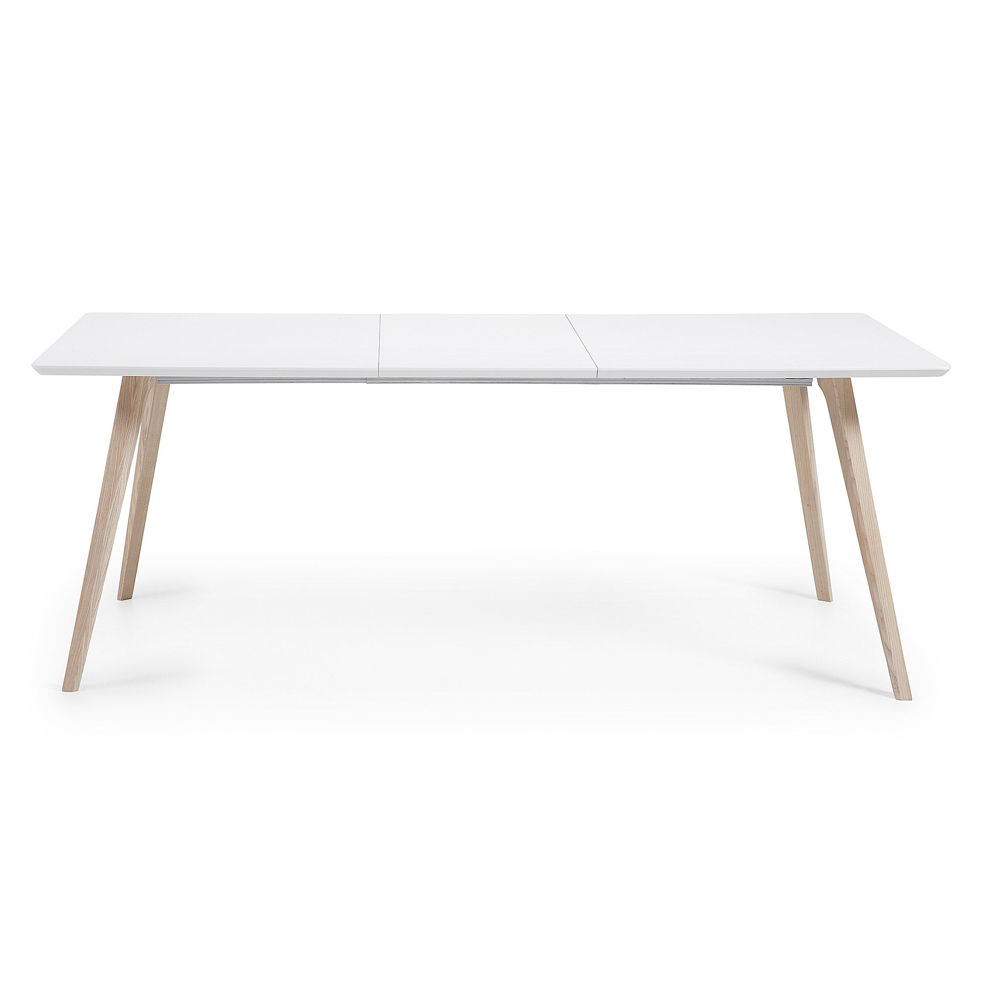 Uitschuifbare tafel met matwit gelakte houtvezelplaat. Onderstel van massief essenhout. Maximale lengte 260 cm. Inclusief tas voor verlengingen.