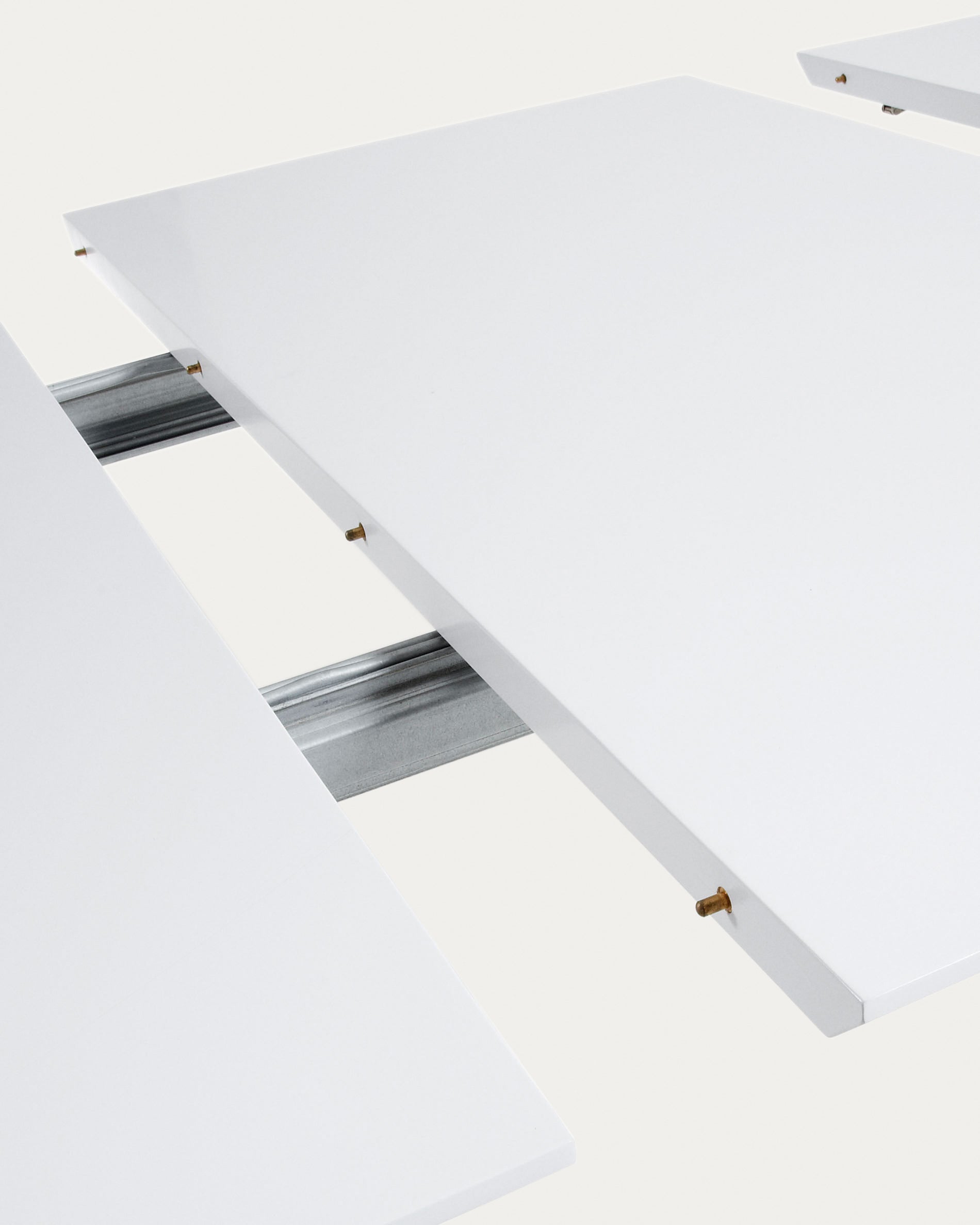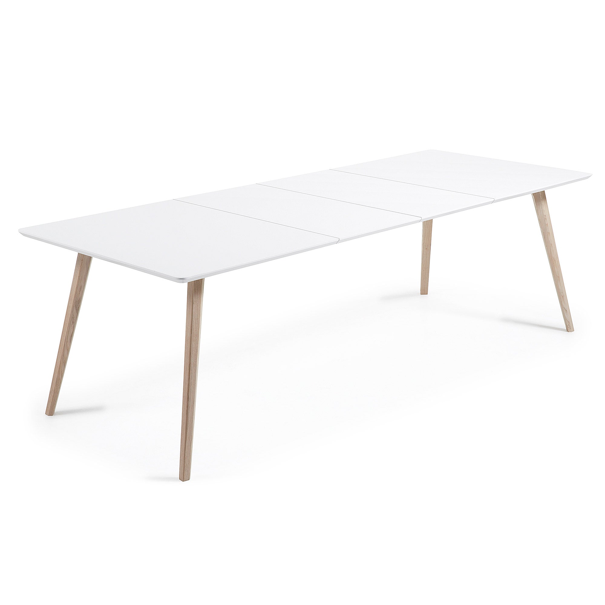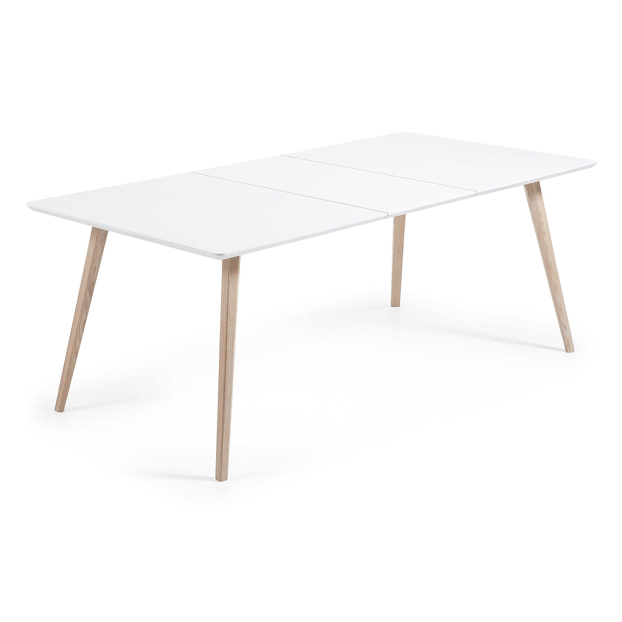 Uitschuifbare tafel met matwit gelakte houtvezelplaat. Onderstel van massief essenhout. Maximale lengte 260 cm. Inclusief tas voor verlengingen.
