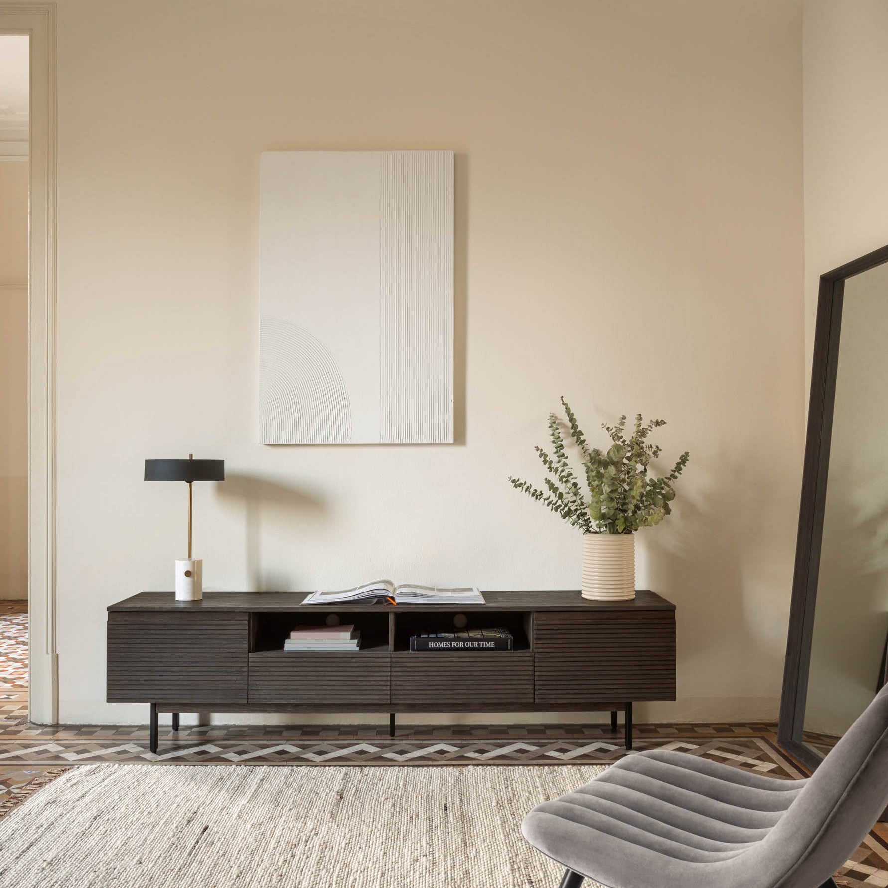Als je op zoek bent naar een ideale plek om spullen op te bergen dan is dit Kave Home Indiann tv-meubel ideaal. Dit uit massief acaciahout vervaardigde meubelstuk met antracietkleurige afwerking geeft meer stijl aan je interieur.