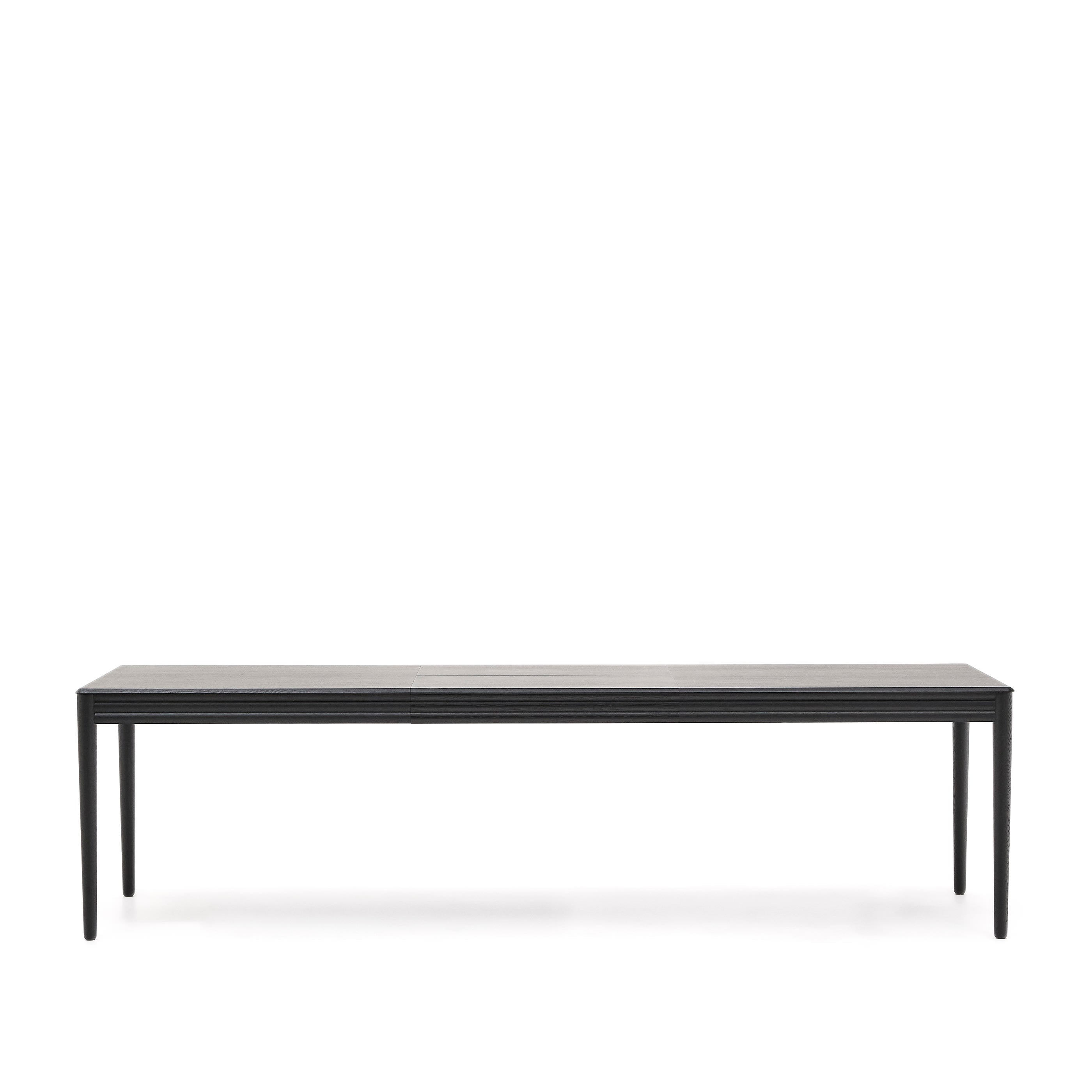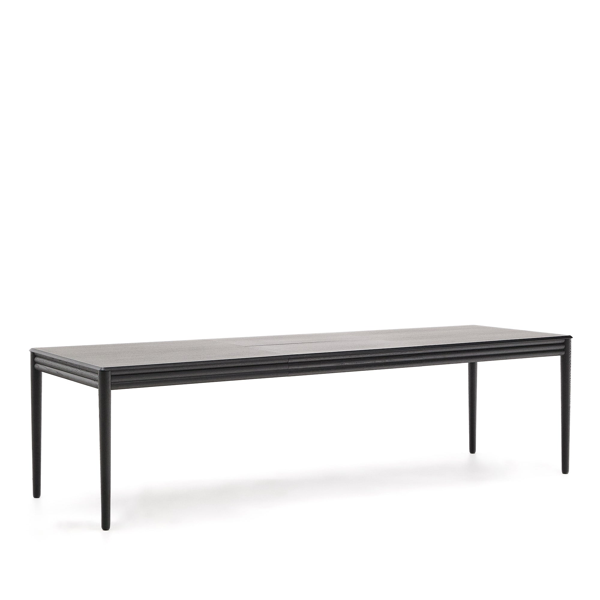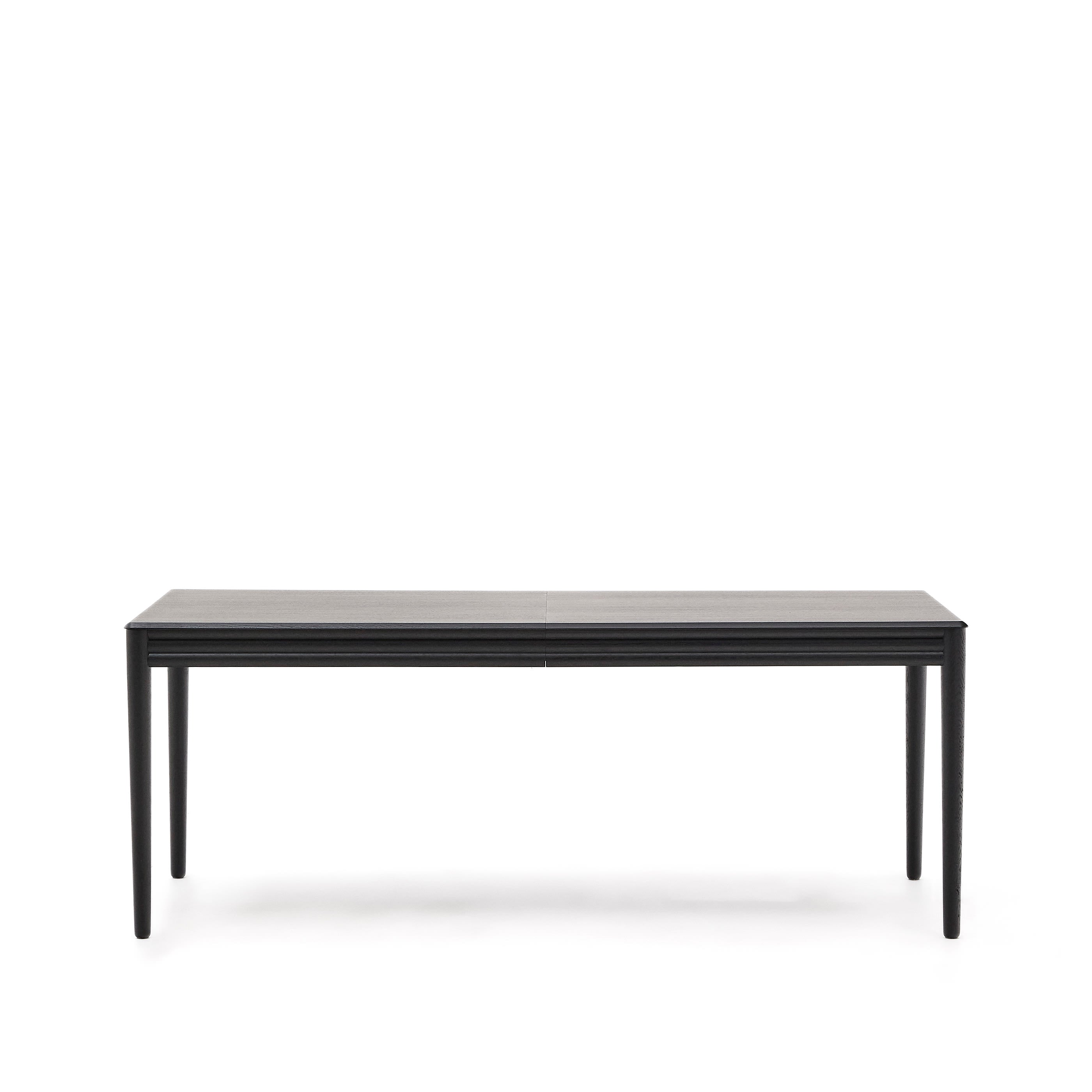 - Uitschuifbare tafel met gefineerd blad en poten in massief eiken met zwart gebeitste afwerking.