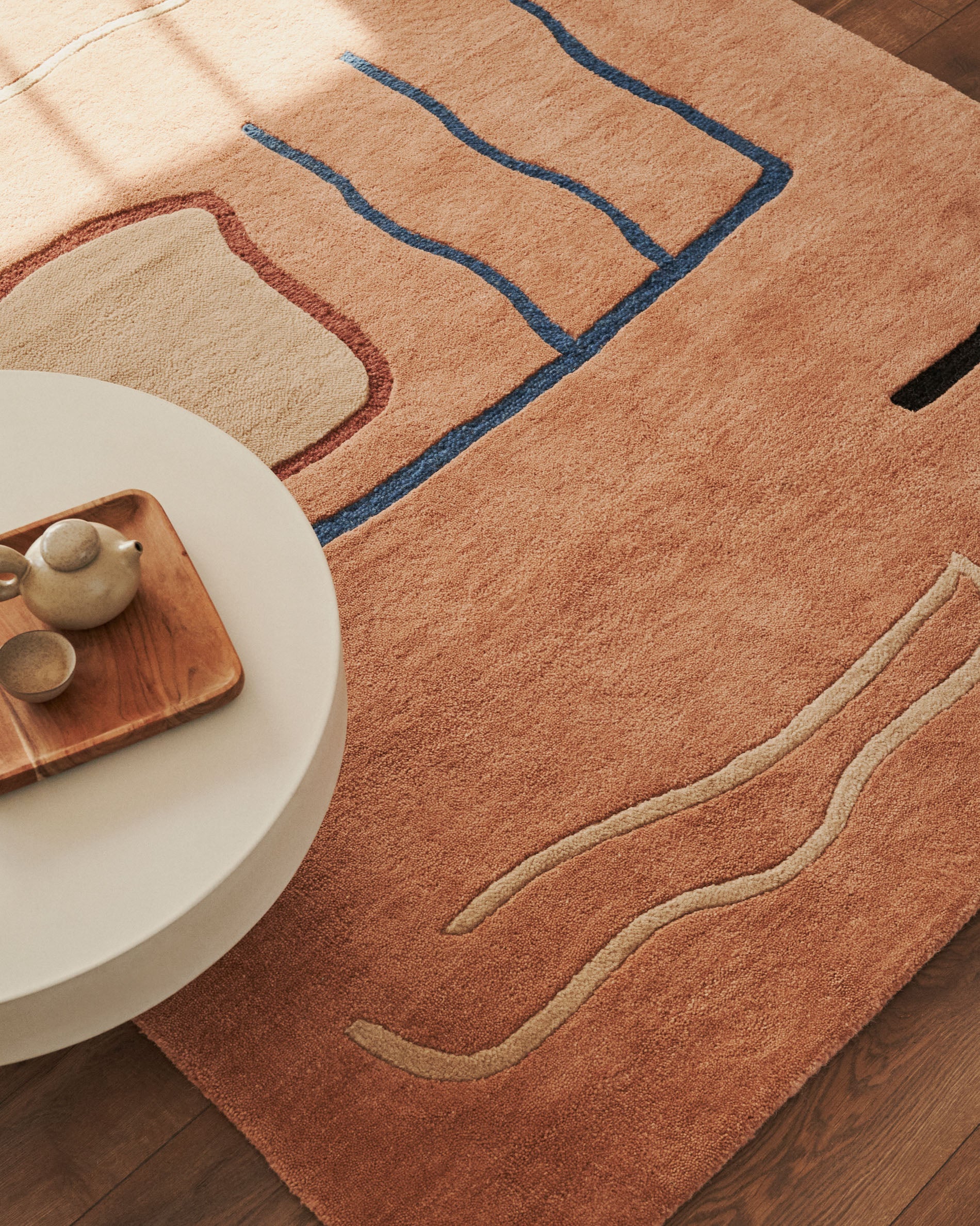 Het geometrische en kleurrijke ontwerp van het Llorell tapijt is perfect om uw kamers te renoveren zonder ruimte in te nemen. Bovendien is het gemaakt van wol, met een zachte touch. Natuurlijke materialen zijn trendy.