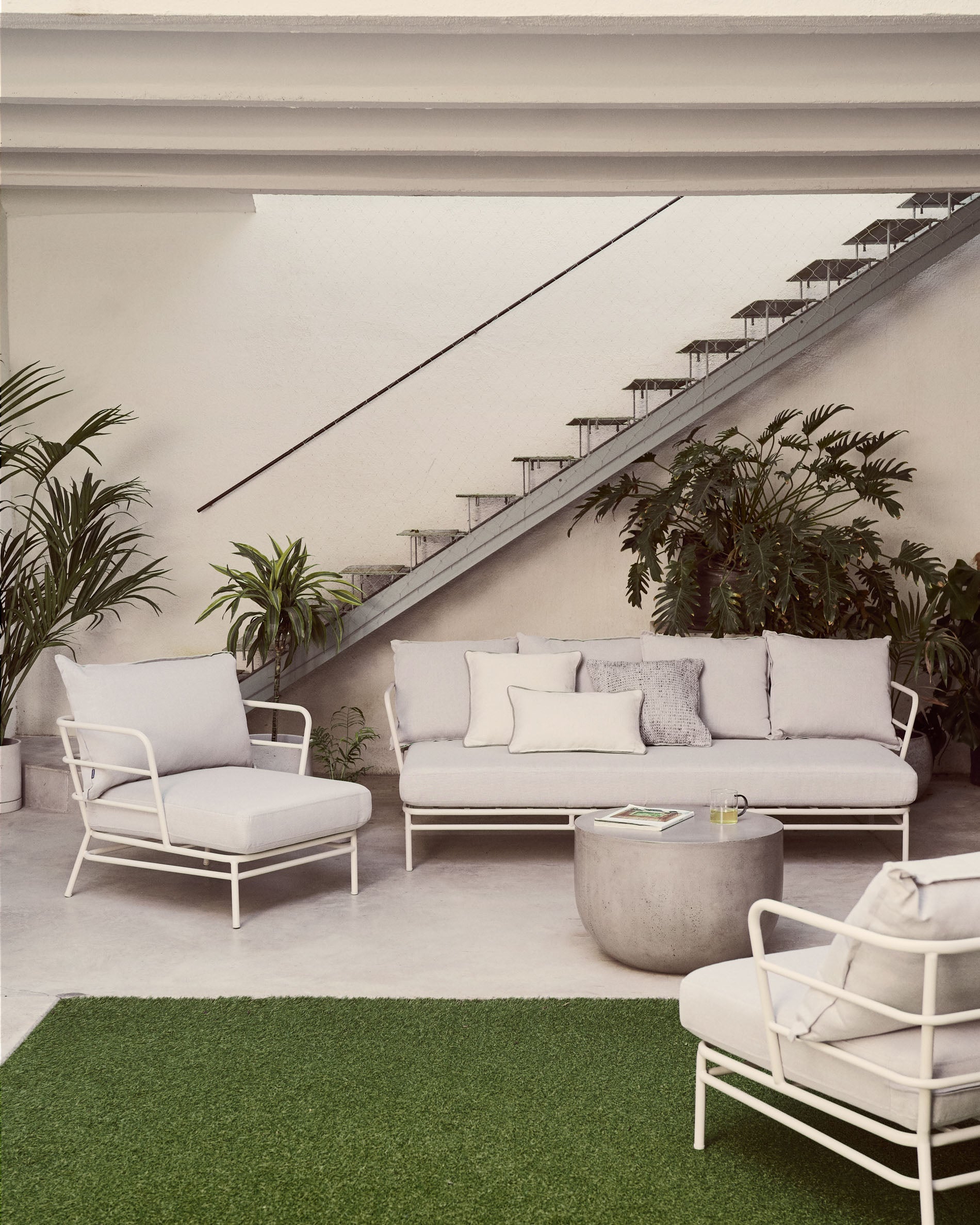 Staal zet de toon voor deze bank die comfort en stijl combineert. Het lichtgewicht ontwerp geeft overdekte buitenruimtes een licht, ruimtelijk gevoel en nodigt uit om volledig tot rust te komen.