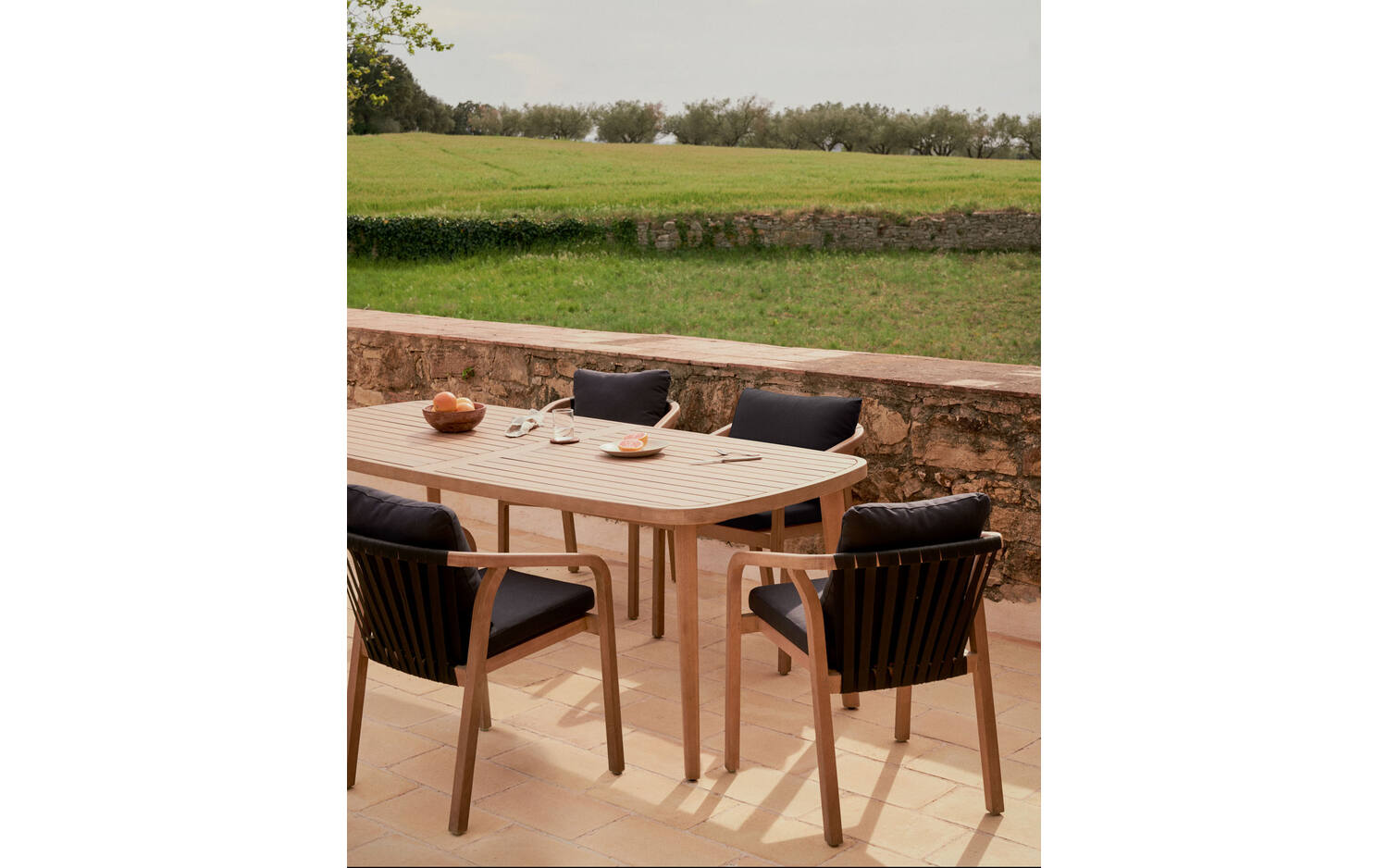 Ronde vormen zijn trendy: creëer uw buiteneetkamer met de Maset-tafel, waar iedereen een plekje heeft om te eten. Veelzijdigheid is zijn sterke punt, gemaakt van massief eucalyptushout, te combineren met allerlei omgevingen en stijlen.