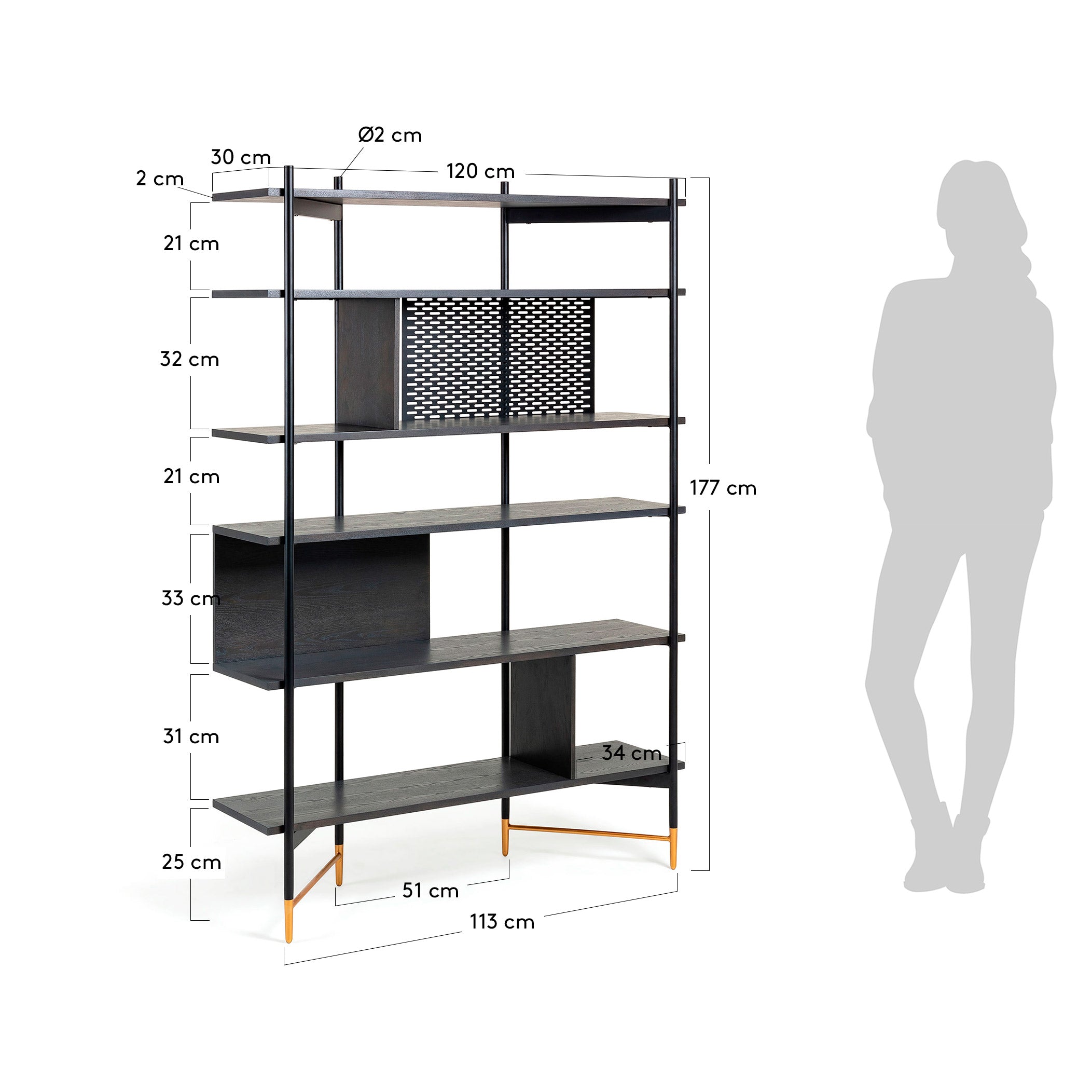 Boekenkast 120 x 177 cm met structuur van essenhout met essenfineer. Achterkant met metaal gaas detail. Poten van metaal met goud geverfde details.