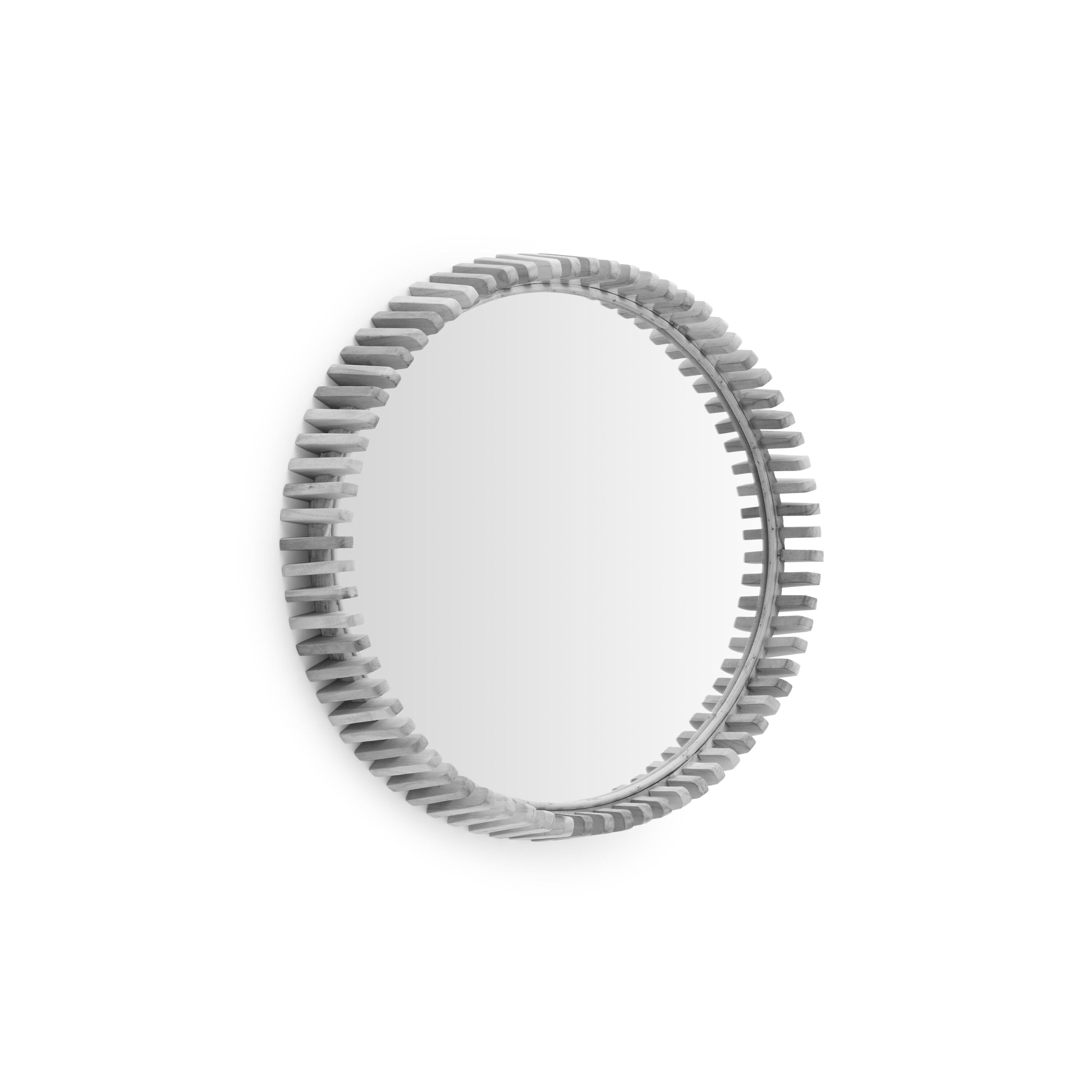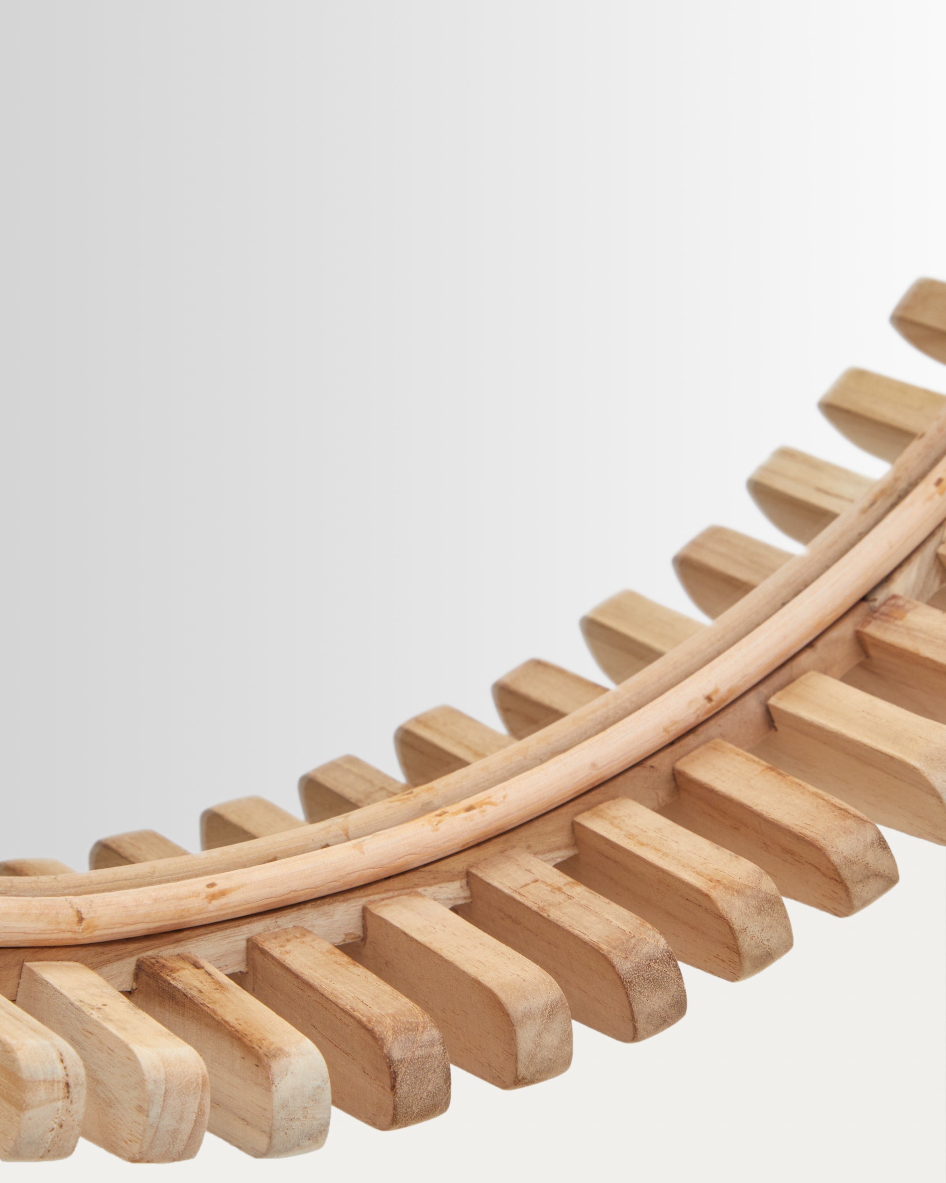 De Polke spiegel heeft een frame van uitgesneden stukken, stuk voor stuk geplaatst, van massief natuurlijk teakhout. Het is een stuk met een aanpasbare diameter voor elke ruimte en een ontwerp dat past bij elke trendsettende stijl.