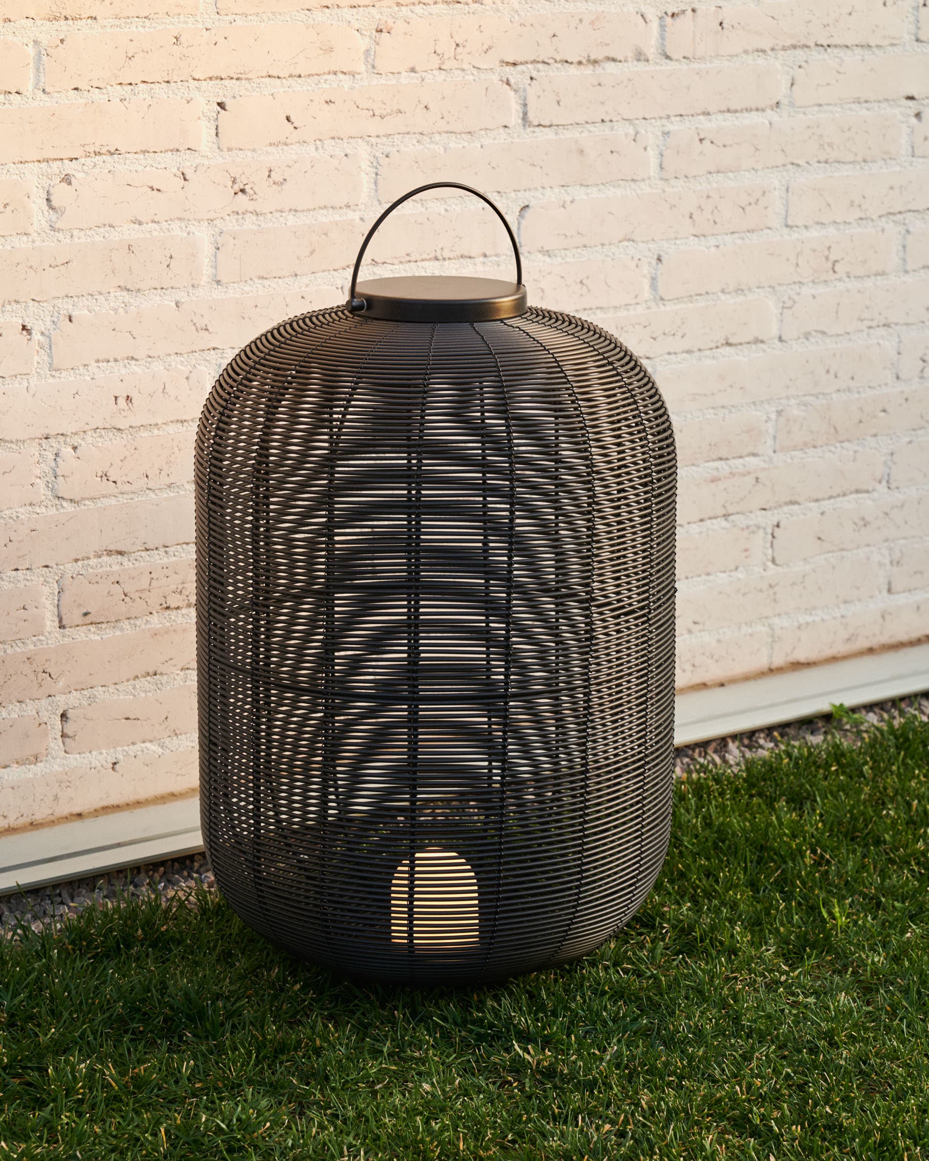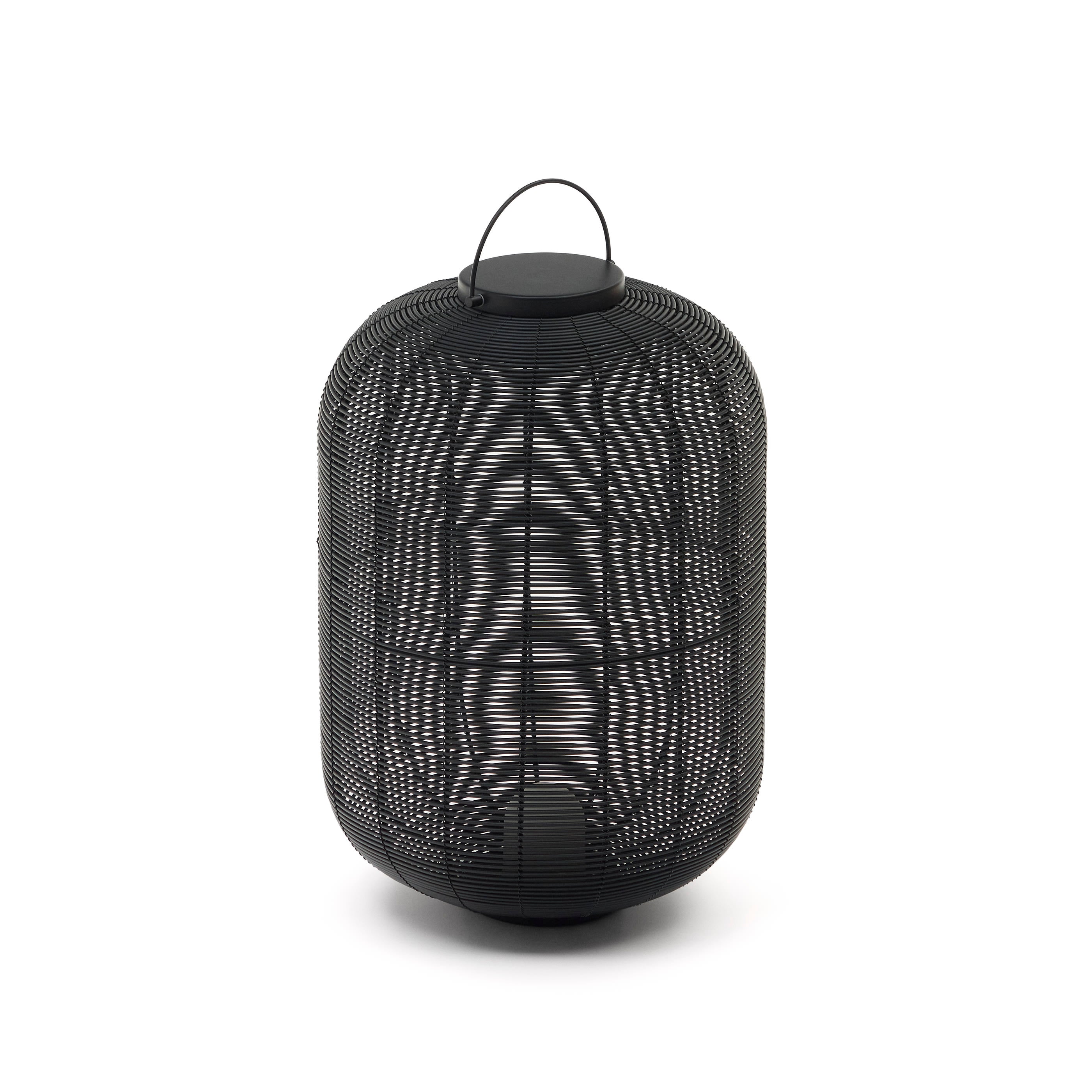 - Zwarte kunststof rotanlamp met twee handvatten om in twee standen op te hangen.