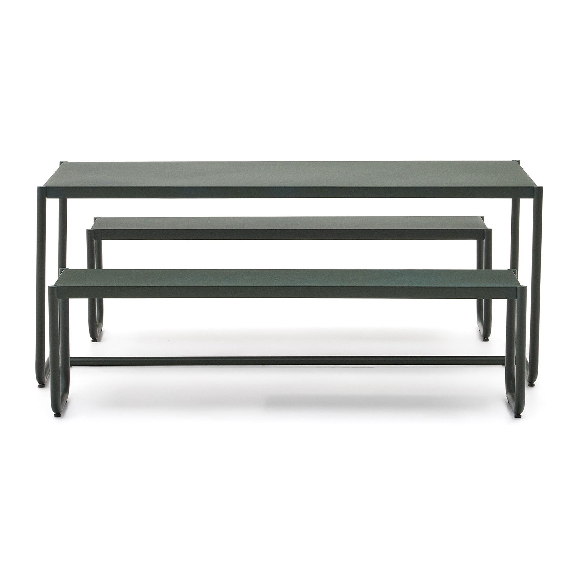 - Set van tafel en 2 banken van gegalvaniseerd staal met groene afwerking.