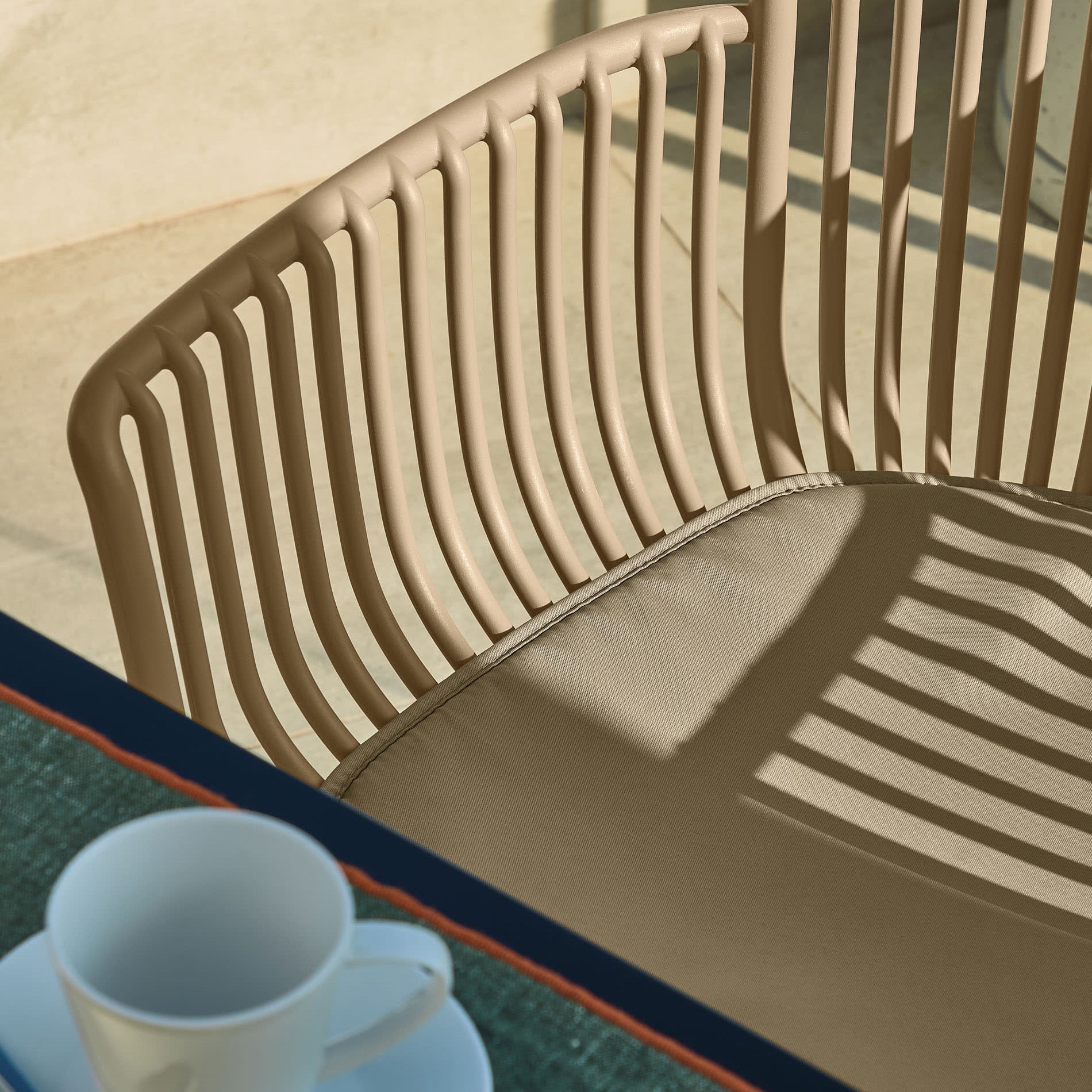 - Kunststof stoel, 100% recyclebaar materiaal, beige van kleur.