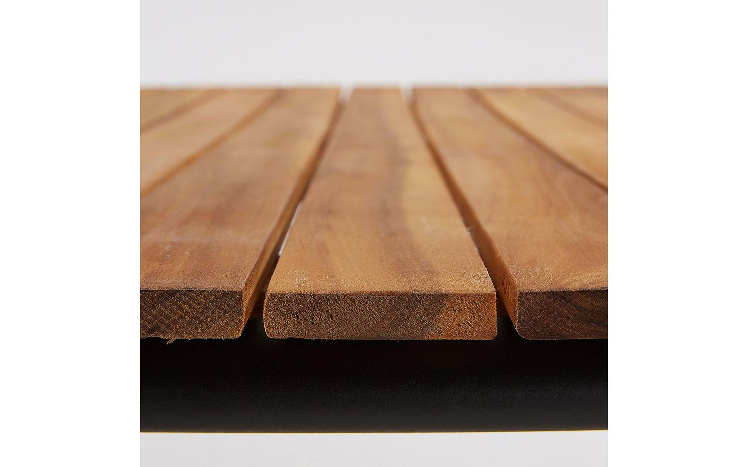 Tafel van zwart gespoten metaal. Bovenkant van acacia hout. Voor binnen en overdekt buitengebruik.