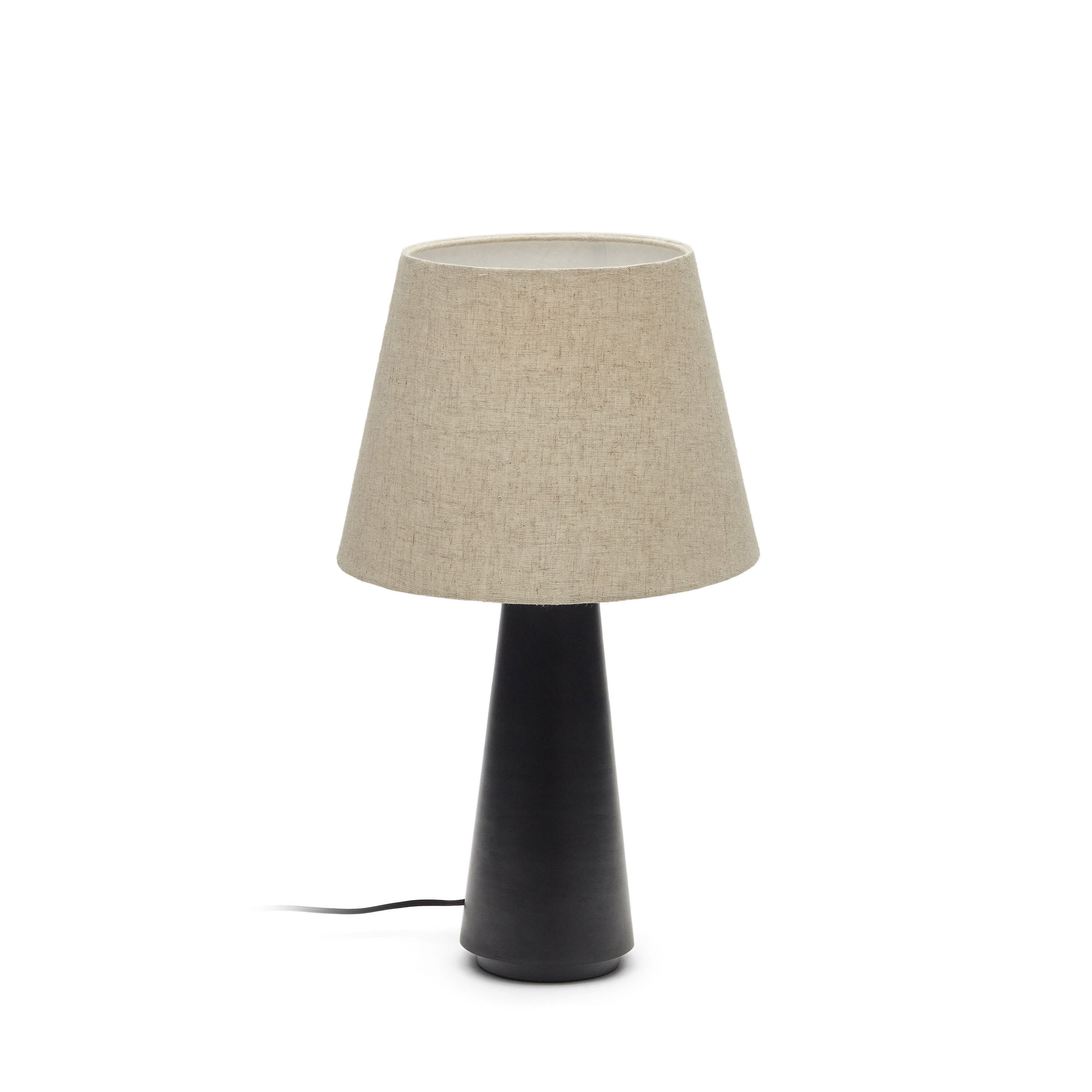 - Tafellamp van zwart gelakt metaal en een linnen kapje.