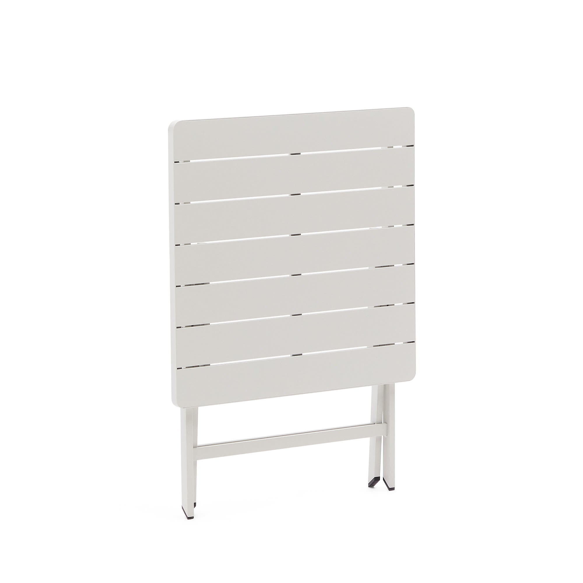 - Opvouwbare tafel gemaakt van aluminium met een lichtgrijze afwerking.