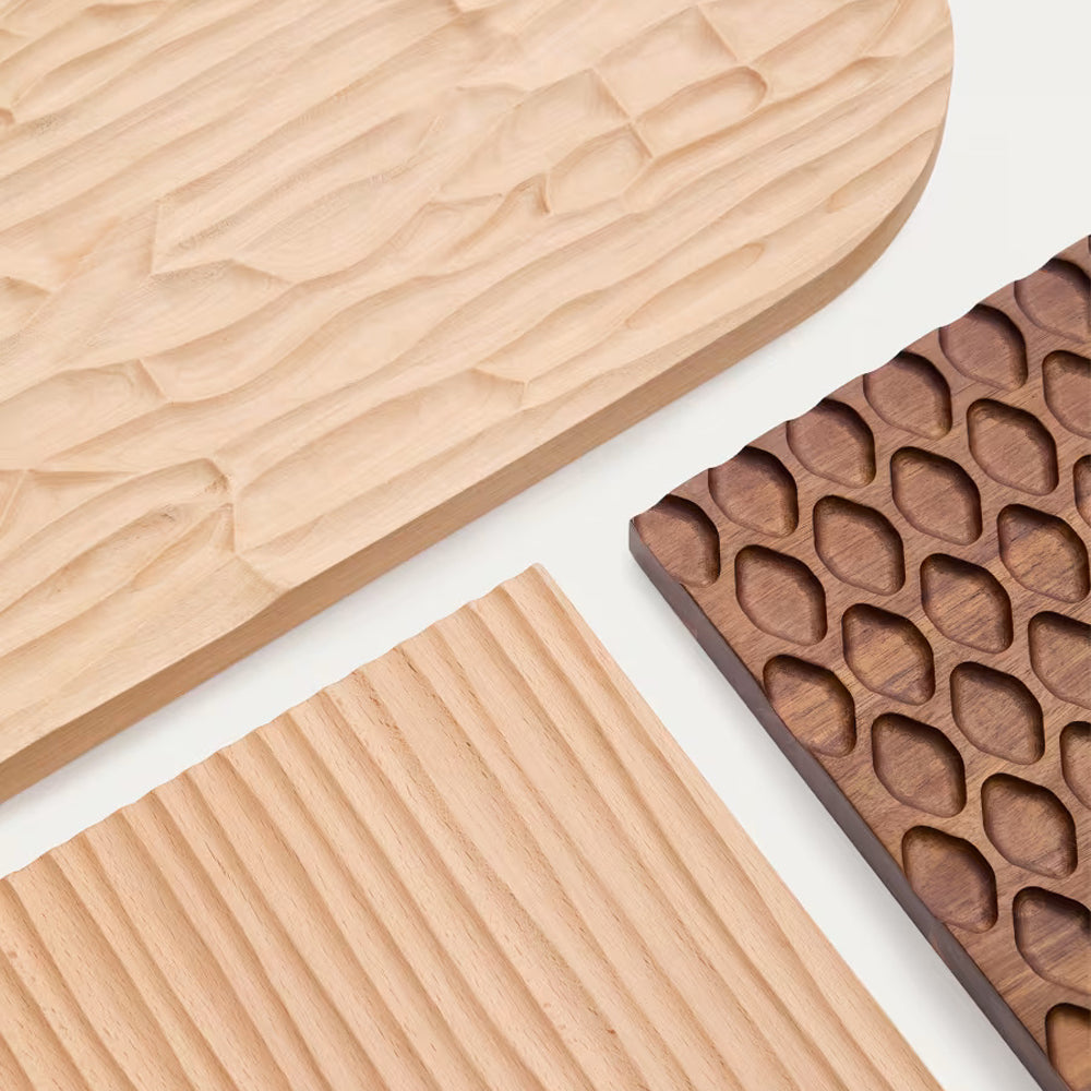 Verschillende vormen, eindeloos combineren Trivax bestaat uit vier geometrische houten panelen die samen een kunstwerk vormen — maar je kunt ze ook apart ophangen of in een eigen compositie. Elk stuk heeft zijn eigen textuur, kleurvariatie en afwerking, van glad gelakt tot licht ruw.