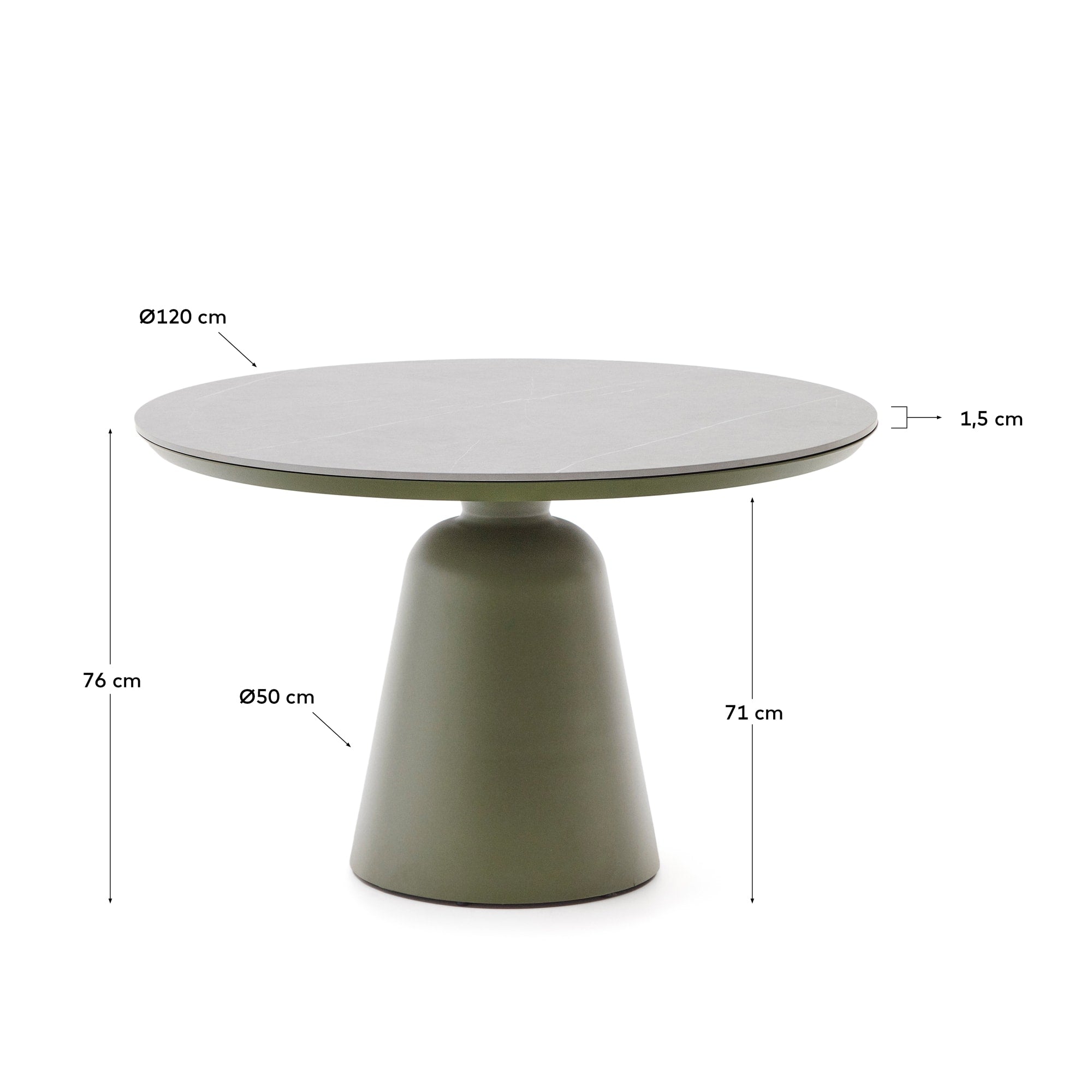 - Ronde tafel met aluminium onderstel en tafelblad van keramiek.
