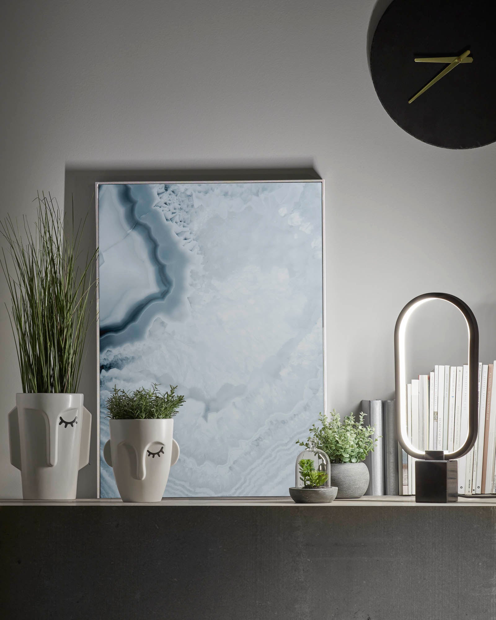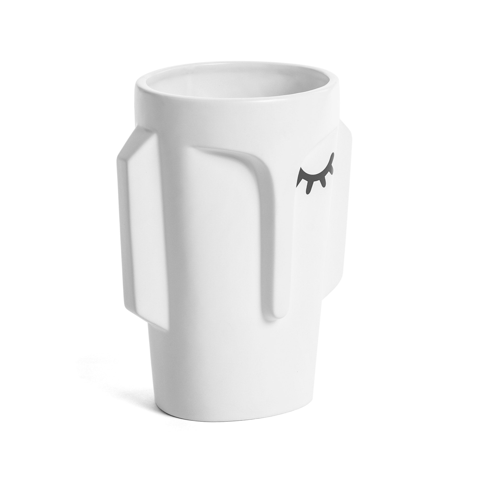 Deze vaas Amenna, de grootste uit de collectie, heeft een moderne en originele vorm aan de voorkant. Het gaat om een decoratieartikel gemaakt van wit geverfd dolomiet, een natuurlijk materiaal, waar het contour van een dicht oog op is getekend. Zet e r bloemen in! Zo valt het écht op.