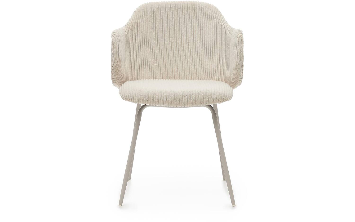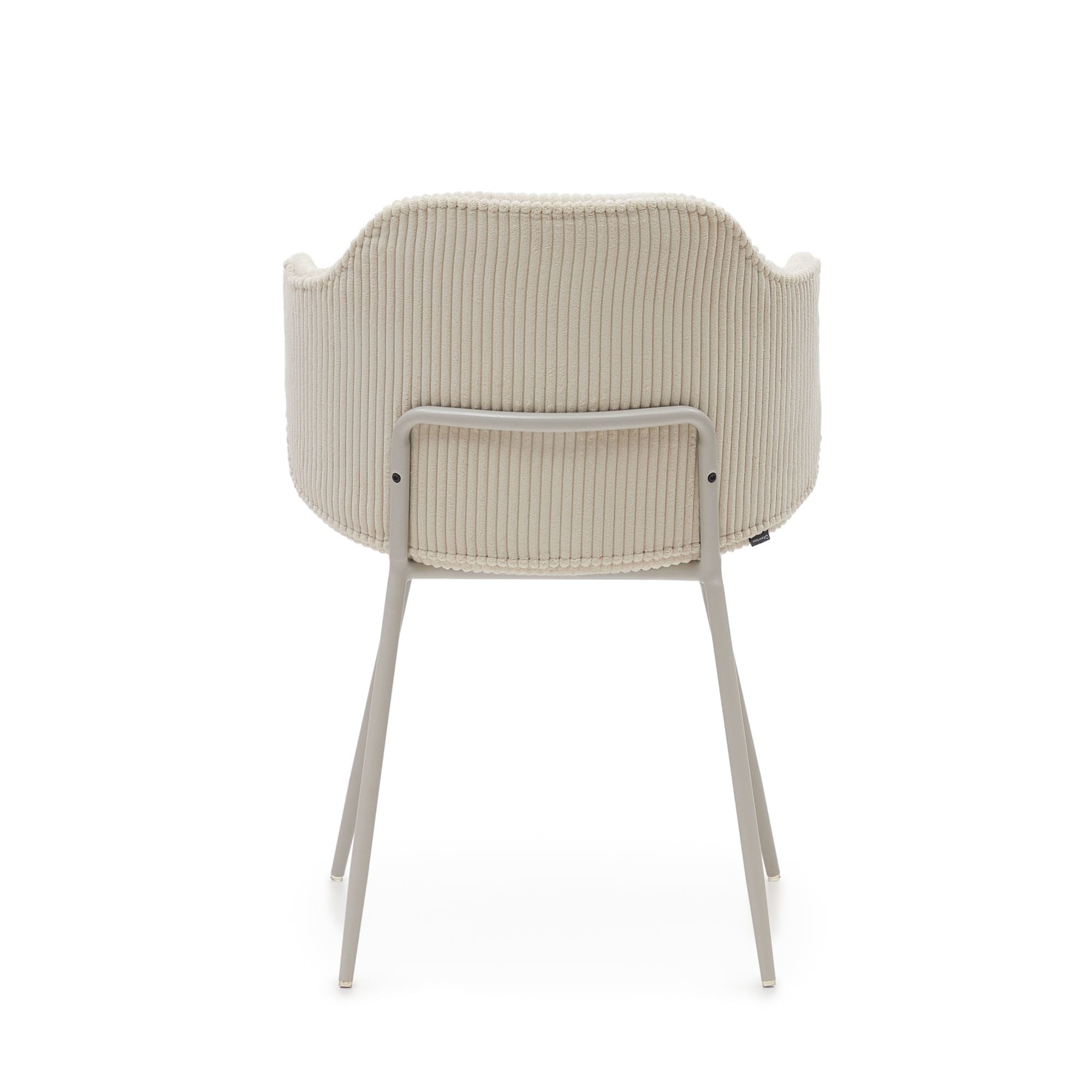 - Yunia stoel in dik beige corduroy met stalen poten in een beige gelakte afwerking