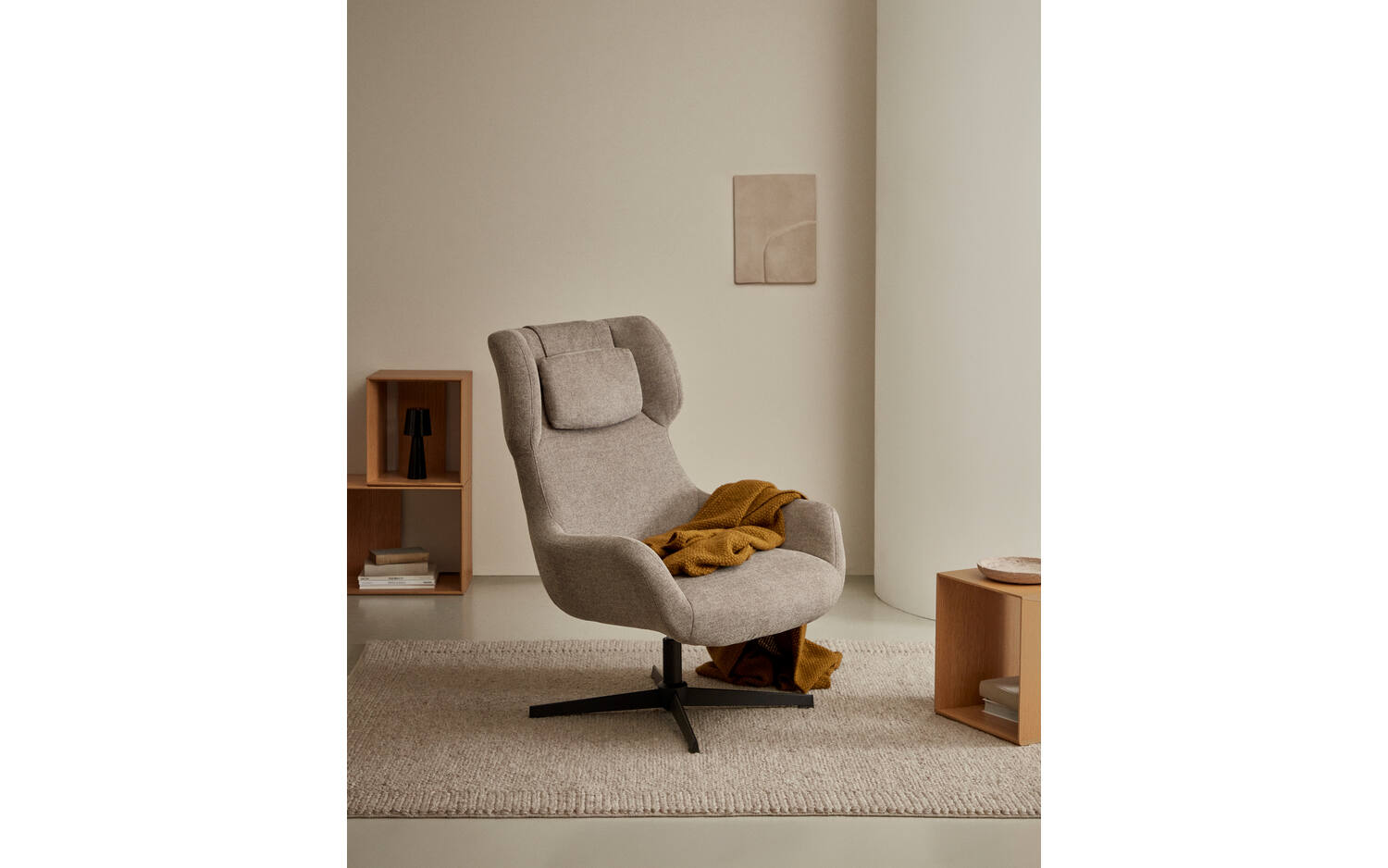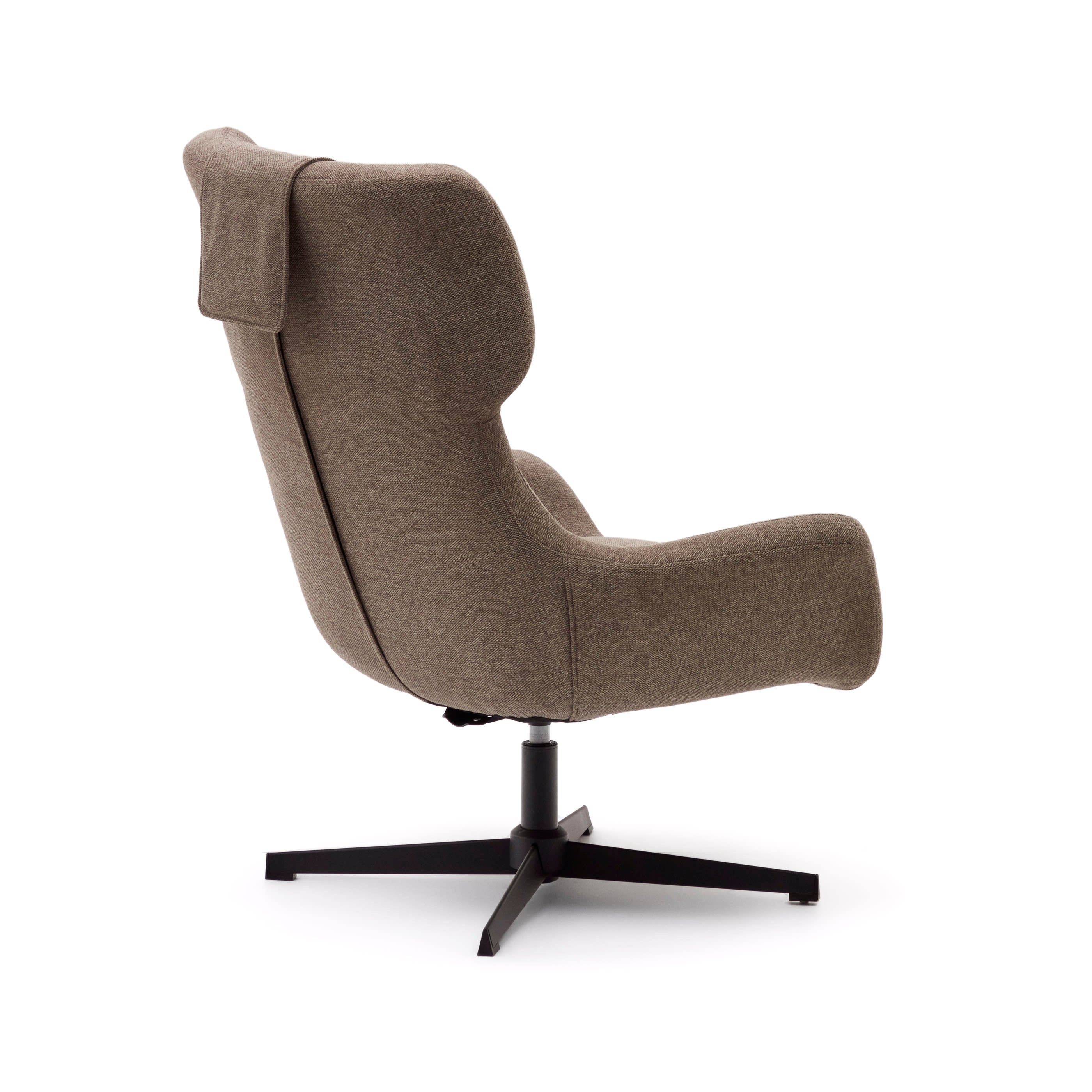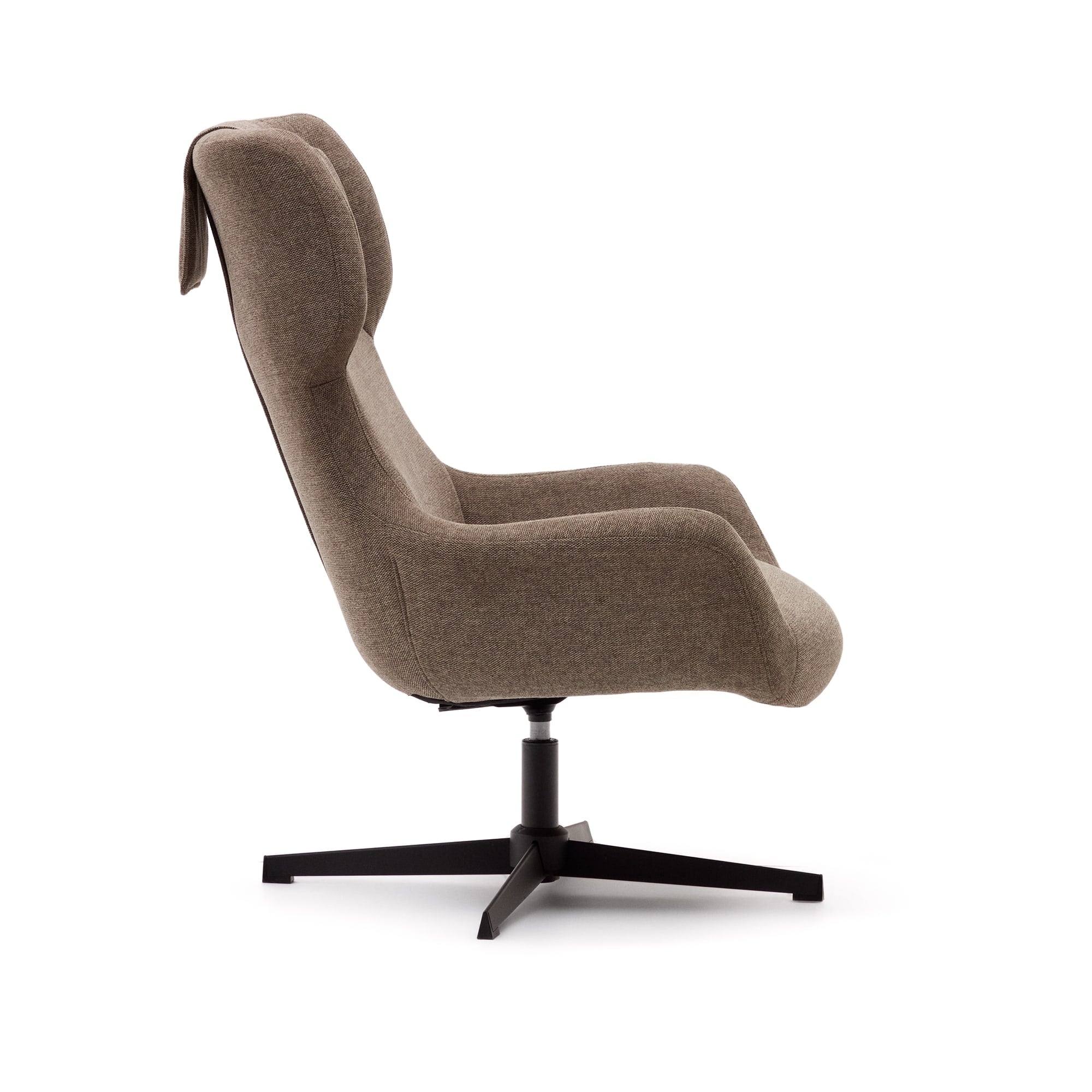 - Draaistoel met armleuningen bekleed met lichtbruine chenille.