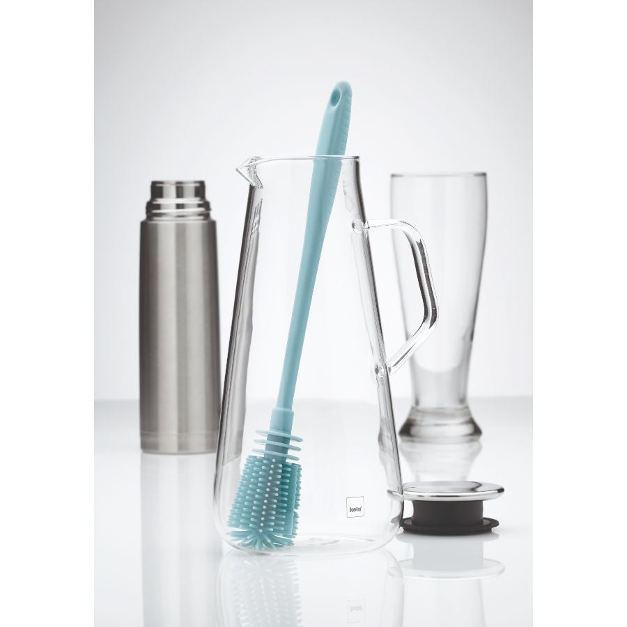 Hoe maak jij jouw flessen en karaffen nu op een gemakkelijke en efficiënte manier schoon? Met deze lichtblauwe flessenborstel uit de Susa-serie van Kela doe je dit letterlijk en figuurlijk in een handomdraai! Dankzij de lengte van 31 centimeter kom je met gemak tot de bodem van de meeste flessen, waardoor je deze brandschoon kan borstelen. De siliconen borstel met roestvrijstalen basis is flexibel genoeg om door de opening van de fles te halen en maakt het schoonmaken van al jouw flessen of karaffen kinderlijk eenvoudig!