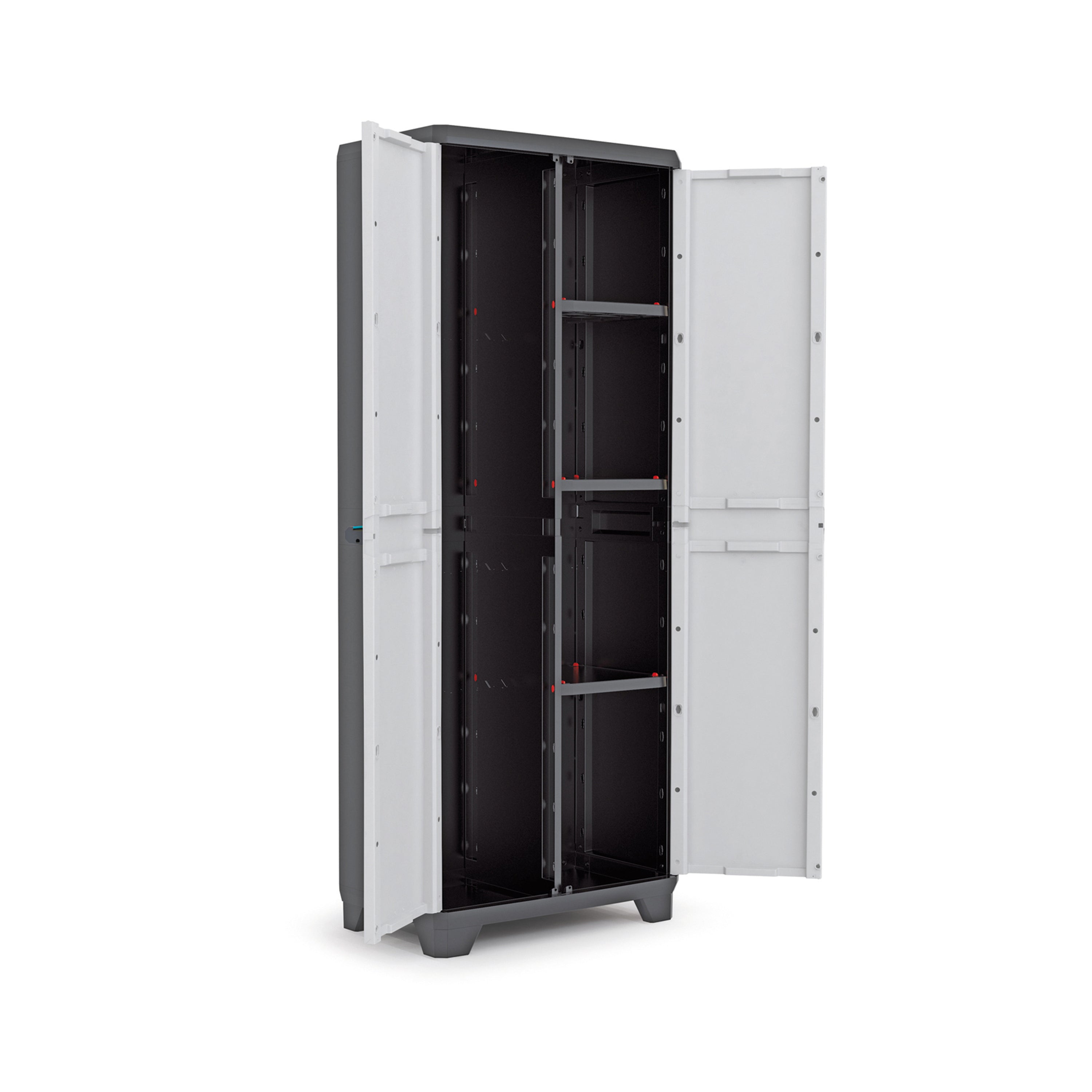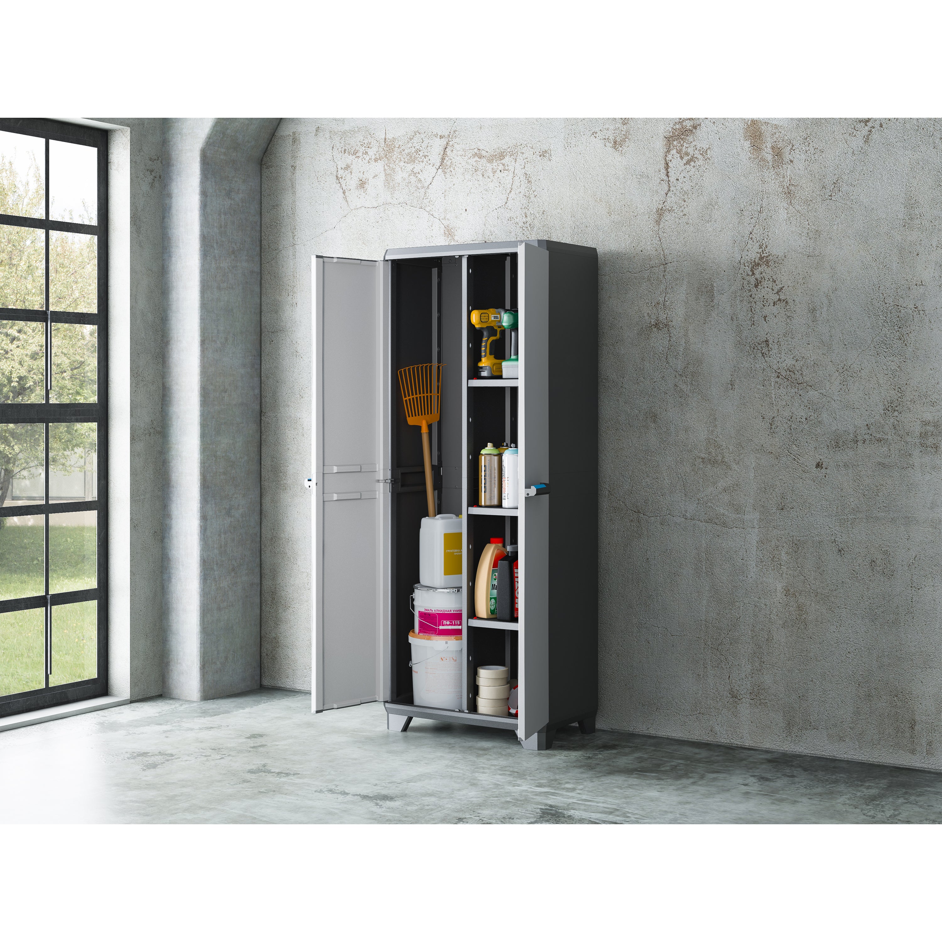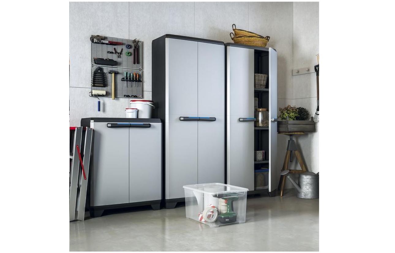 - Met 3 legplanken en een gedeelte voor bezems en stelen