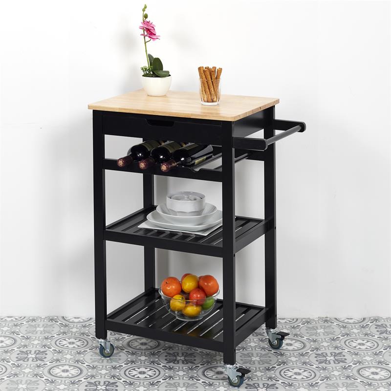 Deze zeer praktische keukentrolley is uitgerust met een houten blad van 61 x 40 cm. Dit keukenkastje is ideaal voor kleine keukens, omdat het blad tevens als werkblad kan dienen. Onder het werkblad zit nog 1 lade en een plank voor 4 (wijn)flessen. Daaronder 2 legplanken waar je ook nog items op kunt zetten zoals pannen, servies, potten, etc. Aan de zijkant zit een stang voor bijvoorbeeld thee- en handdoeken.