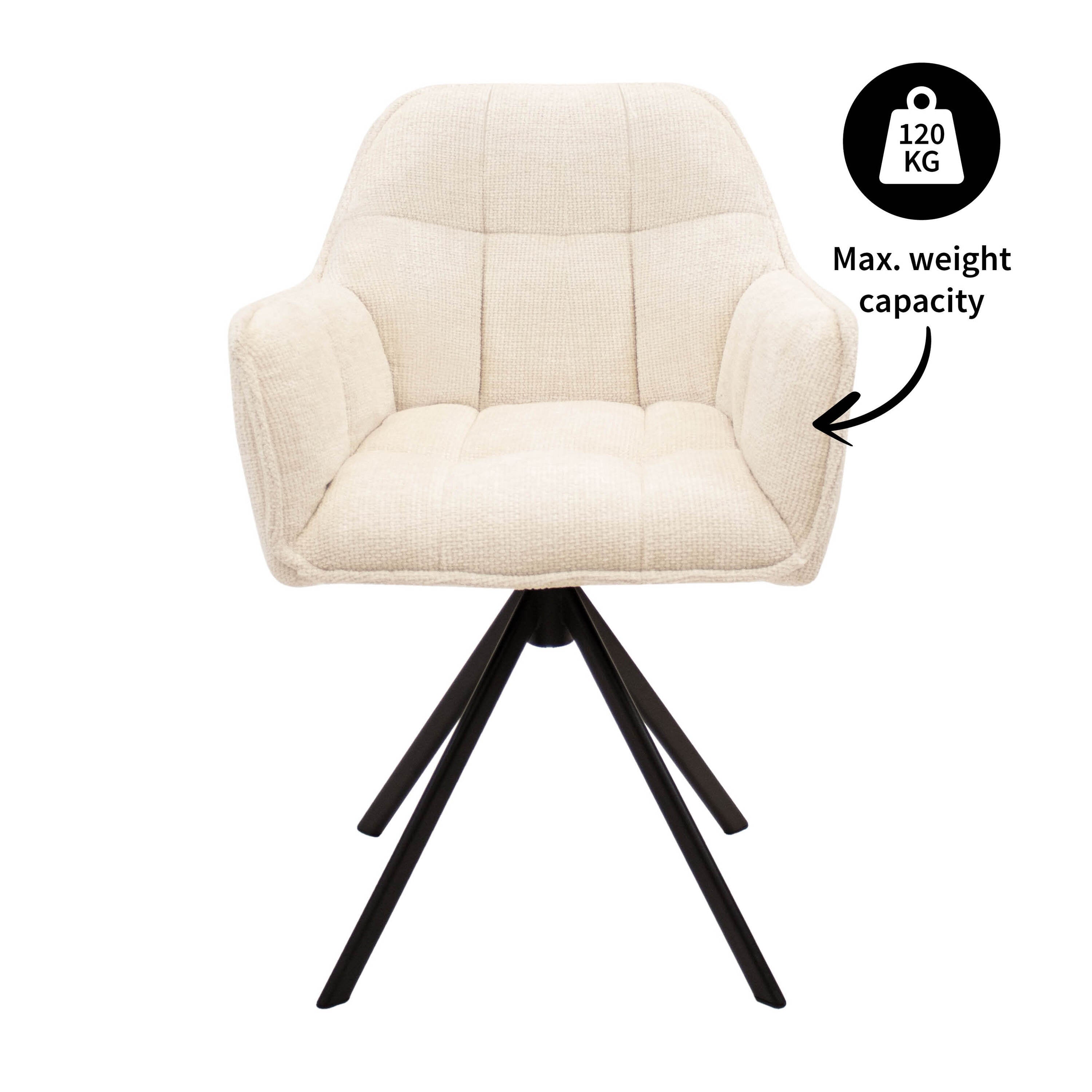 LUC is de perfecte mix van comfort, stijl en functionaliteit. Met zijn 180 graden draaibare onderstel brengt LUC niet alleen bewegingsvrijheid aan tafel, maar ook een moderne flair in jouw interieur. De luxe uitstraling van de grove chenille stof zorgt voor een warme, uitnodigende sfeer, terwijl de armleuningen extra comfort bieden tijdens lange diners of gezellige avonden.