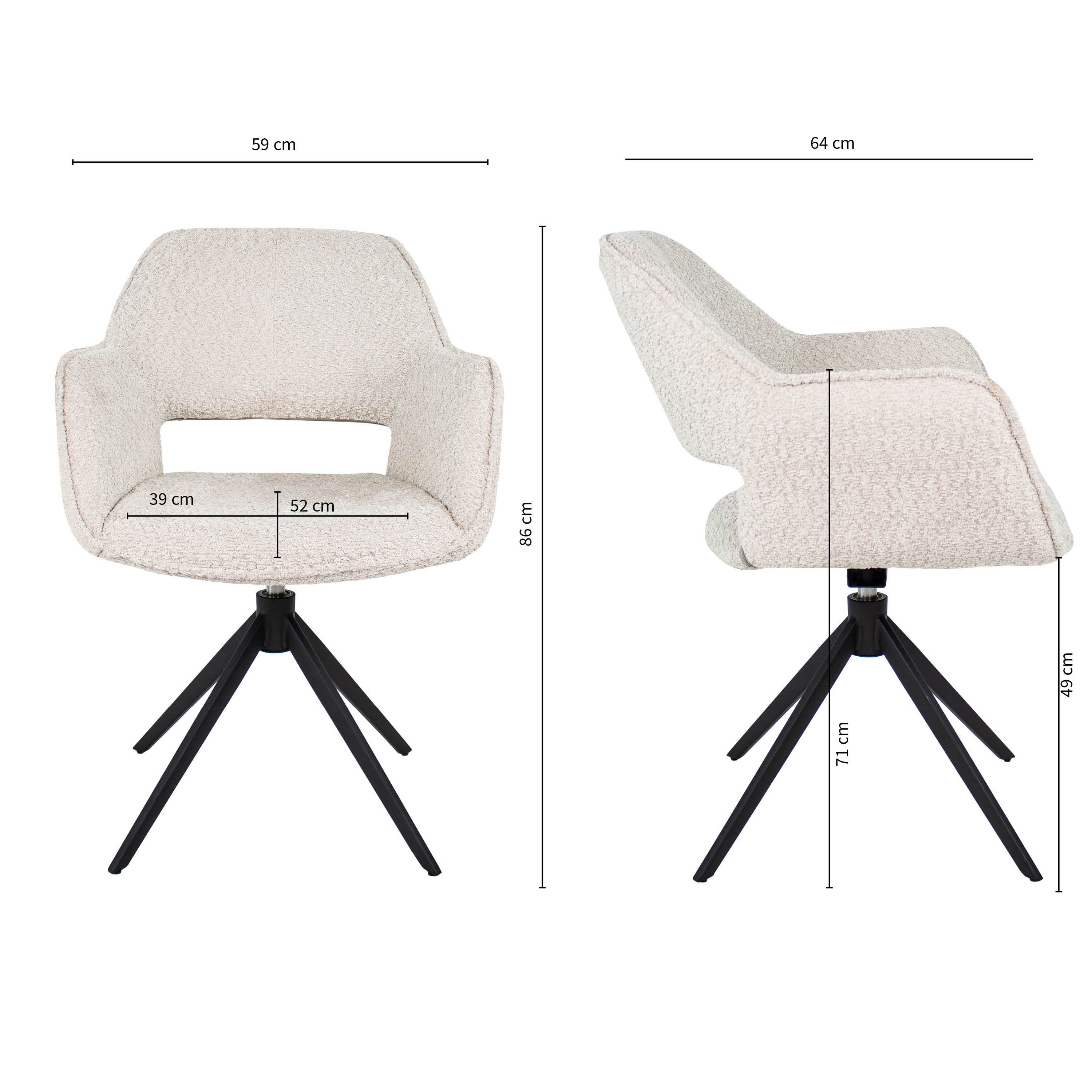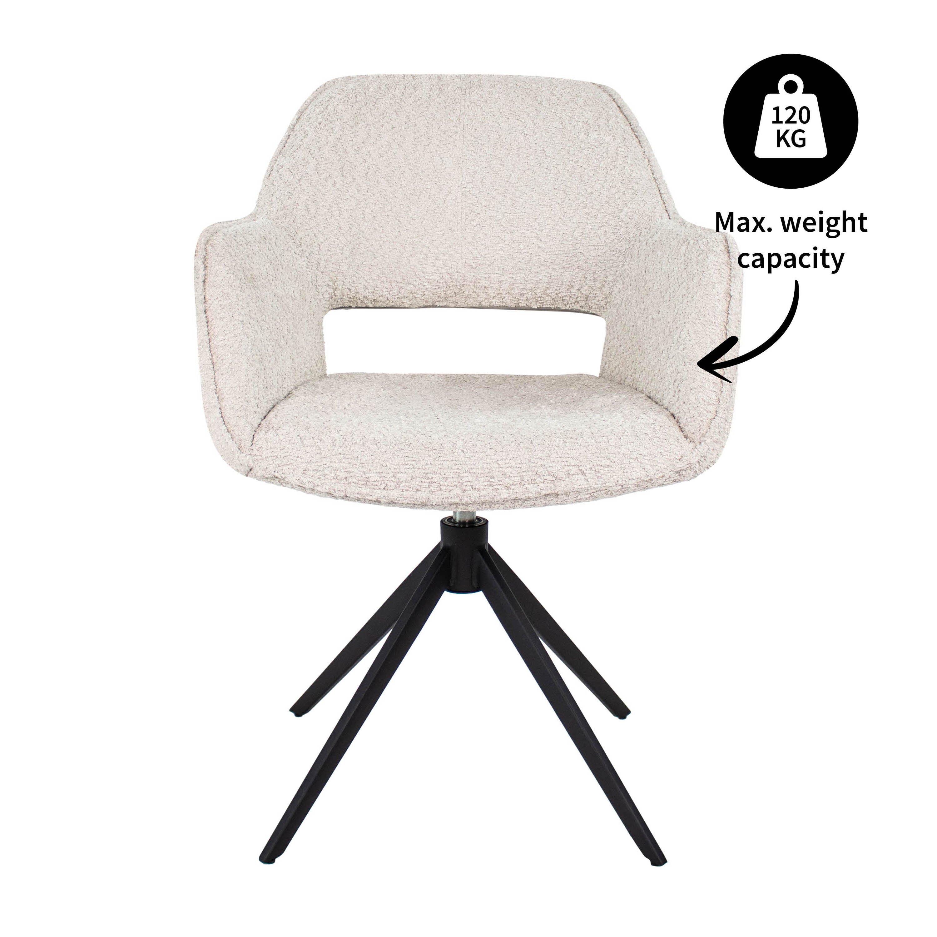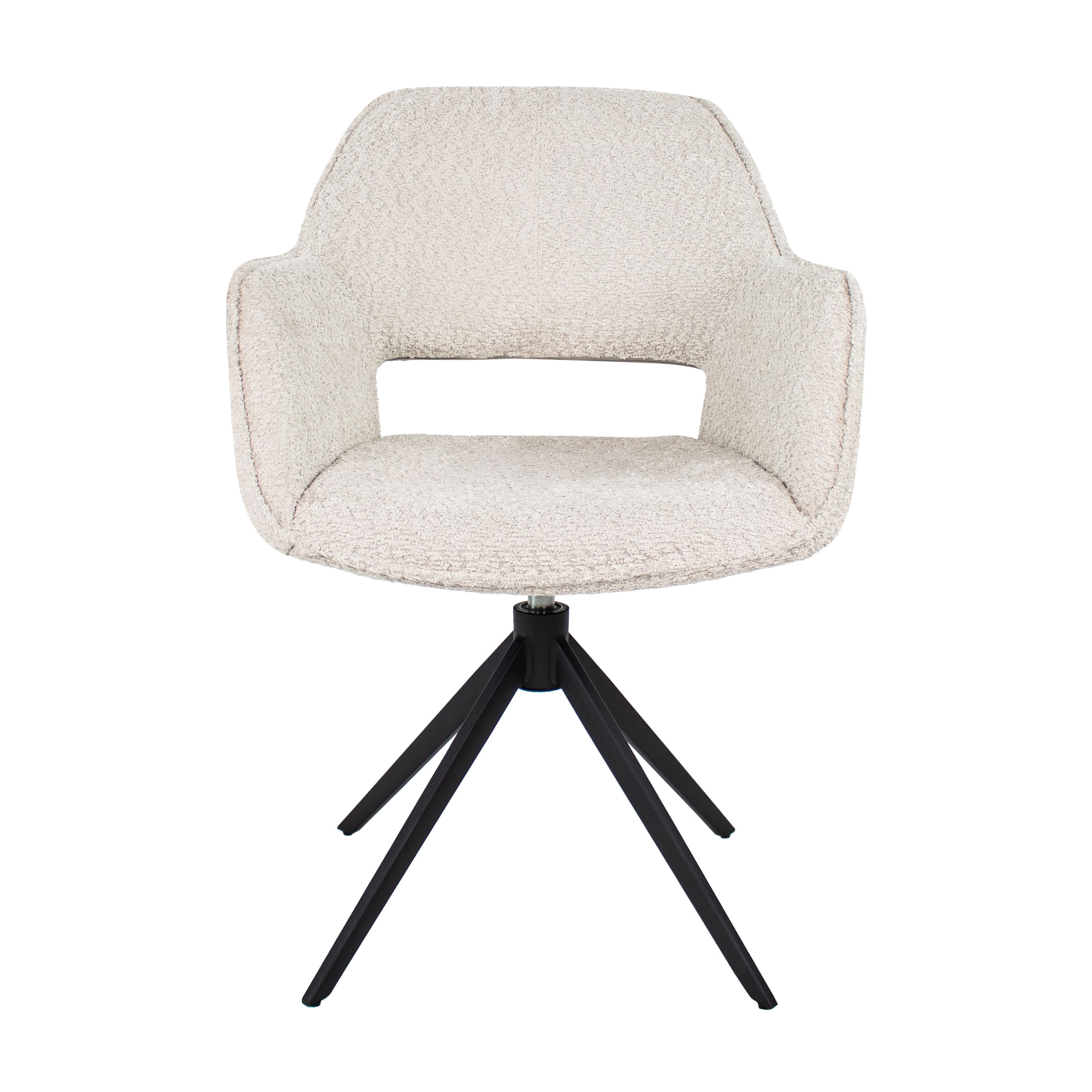 MEET OWEN! Draaistoel Owen is bekleed met een mooie zachte bouclé stof, kenmerkt zich met een fijne armleuning en heeft een opening in de rugleuning.