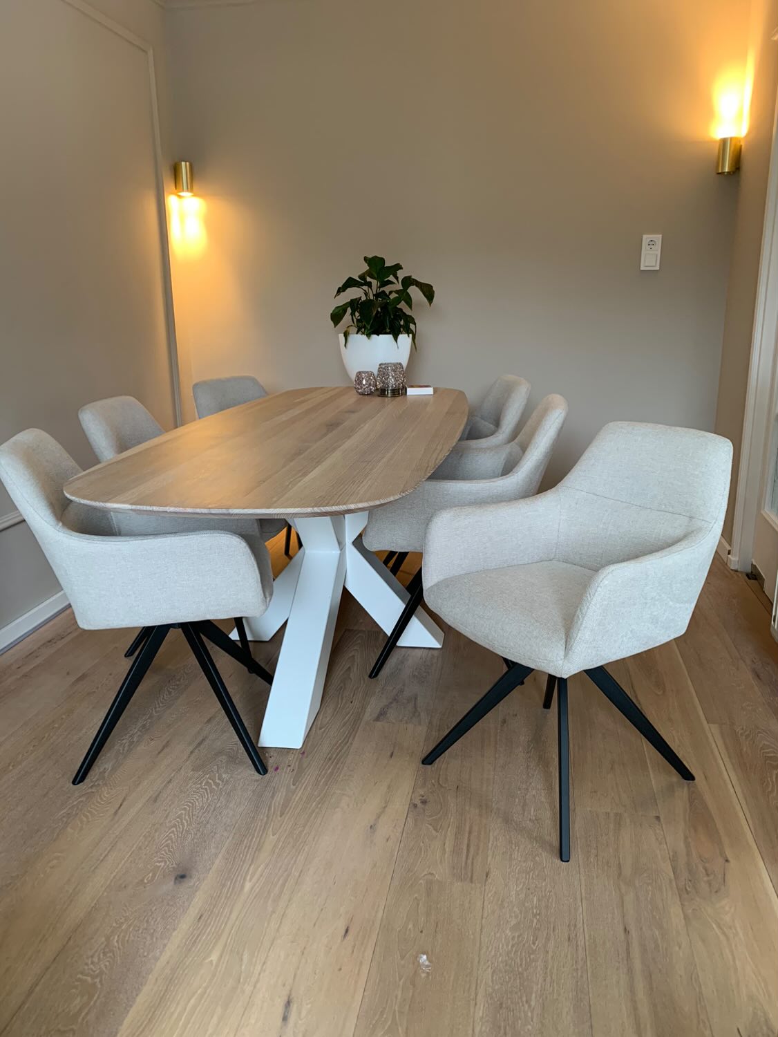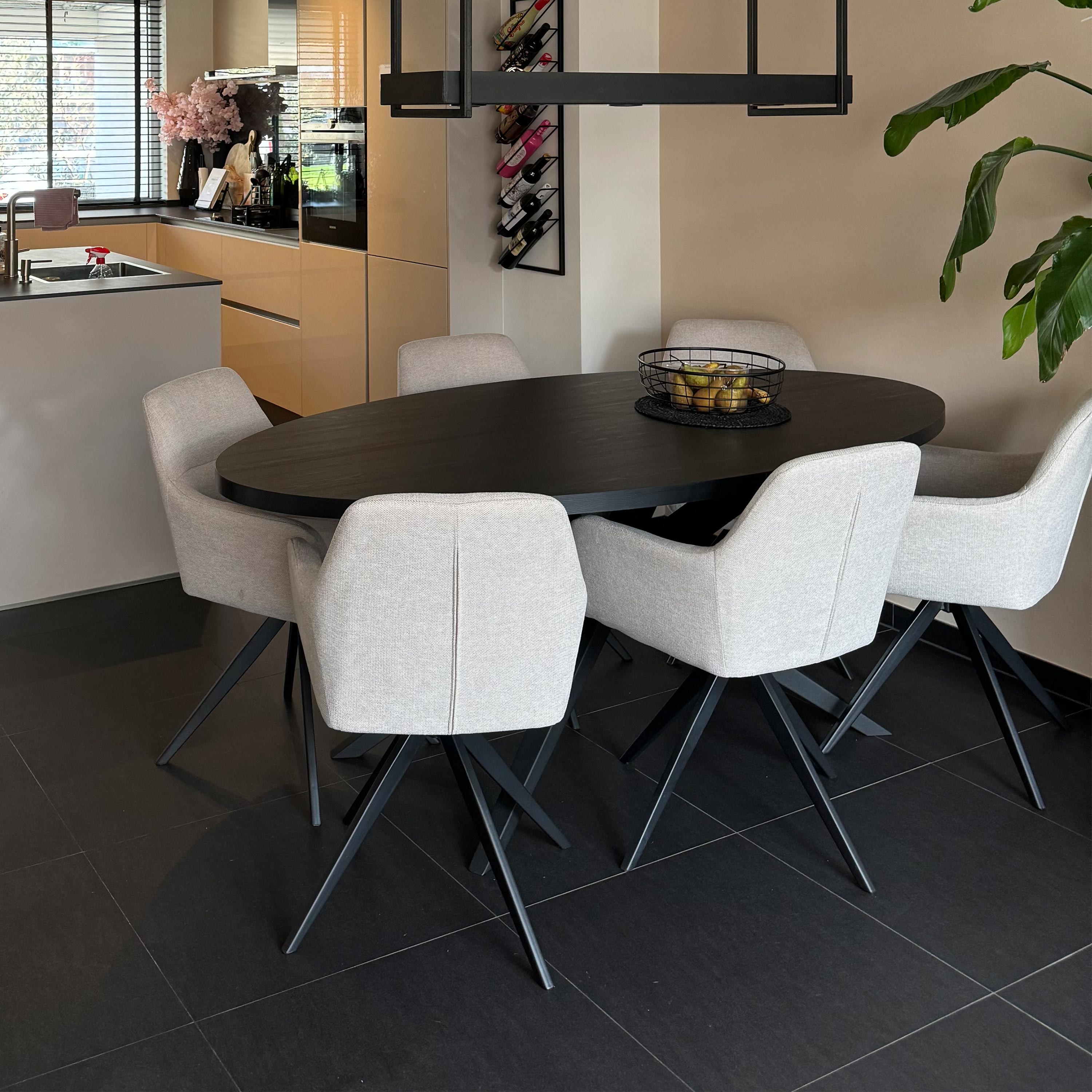 Tom, een symbool van elegantie en verfijning. Gehuld in onze favoriete gemêleerde textuurstof en met een zwart metalen onderstel dat je 360 graden vrijheid geeft om te draaien.
