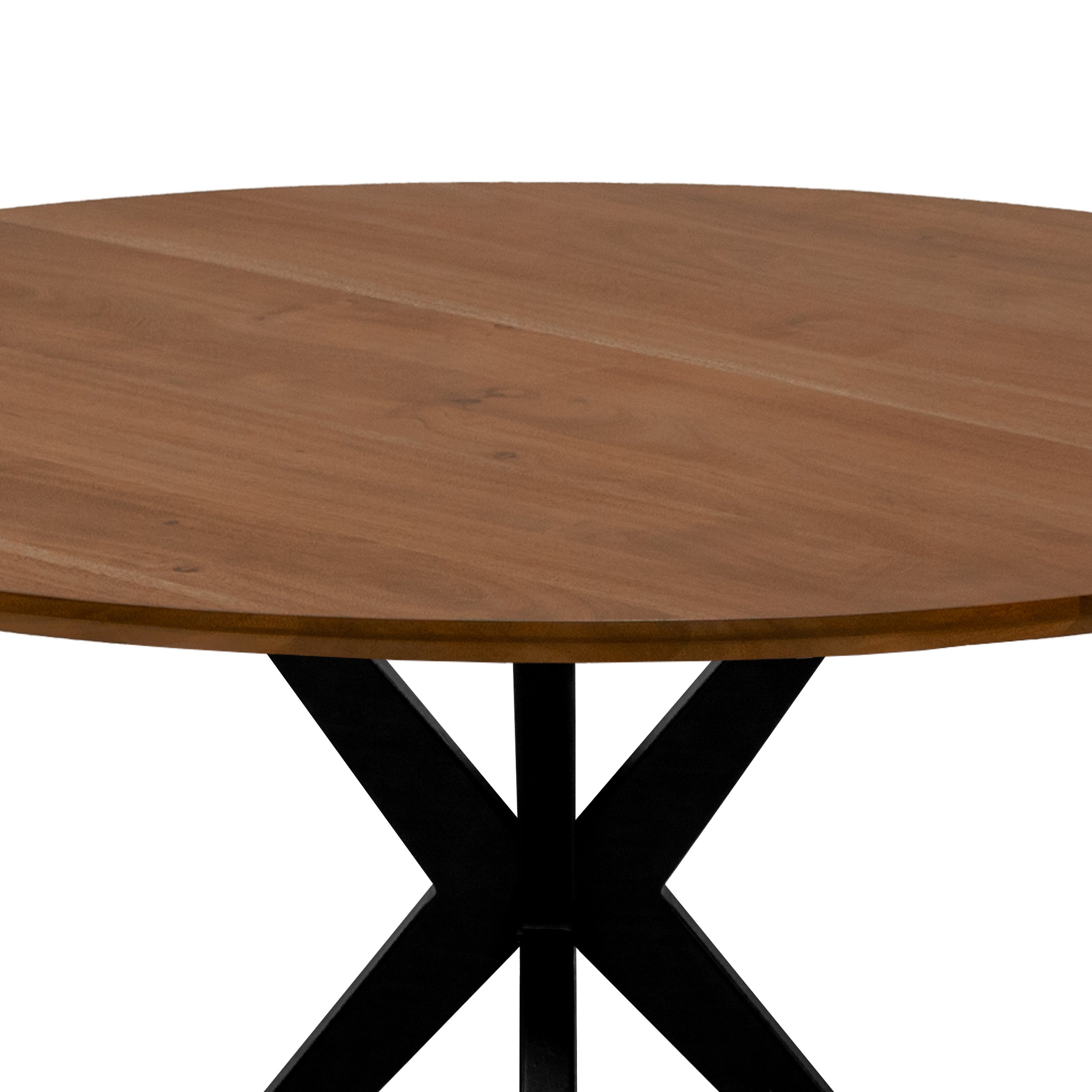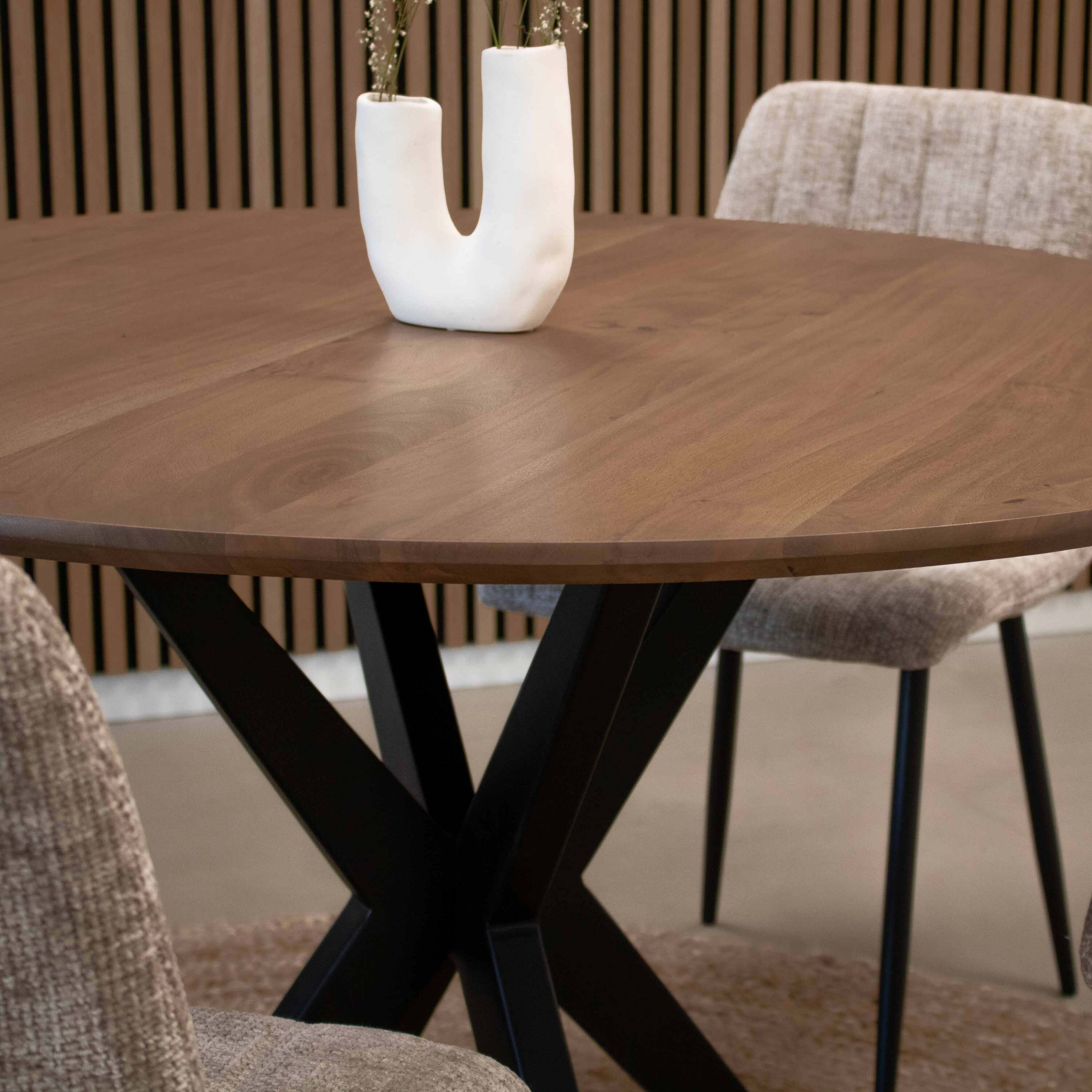 Meet Havard, functioneel en stijlvol in één. Deze ronde eettafel komt in diverse interieurstijlen perfect tot zijn recht. Het tafelblad is gemaakt van duurzaam acaciahout afgewerkt met een laklaag en rust op een stevig, zwart metalen X-frame.