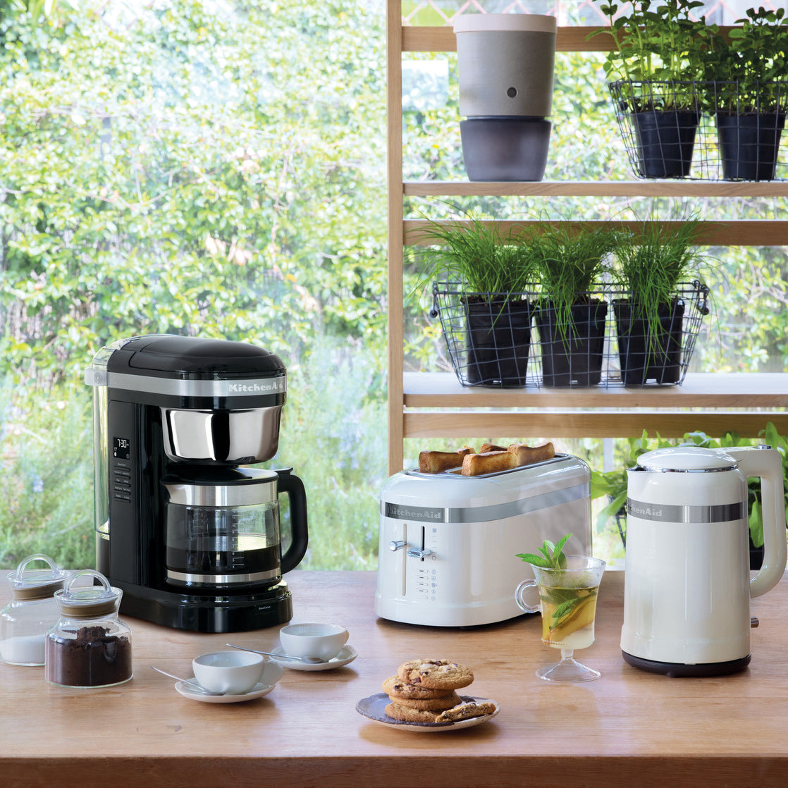 In de koffiekan passen twaalf kopjes koffie. Maar als je wat minder koppen koffie zet dan past de KitchenAid zichzelf automatisch aan. Bij één tot vier kopjes zorgen kleine wijzigingen in de verwarmings- en verzadigingstijd voor een heerlijke koffie in kleine hoeveelheid.