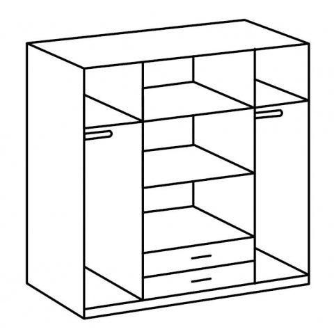 In het midden van kledingkast Gameren bevindt zich een breed kastelement met dubbele deuren en een spiegel. In dit brede gedeelte zijn standaard 2 planken aanwezig. Onderin bevinden zich 2 brede lades, ideaal voor sokken en ondergoed. Aan beide zijden van het brede element bevindt zich een smal kastelement. Beide smalle elementen hebben een plank en een roede. Goed om te weten: