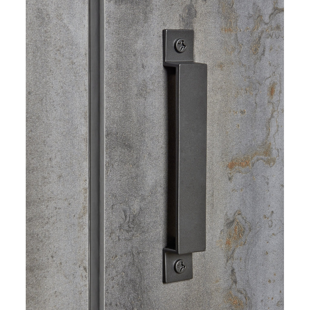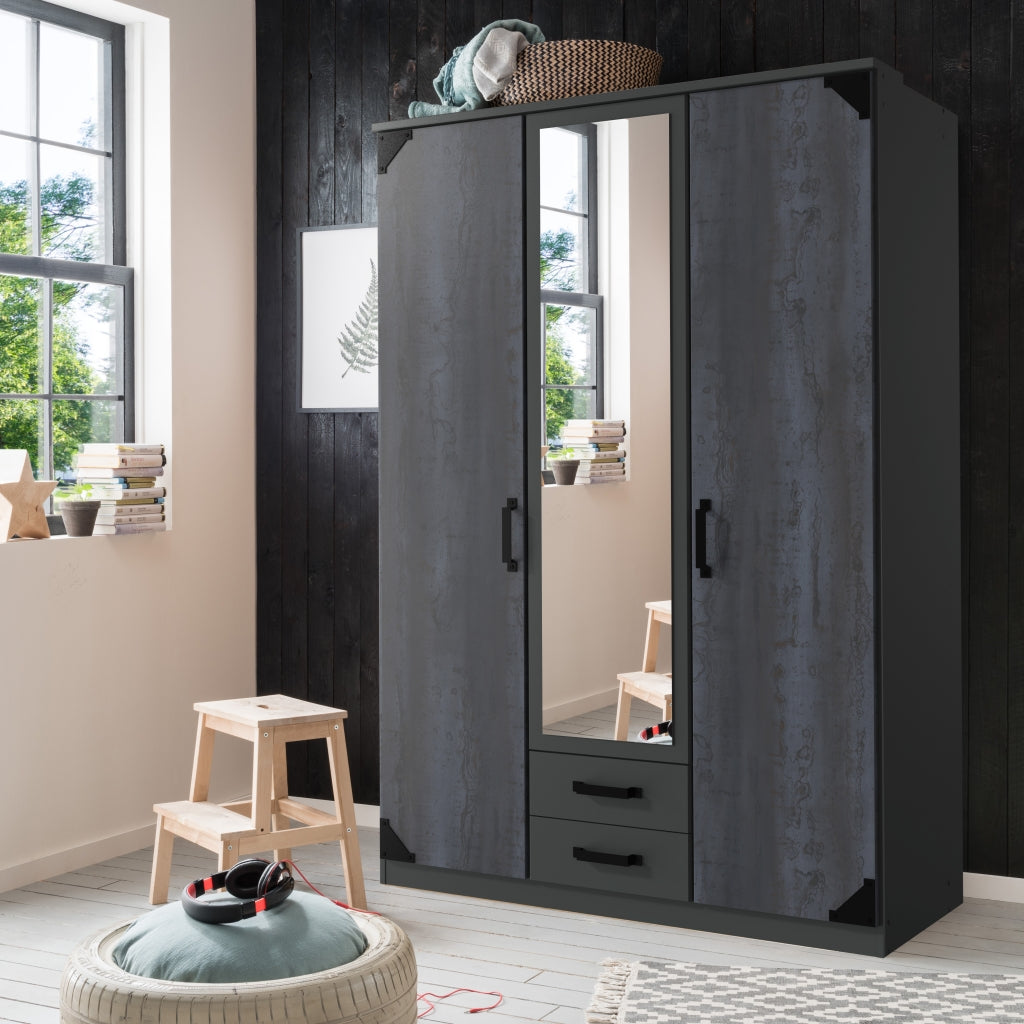 Kledingkast Gameren is een prachtige draaideurkast met een unieke en stoere uitstraling. De kast heeft een donkergrijze stalen look met robuust beslag en zwarte grepen. Naast het mooie uiterlijk heeft Gameren ook handige lades en een praktische spiegel. De spiegel is niet alleen om jezelf te bewonderen, maar zorgt ook voor een ruimtelijk effect in de kamer. Deze kledingkast is perfect voor een modern interieur. Indeling: