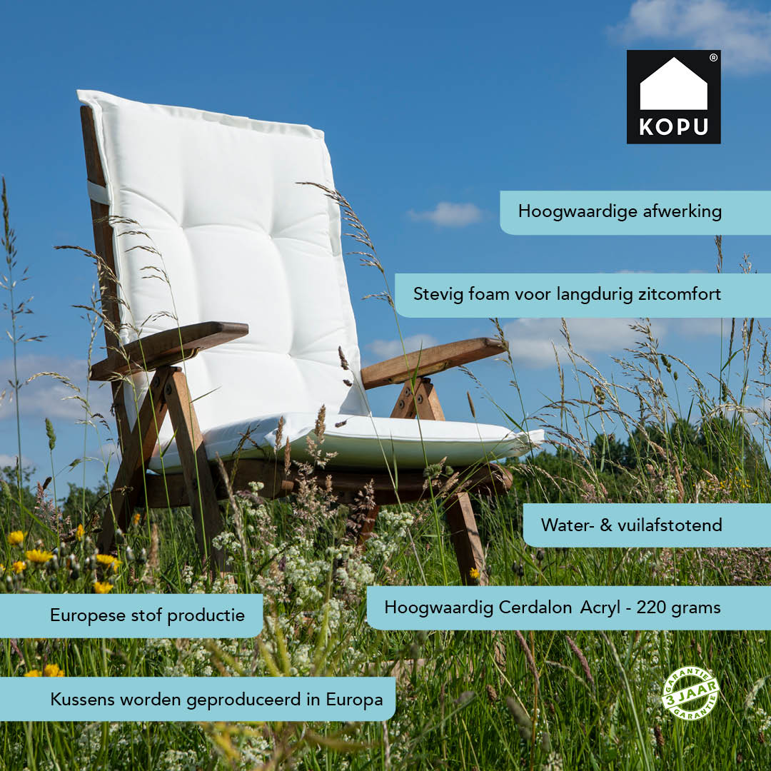 Kopu tuinkussens zijn gemaakt van de stof Cerdalon® in combinatie met een comfortabel schuim. De combinatie van dit schuim met deze Cerdalon® stoffen is uniek in 'tuinkussenland'; stevig en duurzaam.