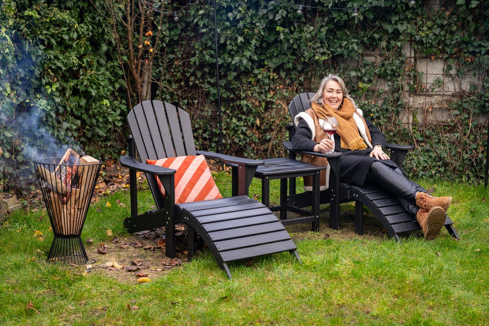 Inmiddels zie je de stoel overal terugkomen; van het strand op Ibiza tot op de veranda van een houten blokhut in Canada. Na lang testen is het ons gelukt om de zo kenmerkende ergonomische rondingen en brede armleuningen uit hout te reproduceren in onderhoudsarm zwart kunststof. Hiermee durven we gerust te stellen dat onze tuinstoel Montreal de meest originele en comfortabele kunststof adirondackchair van dit moment is! Waarom worden wij zo blij van onze zwarte kunststof Adirondack stoelen? - Ergonomisch ronde rugleuning en zitvlak - Brede armleuningen -sdfOnderhoudsarm gecertificeerd gerecycledsdfHDPE met RVS schroeven - Bijpassend voetenbankje, kussen en sidetable leverbaar - Prachtige houtnerf in het kunststof voor een echte houtlook Tip van ons: Bescherm je stoel door hem af te dekken met onze speciaal gemaakte beschermhoes. Naast bescherming blijft je Adirondack stoel vrij van blad, vogelpoep, takken en groene aanslag. Daarnaast helpt het om de stoel af en toe schoon te maken met kunststof reiniger.