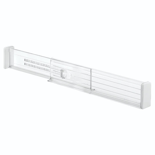 Wie zijn lade zo efficiënt en georganiseerd mogelijk wilt opruimen en indelen kan hier wel een goed hulpmiddel bij gebruiken. De Linus ladeverdeler van iDesign is dan precies wat je nodig hebt. Met het uitschuifbare ontwerp maak je de ladeverdelers precies passend aan het formaat van jouw lade. Of dit nu een keukenlade, kledingkast lade of badkamerlade is. De 2 ladeverdelers hebben ieder een afmeting van 6.5 x 34.5 x 3 cm en zijn verstelbaar van 34.5 cm tot 52.5 cm. Met het speciale lock clipje kun je de gewenste maat eenvoudig vergrendelen zodat de verdeler stevig op zijn plek blijft zitten. Het transparante kunststof kan eventueel gemakkelijk worden schoongemaakt met een vochtige doek.