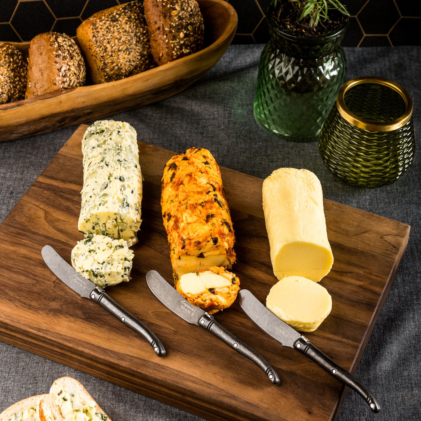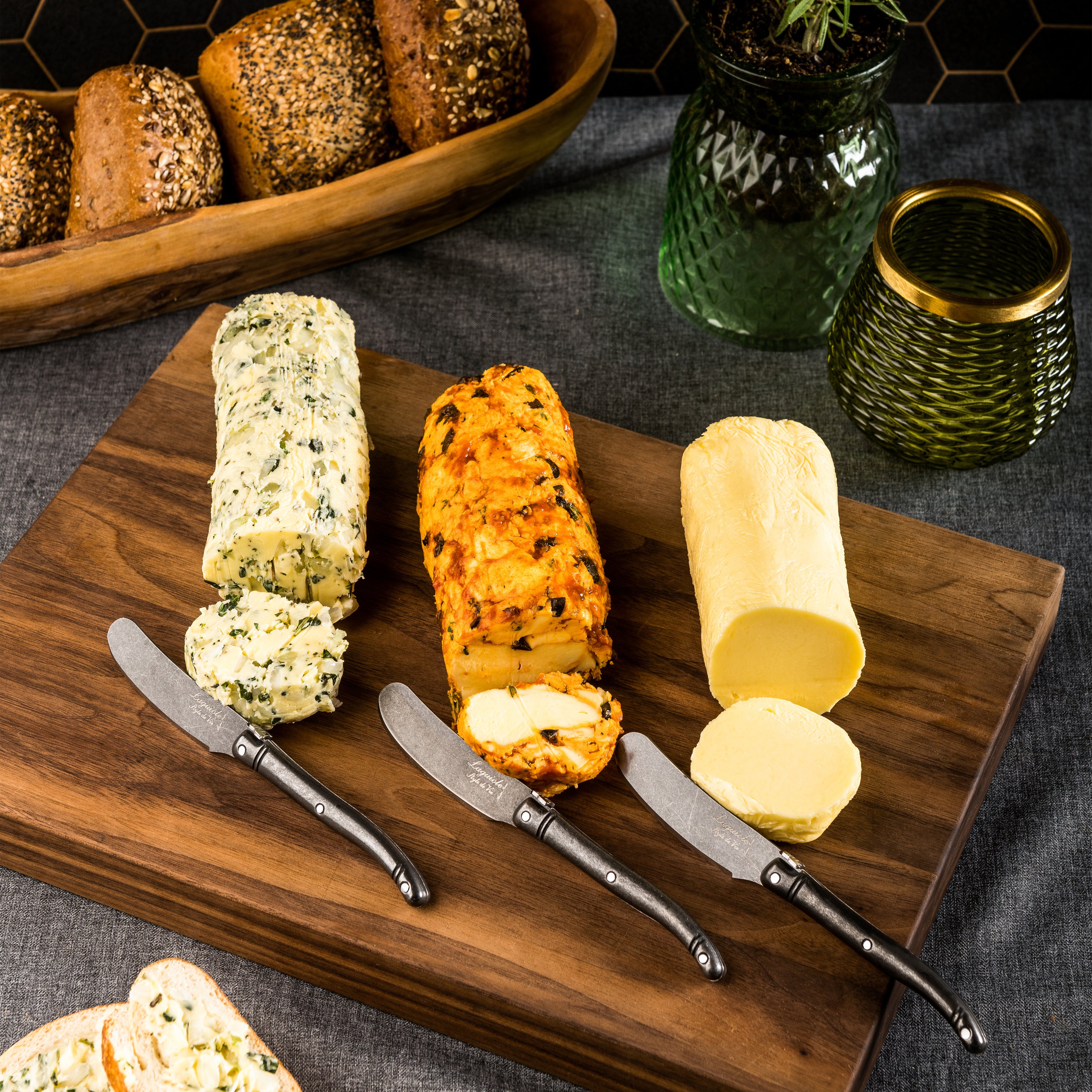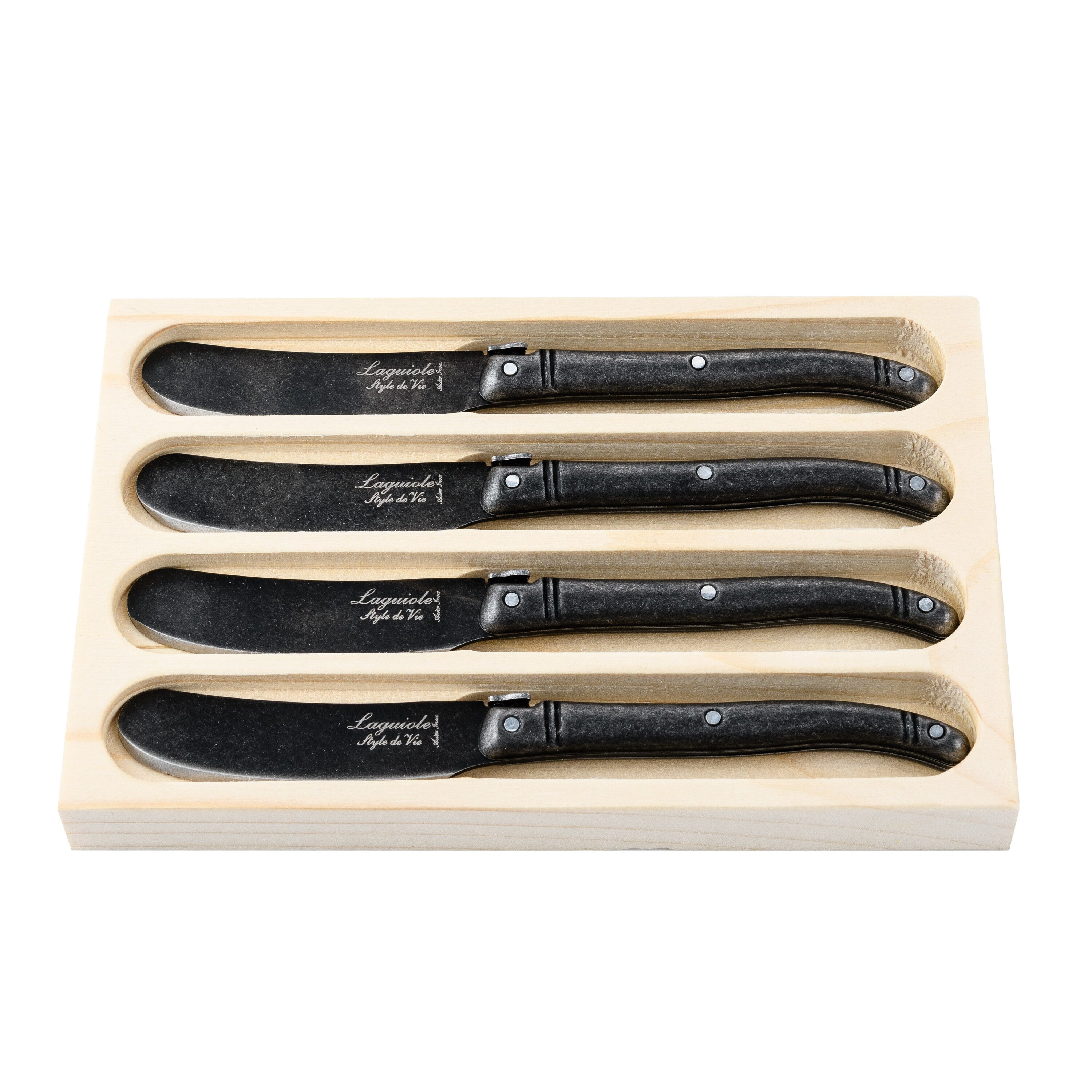 Laguiole Style de Vie Botermessenset Je kaasplankje of tray vol hapjes is pas compleet met deze luxe botermesjes. Deze botermessenset van Laguiole Style de Vie bestaat uit vier luxe botermessen. De messen worden geleverd in een handig houten kistje en hebben allemaal een glad lemmet met een dikte van 1,2 mm. De botermessen zijn vaatwasmachinebestendig.