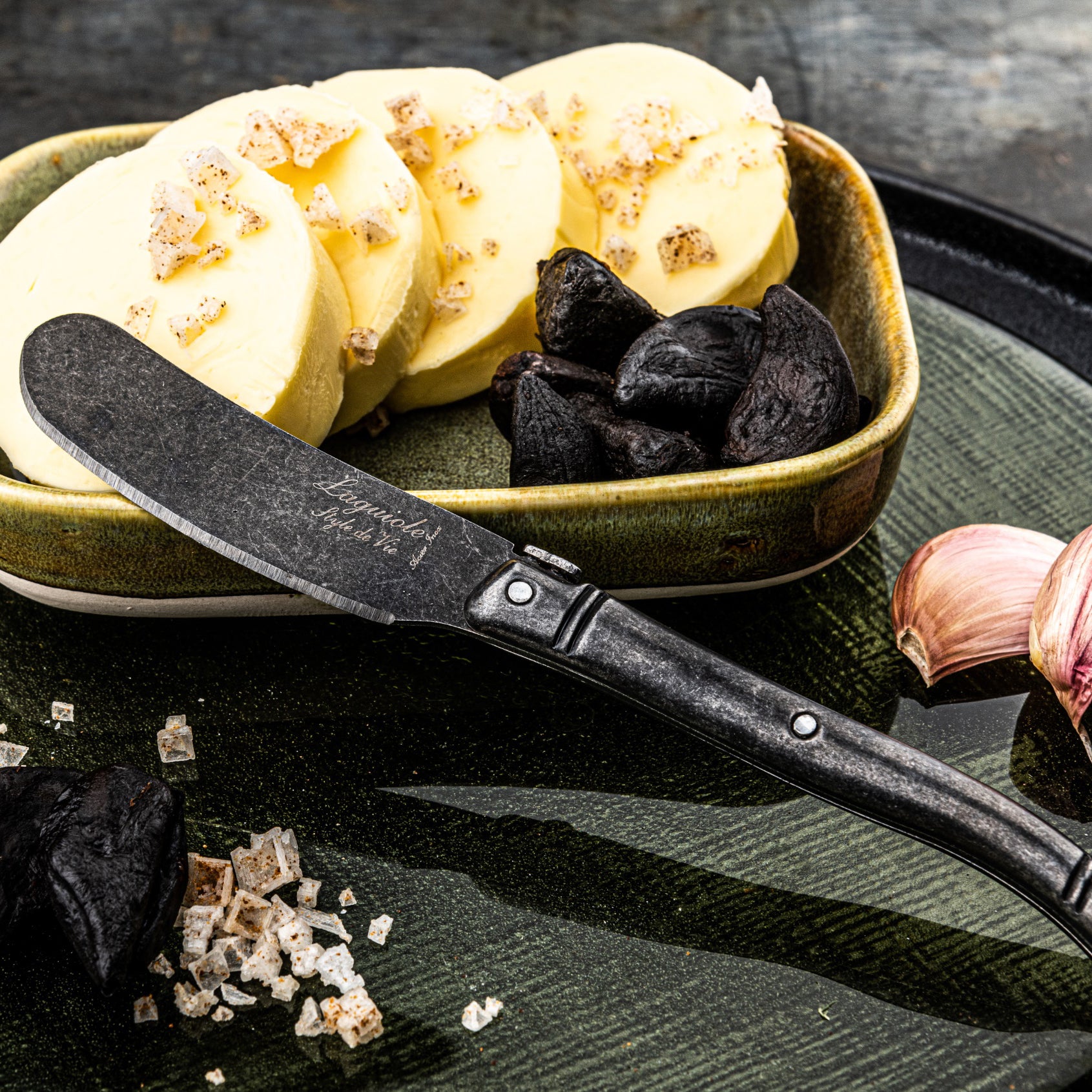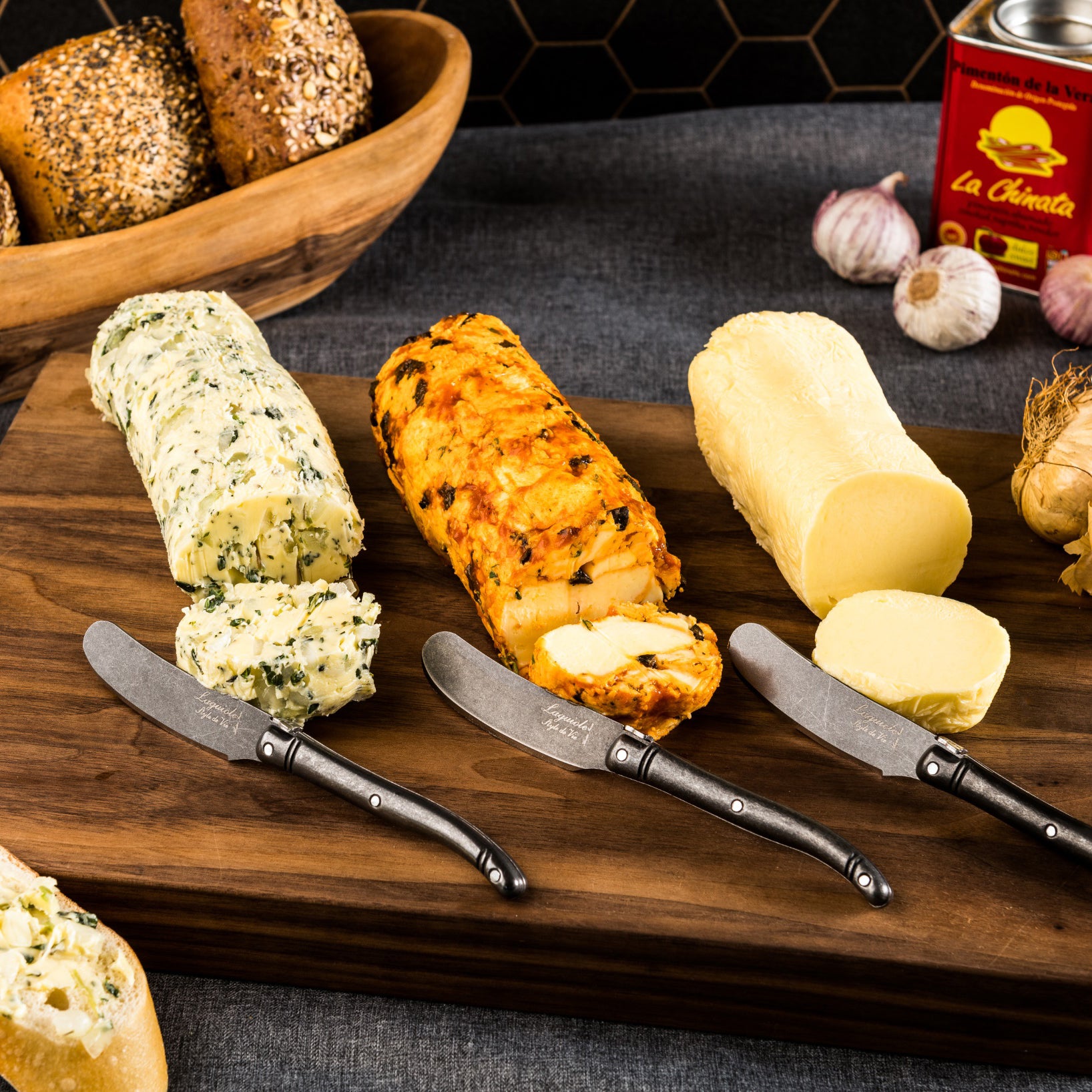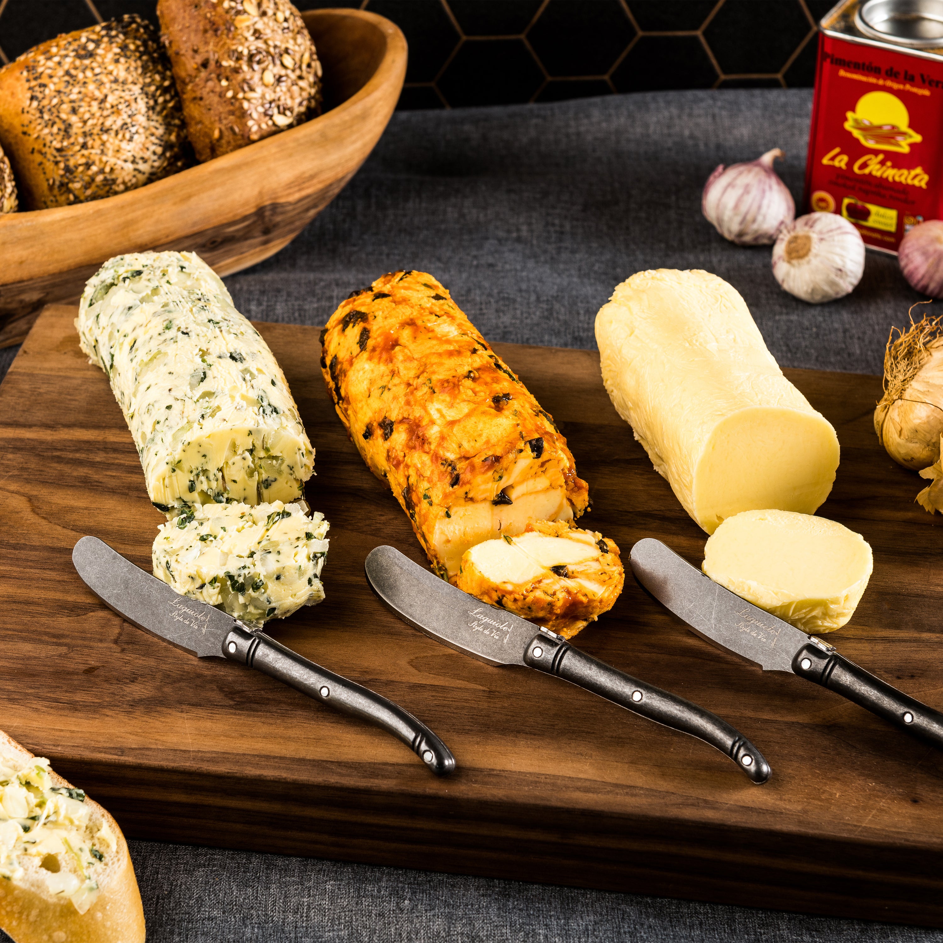 Laguiole Style de Vie Botermessenset Je kaasplankje of tray vol hapjes is pas compleet met deze luxe botermesjes. Deze botermessenset van Laguiole Style de Vie bestaat uit vier luxe botermessen. De messen worden geleverd in een handig houten kistje en hebben allemaal een glad lemmet met een dikte van 1,2 mm. De botermessen zijn vaatwasmachinebestendig.