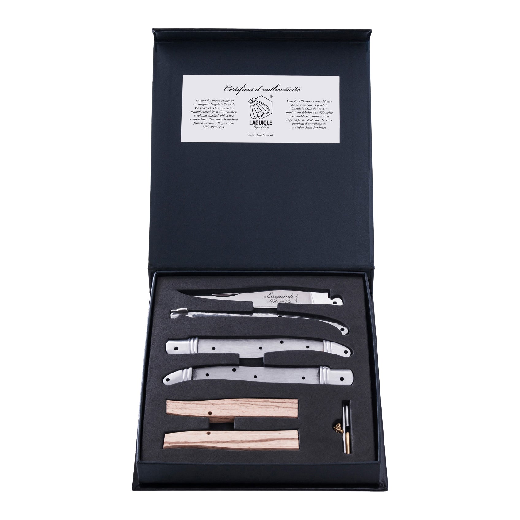 Materialen van het Laguiole zakmes Het Style de Vie Laguiole zakmes heeft een sterk lemmet van roestvrij staal en een doordacht handvat van zebranohout. Het scherpe lemmet van 10,5 cm maakt dit mes bijzonder fijn in gebruik. De set wordt geleverd inclusief echtheidscertificaat. Benieuwd geworden naar het zakmes bouwpakket? Bekijk dan hier de instructies.