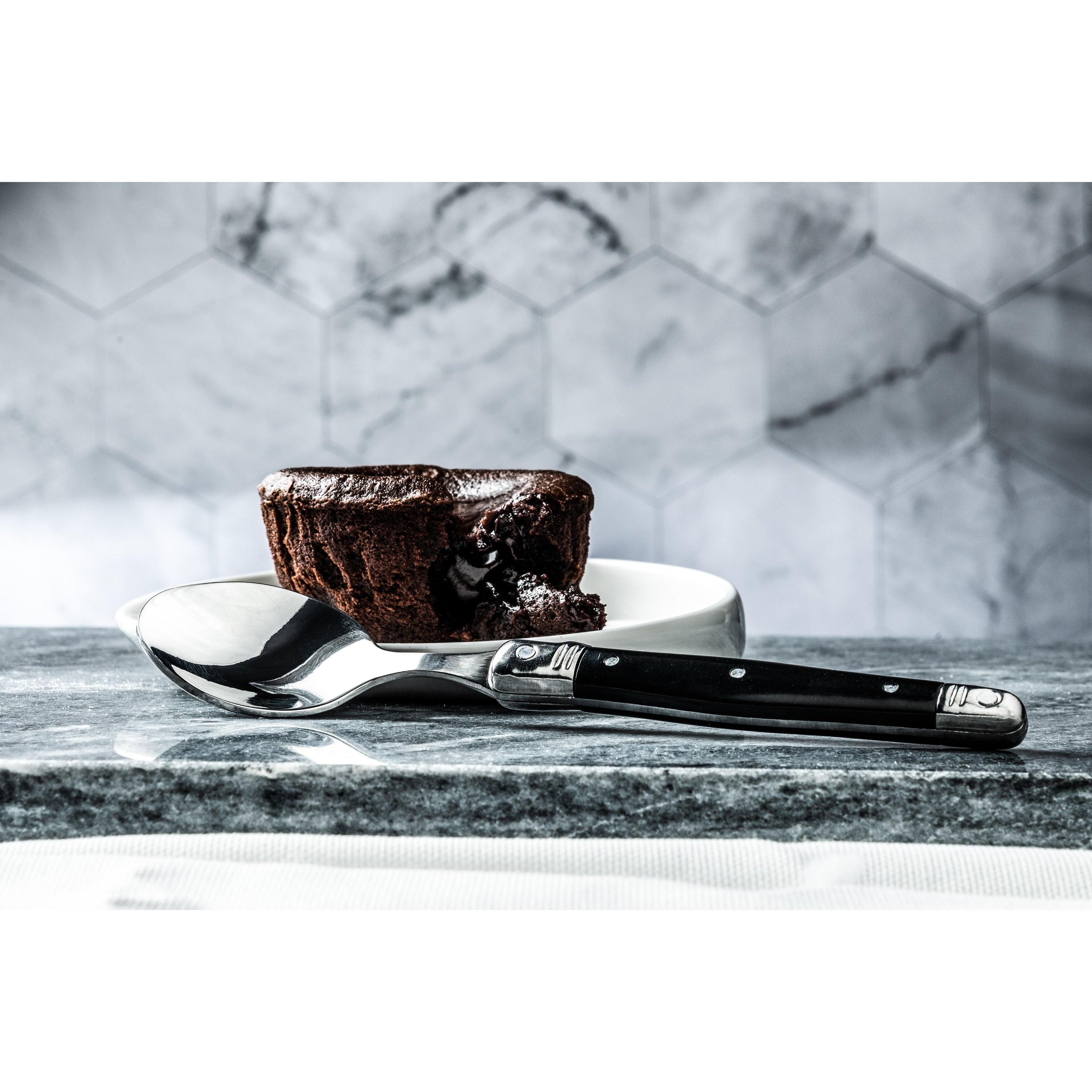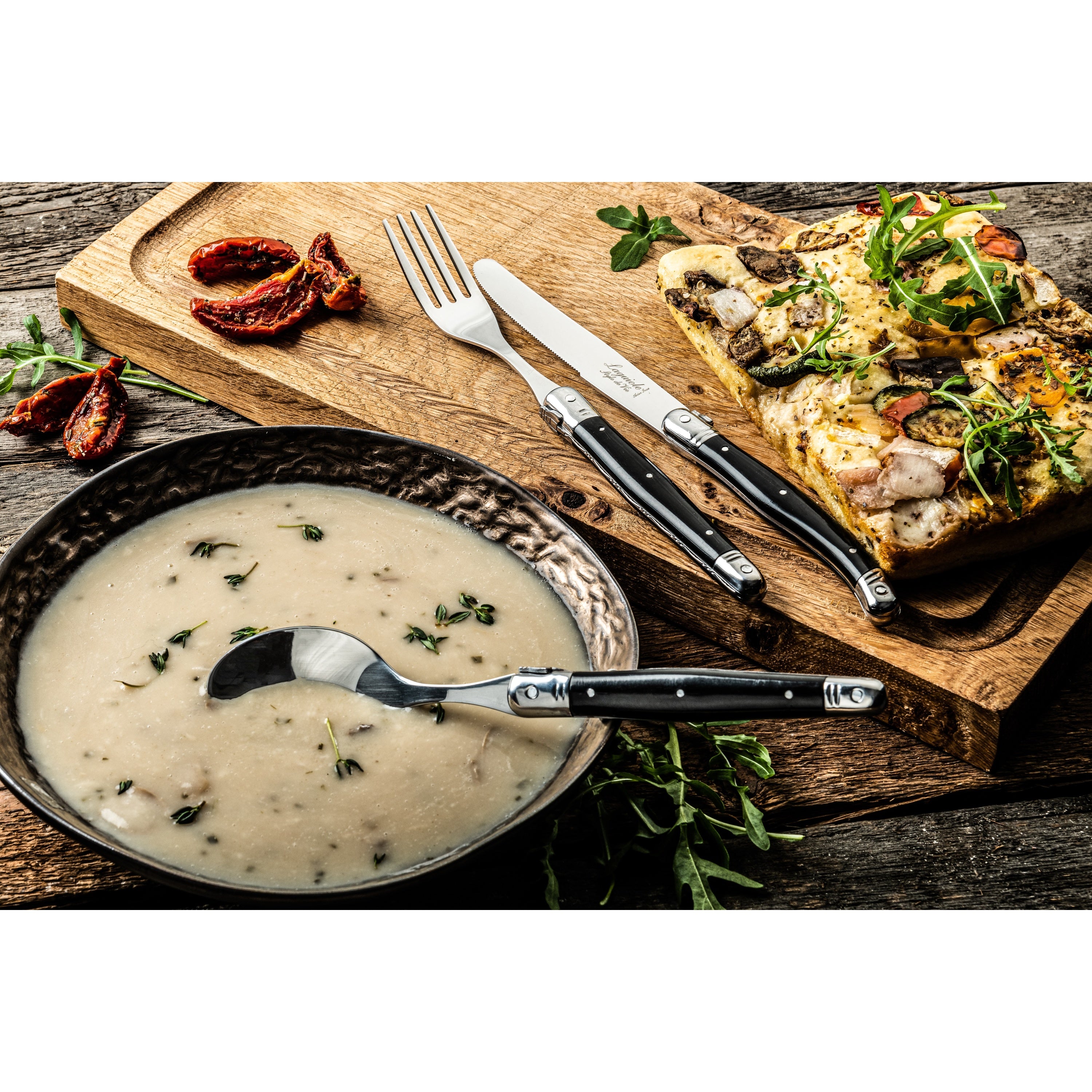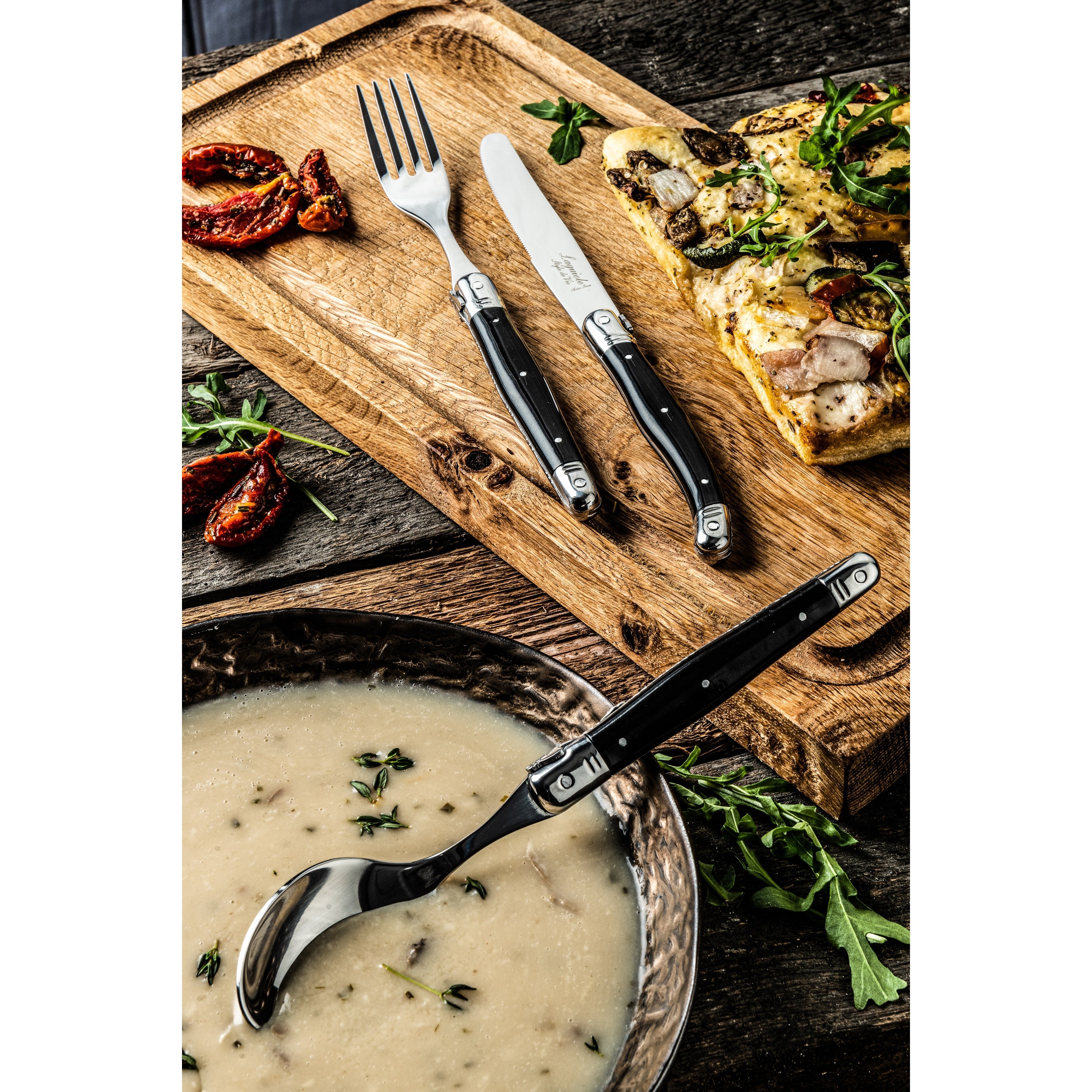 Laguiole Style de Vie Premium Line bestekset 6-personen zwart. Het bestek is gemaakt van roestvrij staal met kunststof handaten. De bestekset wordt geleverd in een nette houten kist en bestaat uit:- 6 tafelvorken- 6 tafelmessen- 6 tafellepels- 6 desertlepelsNa gebruik kan de couvertset worden gereinigd in de vaatwasser tot 55 graden.
