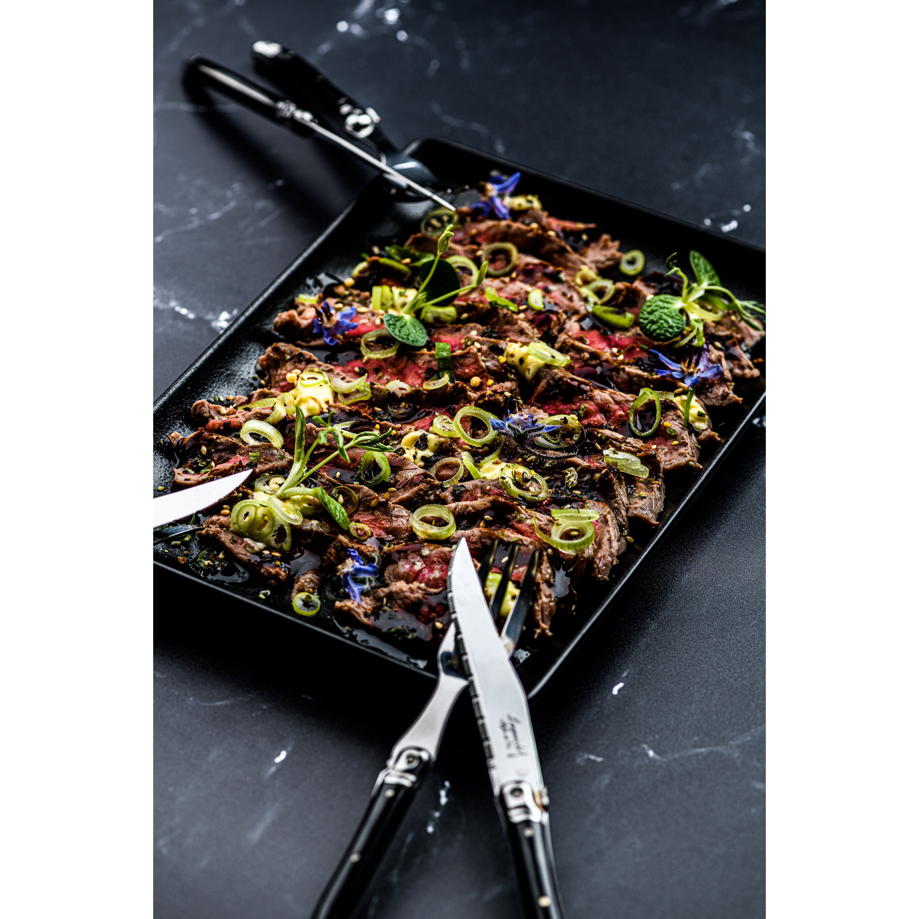 De mogelijkheden met de Laguiole Style de Vie Premium Line 12-delige mini bestekset zijn eindeloos. De bestekset bestaat uit 6 kleine vorken en steakmessen. Gemaakt van roestvrijstaal met een zwart kunststof handvat. Geleverd in houten bestekbak.