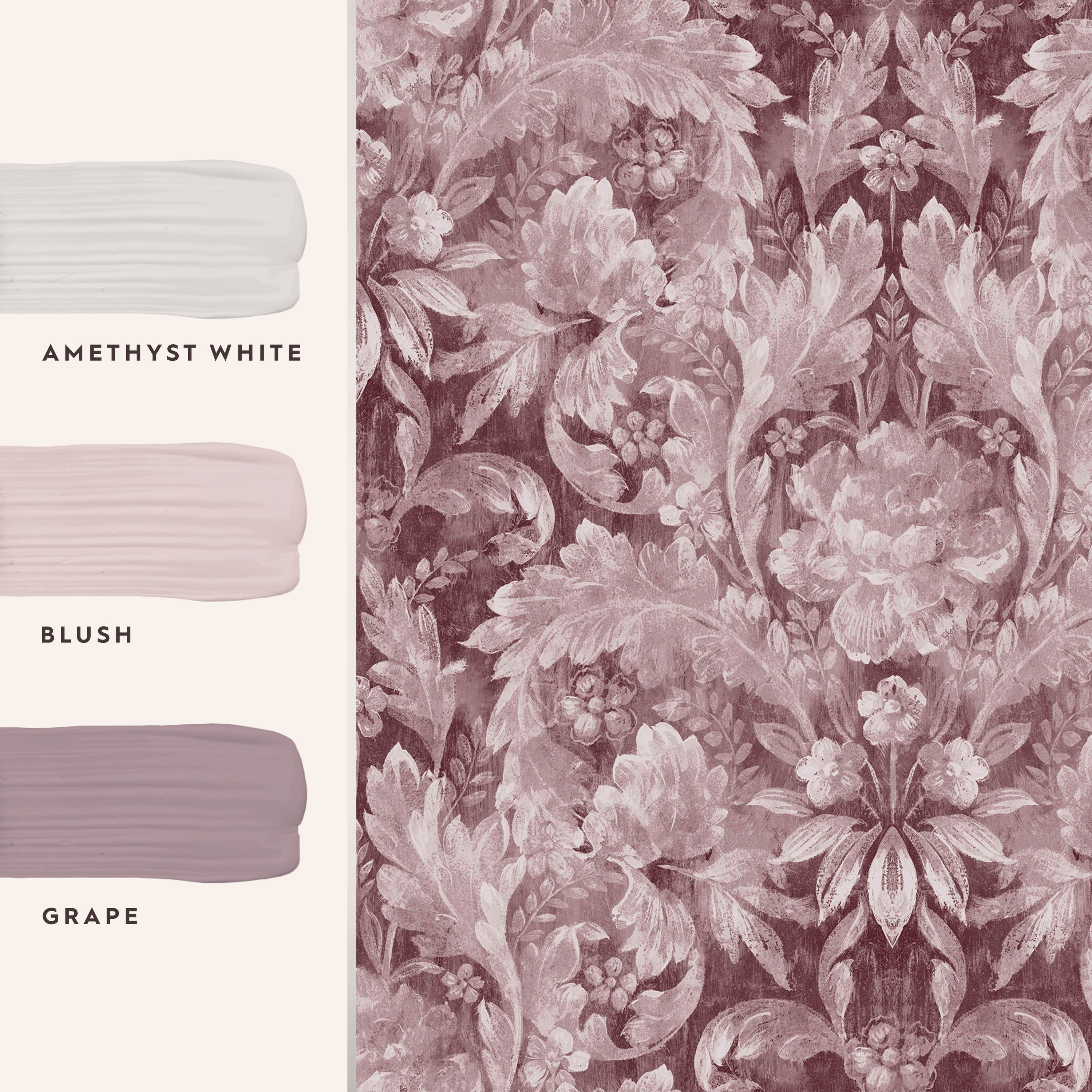 Tijdloos en elegant, deze sierlijke damastprint heeft krullende acanthus en bladeren die het ontwerp vormen rond primula, sleutelbloemplanten, rozen en pioenroos bloemhoofdjes.
