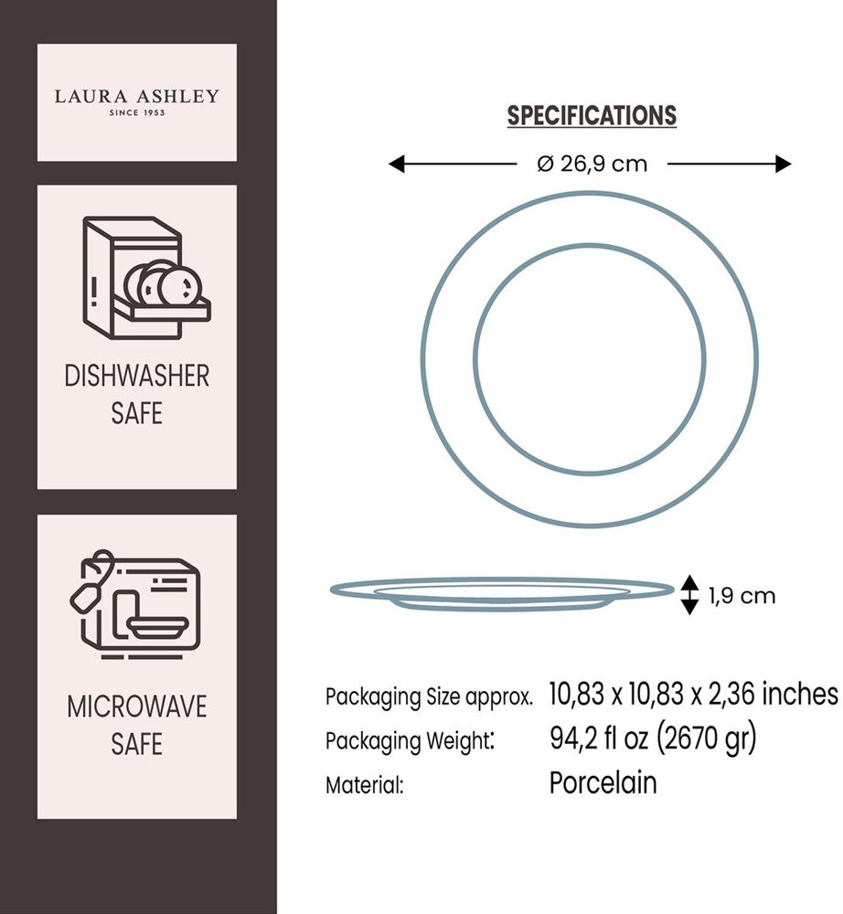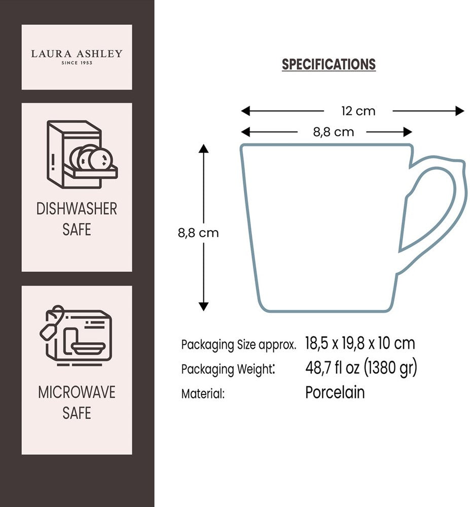 - Het servies van Laura Ashley is gemaakt van hoogwaardig New Bone China porselein.