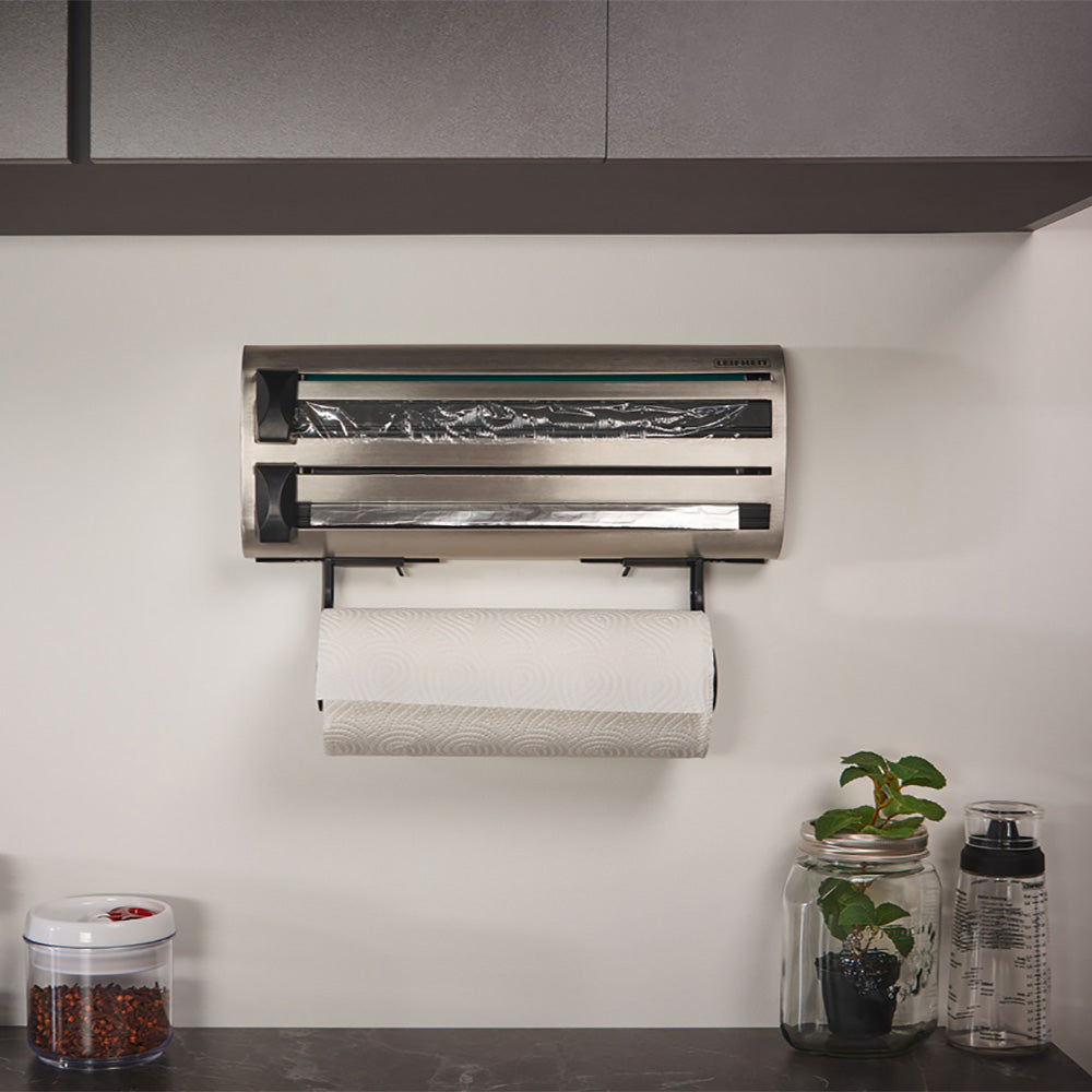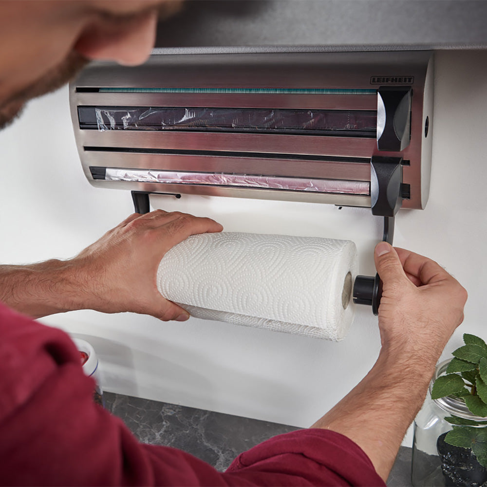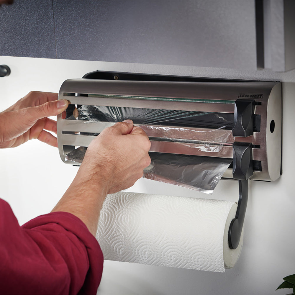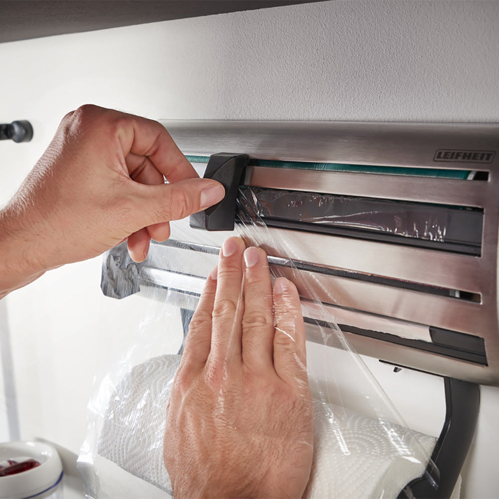 Leifheit Parat Royal rollenhouder Deze handige rollenhouder heeft plaats voor drie rollen: een keukenrol en een rol vershoud- en aluminiumfolie. De houder is geschikt voor alle algemeen verkrijgbare rollen. De rollenhouder is gemaakt van hoogwaardig RVS en is voorzien van twee zeer scherpe snijschuivers. Deze zorgen ervoor dat het folie nauwkeurig en schoon wordt gesneden. Voorzien van eenvoudige wandmontage!