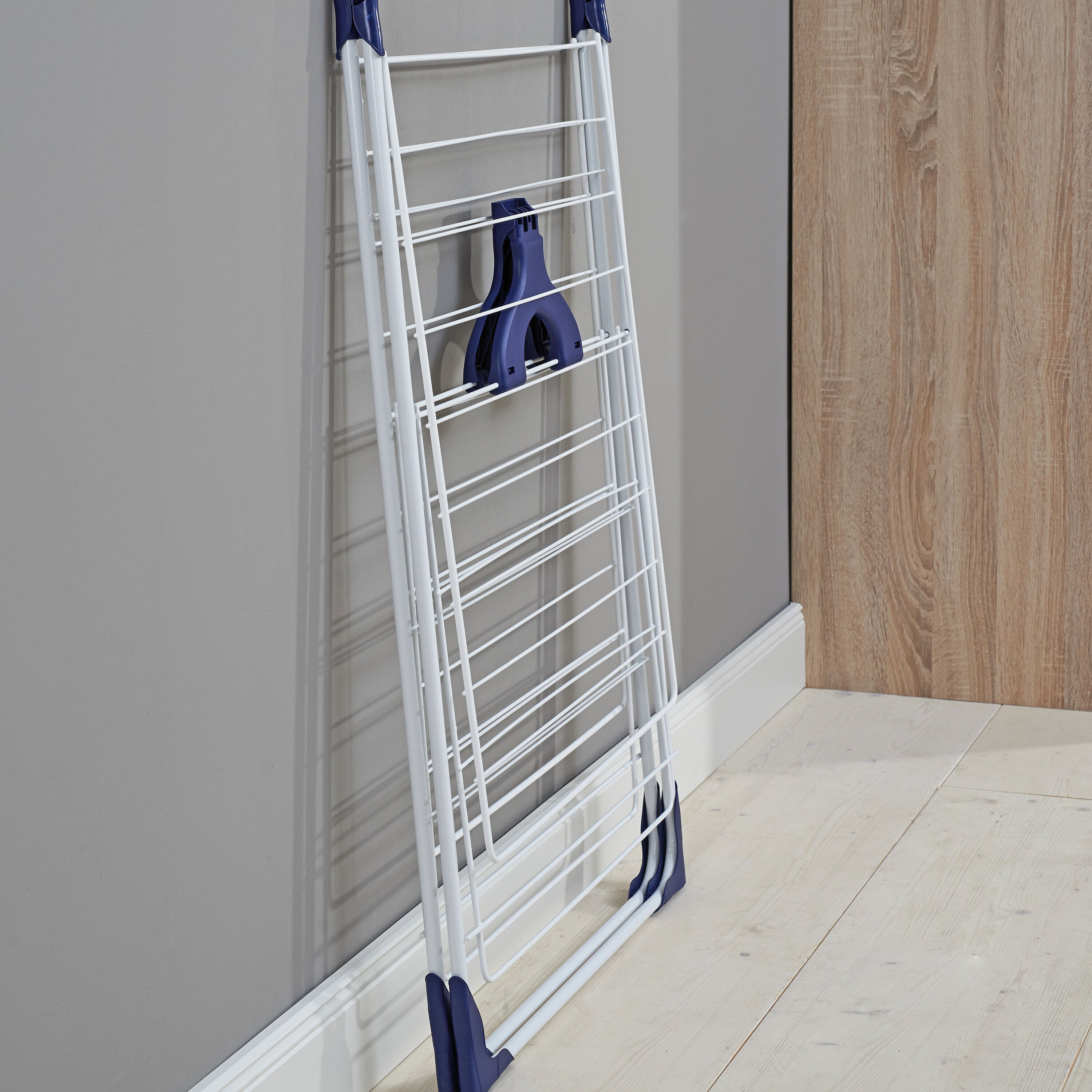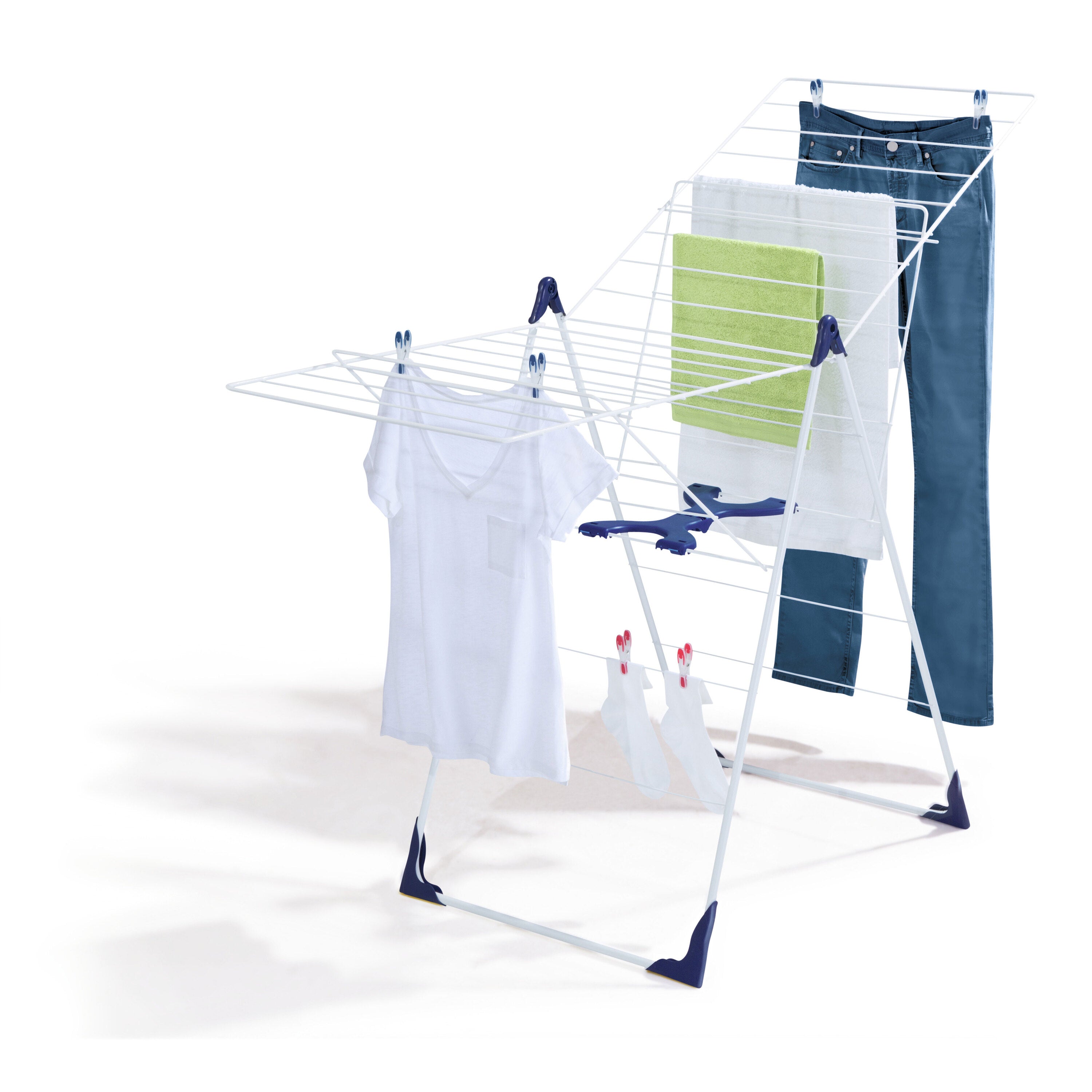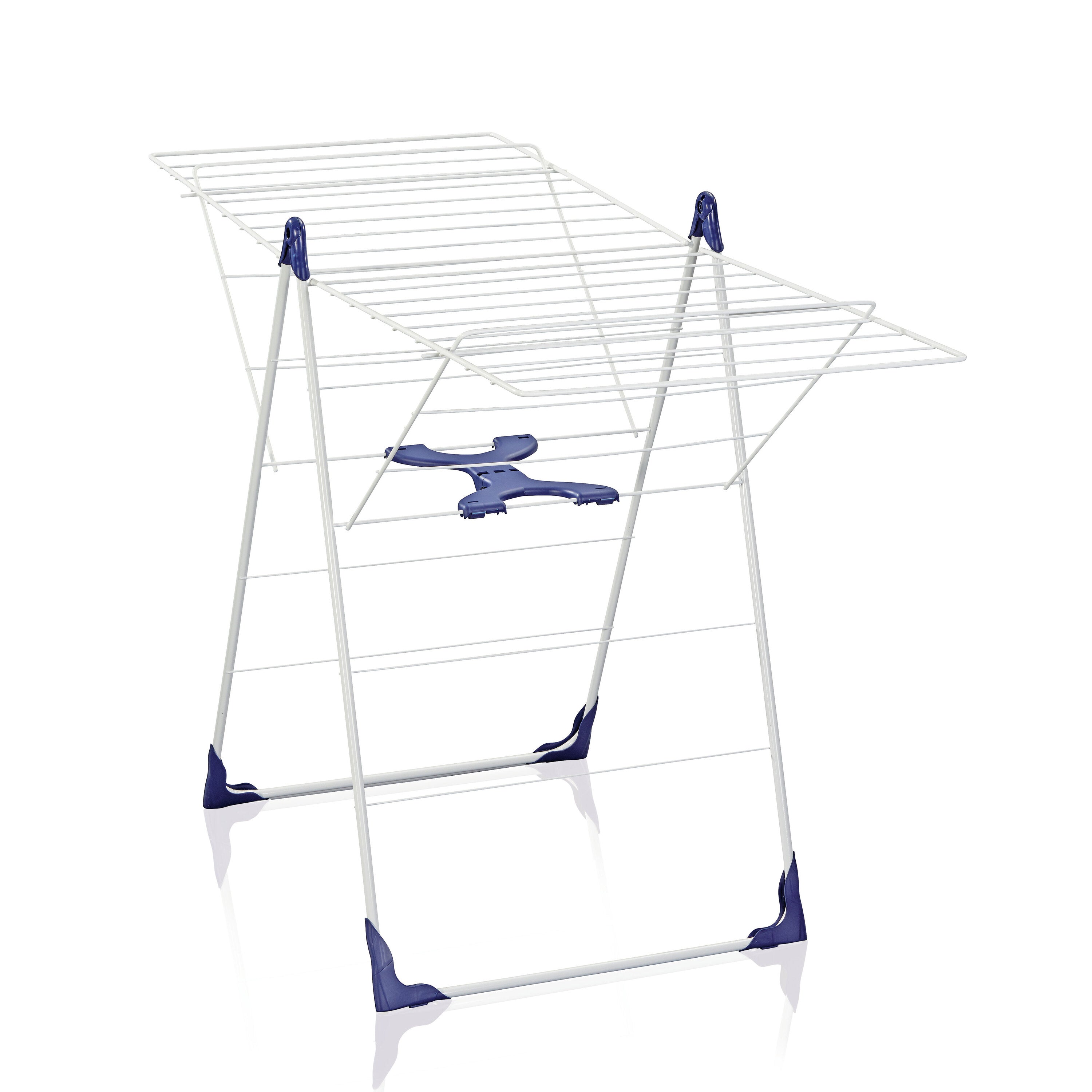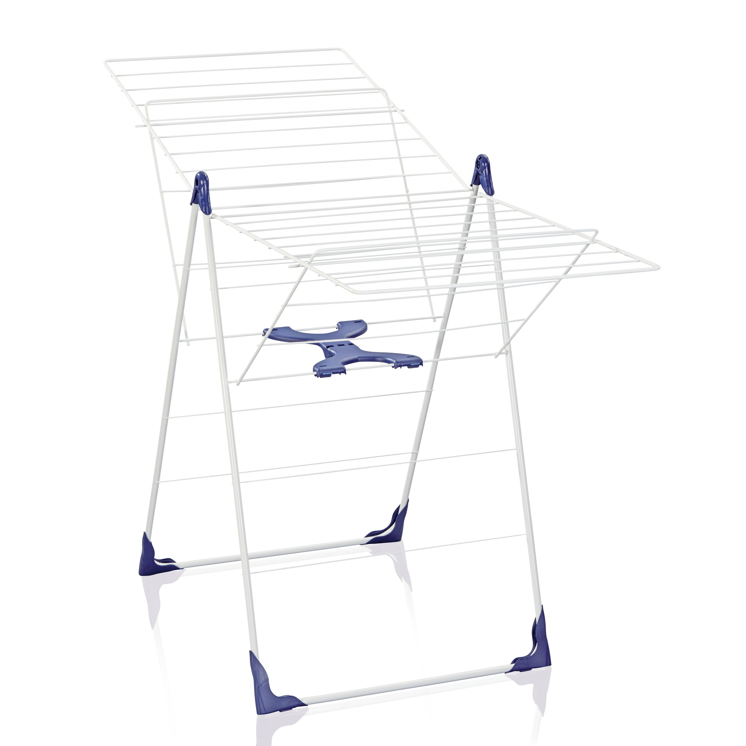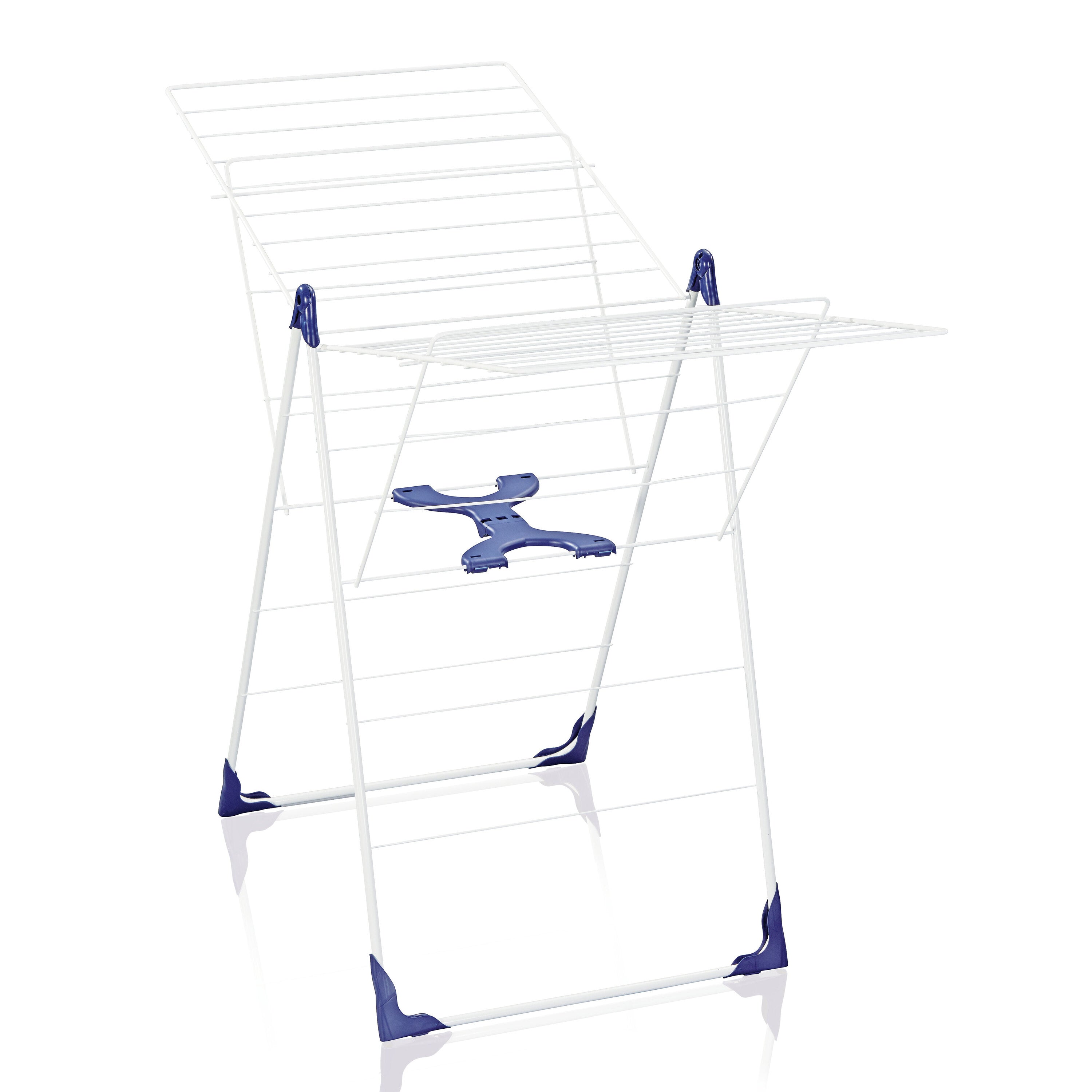 De blauwe X vouw je in elkaar waardoor het rek opengaat en direct een stabiele houding aanneemt. Verstel de droogvleugels op een rechte of schuine positie, zo passen je broeken of jurken ook aan de drooglijn.