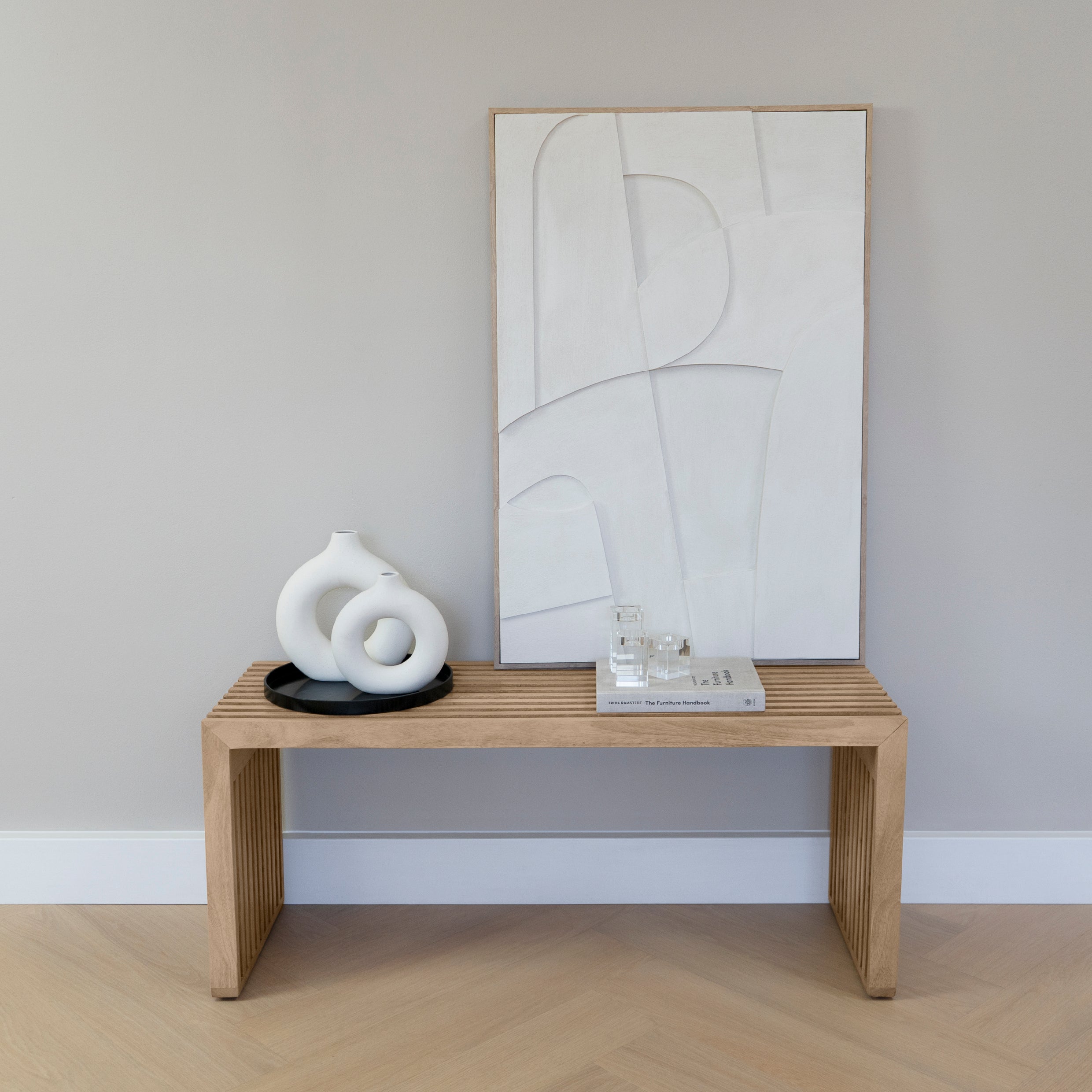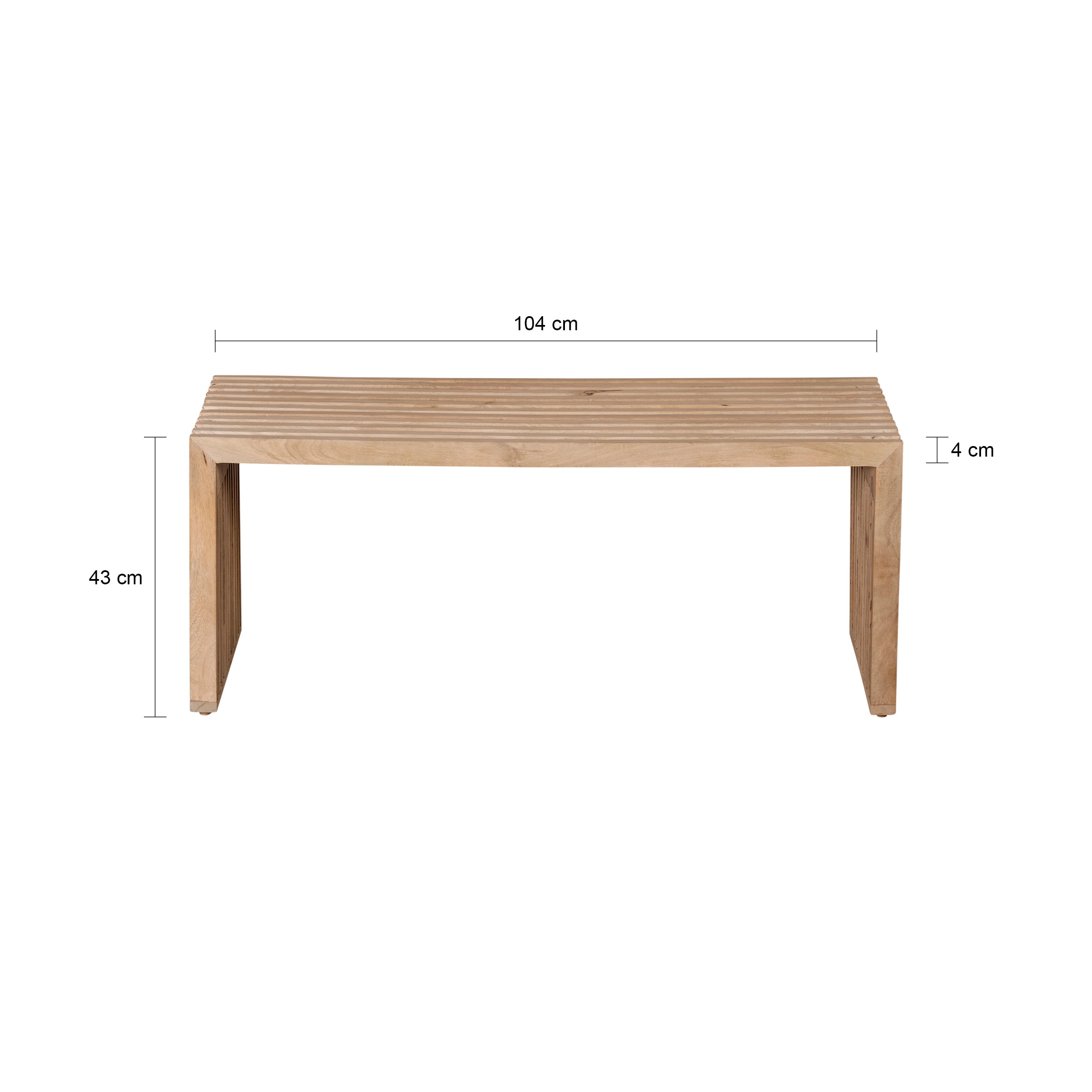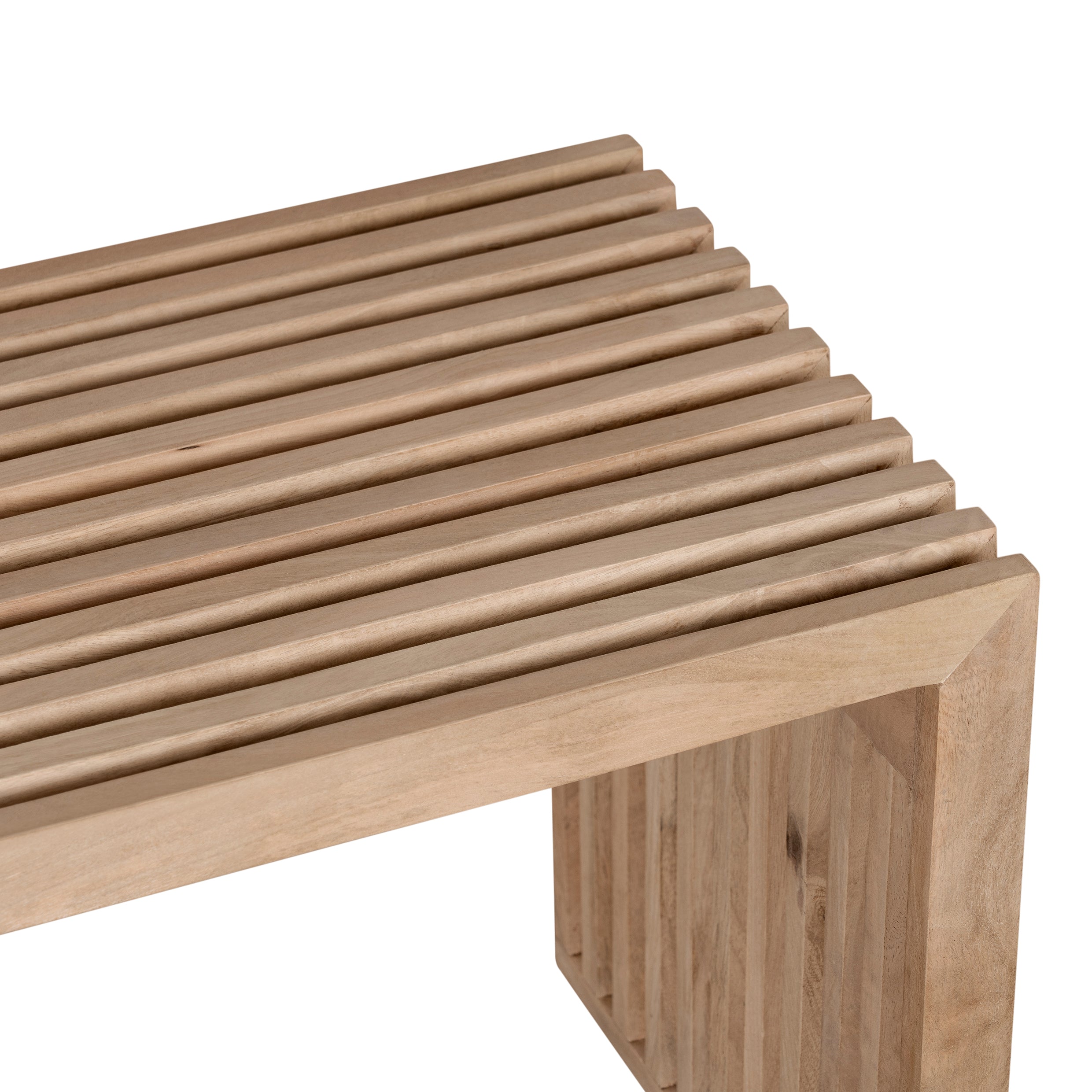 Tijdloze charme De natuurlijke houtkleur en het minimalistische design geven het bankje een warme, moderne uitstraling. Het past net zo goed in een licht, luchtig interieur als in een meer robuuste setting met industriële accenten.