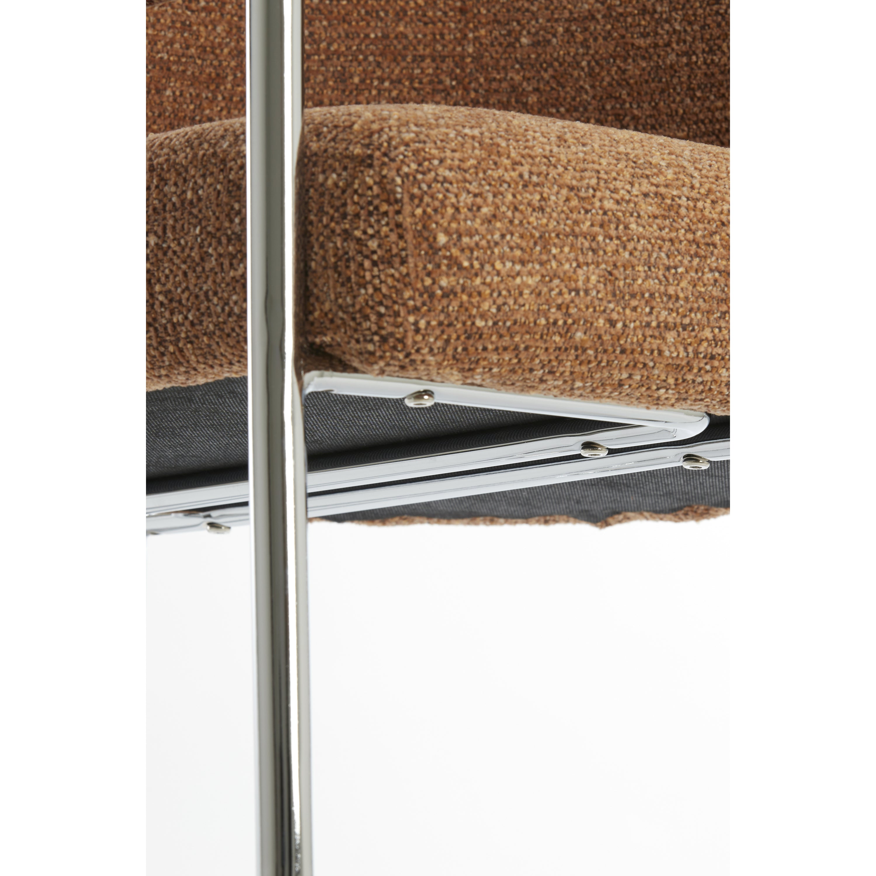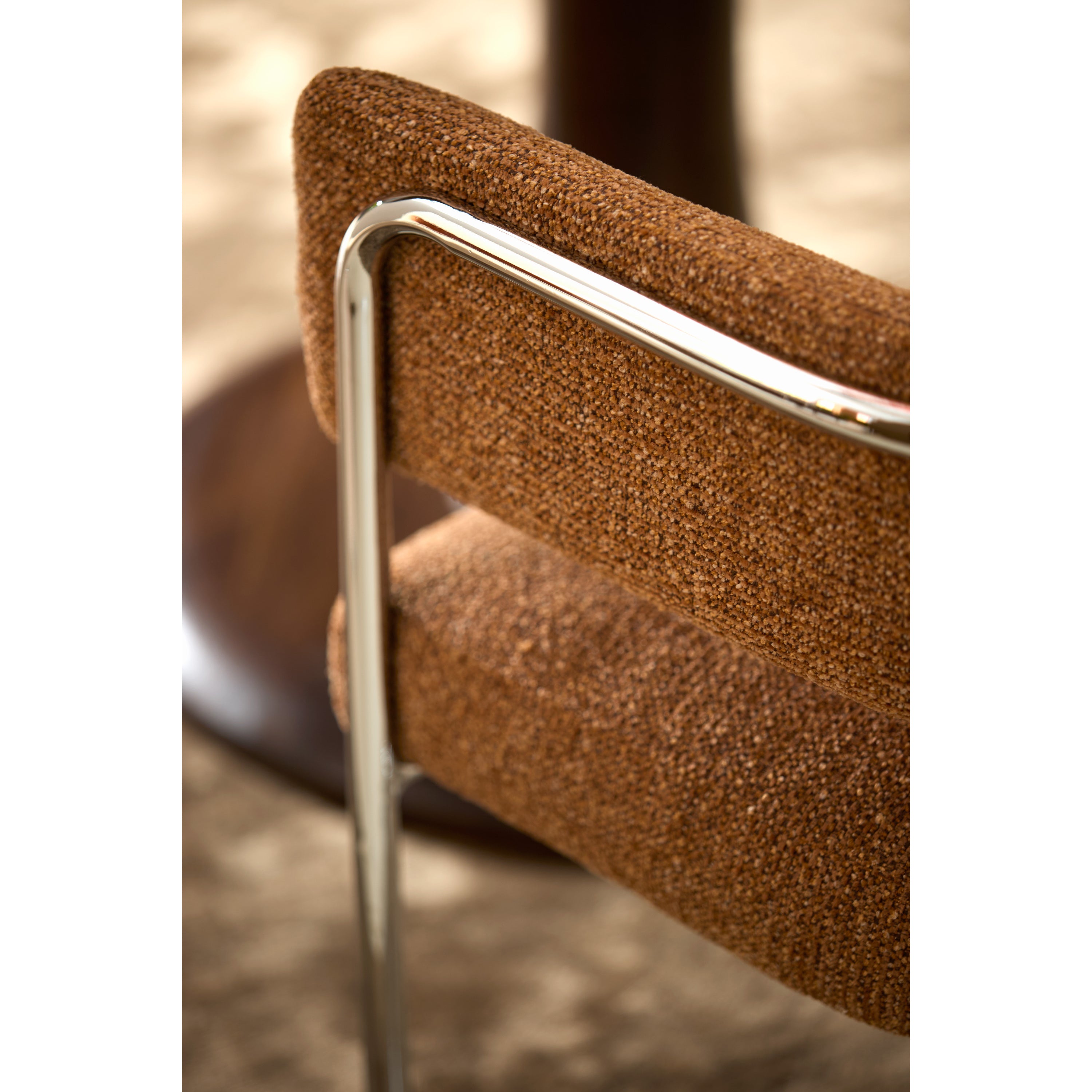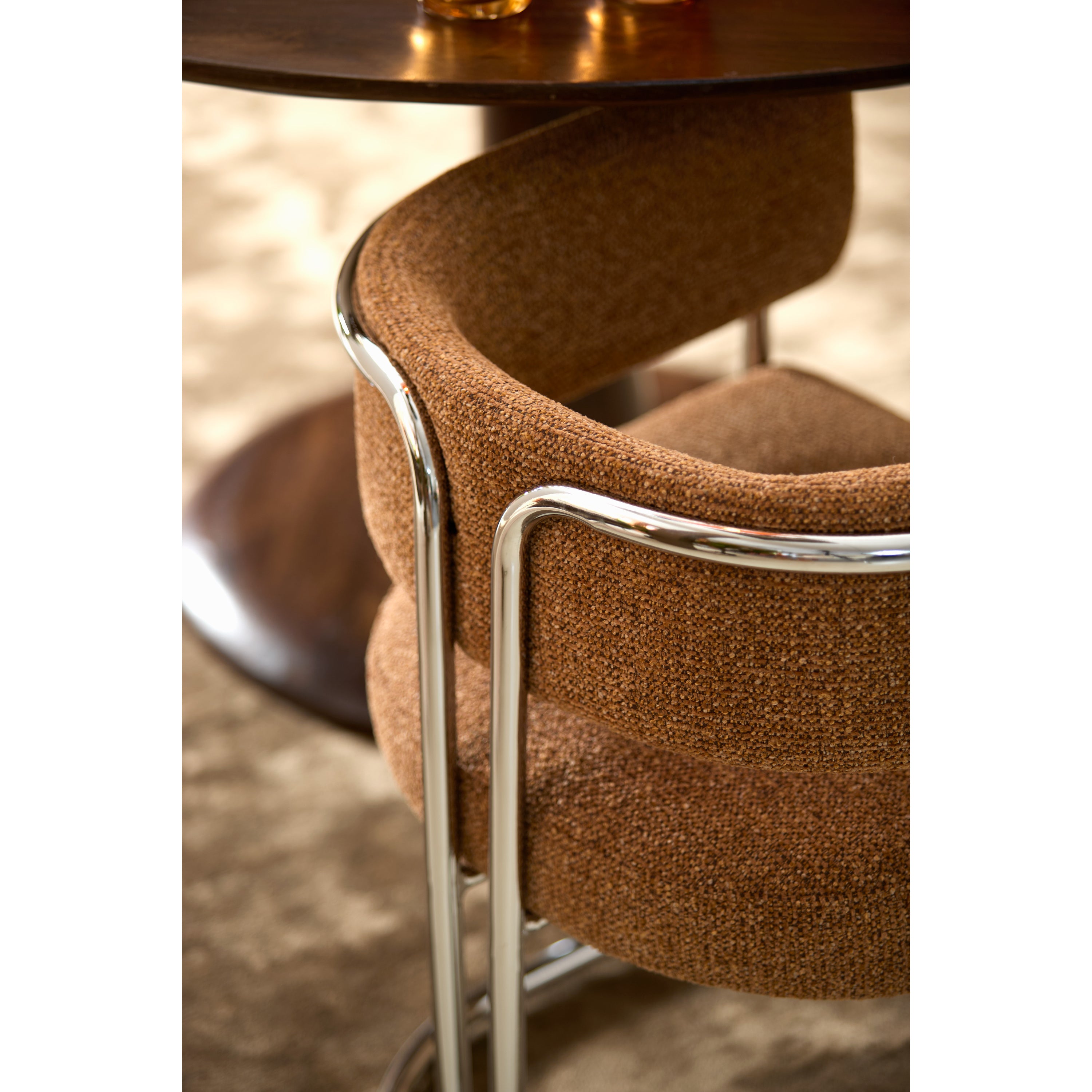 Het glanzende chroom frame van de ADANTE eetkamerstoel zorgt voor een strakke en moderne afwerking die de stoel een luxueuze uitstraling geeft. Het chroom voegt niet alleen een eigentijdse touch toe, maar is ook praktisch, omdat het gemakkelijk te onderhouden is en een lange levensduur heeft. Het contrast tussen de warme karamelkleurige zitting en het koele, glanzende chroom maakt de stoel tot een echt statement stuk in je eetkamer.