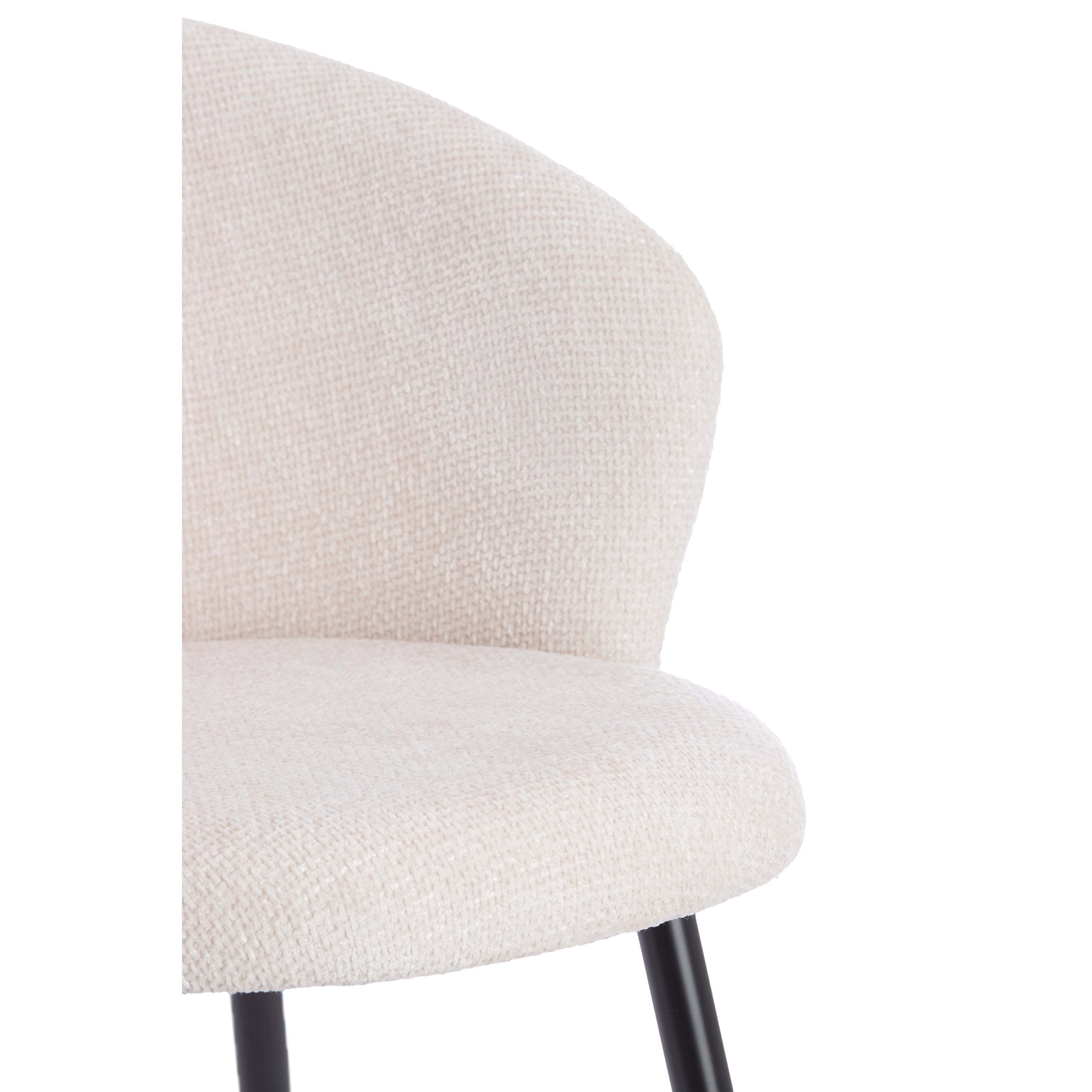 Deze eetkamerstoel is gebouwd om lang mee te gaan, dankzij de stevige constructie en hoogwaardige materialen. De zwarte poten zijn robuust en zorgen voor stabiliteit, terwijl de crèmekleurige bekleding duurzaam en gemakkelijk te onderhouden is.