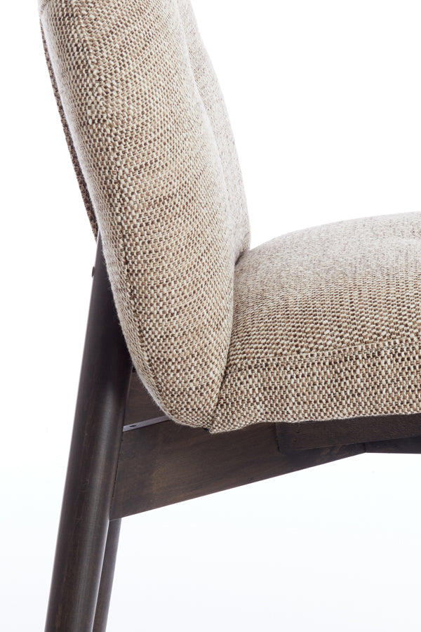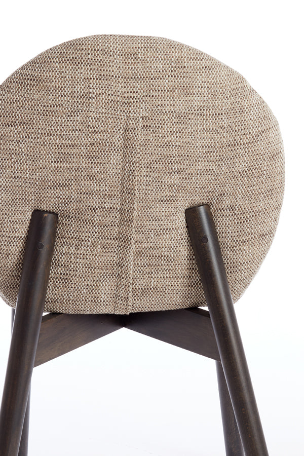 De stoel staat stevig op beech houten poten in een donker bruine kleur, die niet alleen voor stabiliteit zorgen, maar ook een natuurlijke en warme uitstraling hebben.