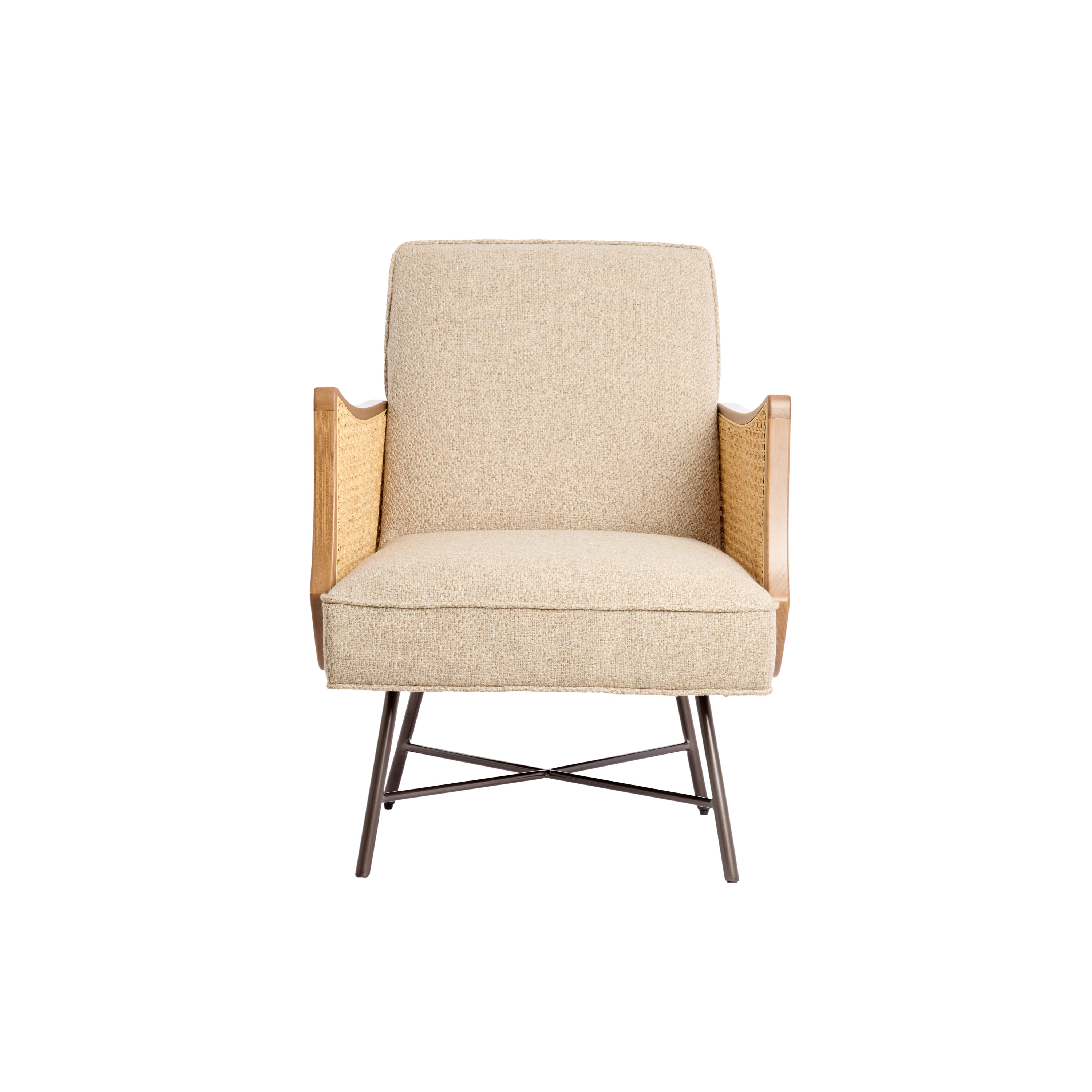 De combinatie van beige stof en natuurlijk rotan geeft de FIORA stoel een rustige, organische uitstraling die past bij zowel moderne als landelijke interieurs. Het rotan detail in de rugleuning zorgt voor een open, luchtige sfeer in de ruimte.