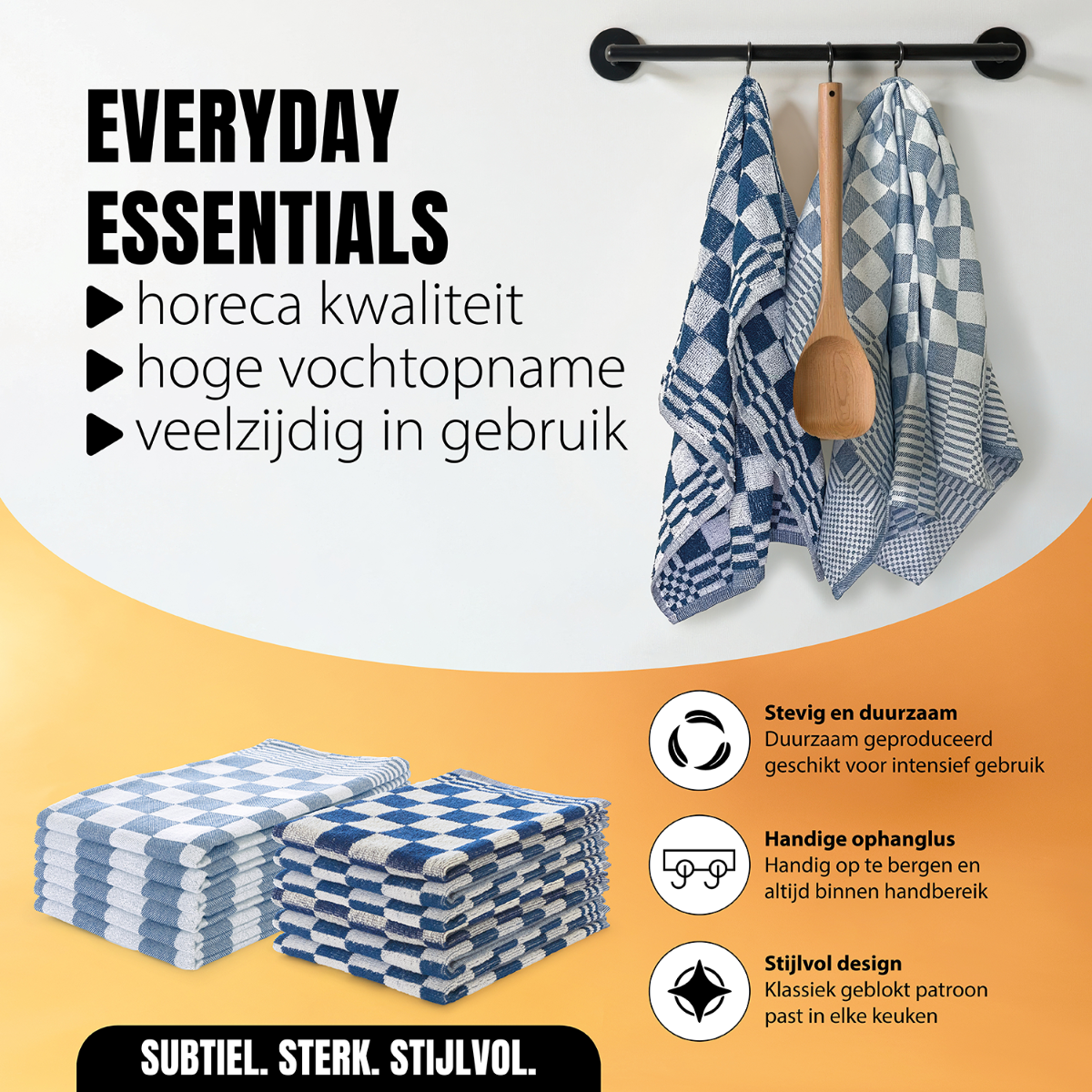 De keukendoek (50x50 cm) is ideaal voor het afdrogen van je handen of het schoonmaken van het aanrecht. De royale theedoek (65x65 cm) is perfect voor het afdrogen van je servies. Beide zijn voorzien van een handig ophanglusje en hebben een klassiek geblokt patroon dat past in elke keuken.