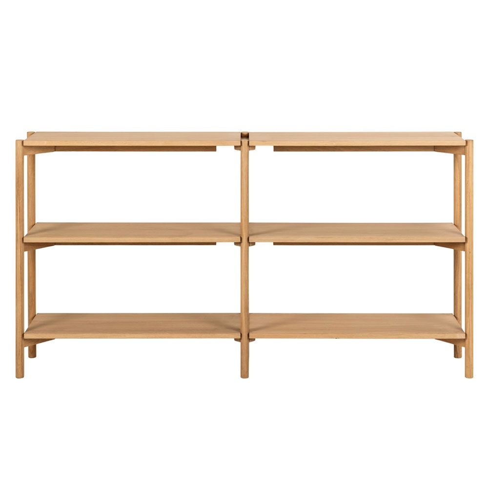 Het geraamte van deze lage boekenkast bestaat uit zes ronde poten die zijn gemaakt van massief eikenhout. De planken zijn afgewerkt met een laagje fineer. Deze boekenkast is 169 cm breed, 30 cm diep en 88,4 cm hoog. Er zijn zes losse planken die je kan vullen met boeken of andere accessoires. Door de ronde vormen van het geraamte en de mooie houtkleur heeft de kast een zachte en natuurlijke uitstraling. Een leuk detail is ook de inkeping waar de planken op het geraamte liggen. Dankzij het minimalistische ontwerp gaat alle aandacht uit naar de voorwerpen in de kast.