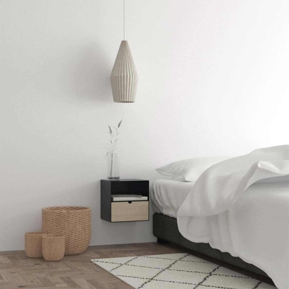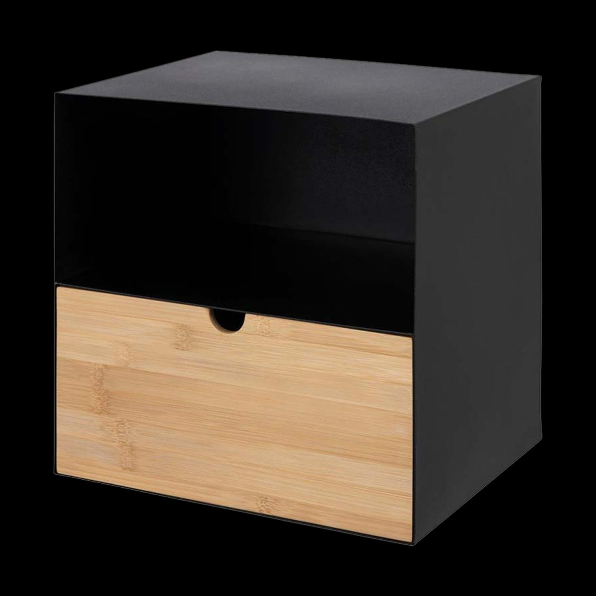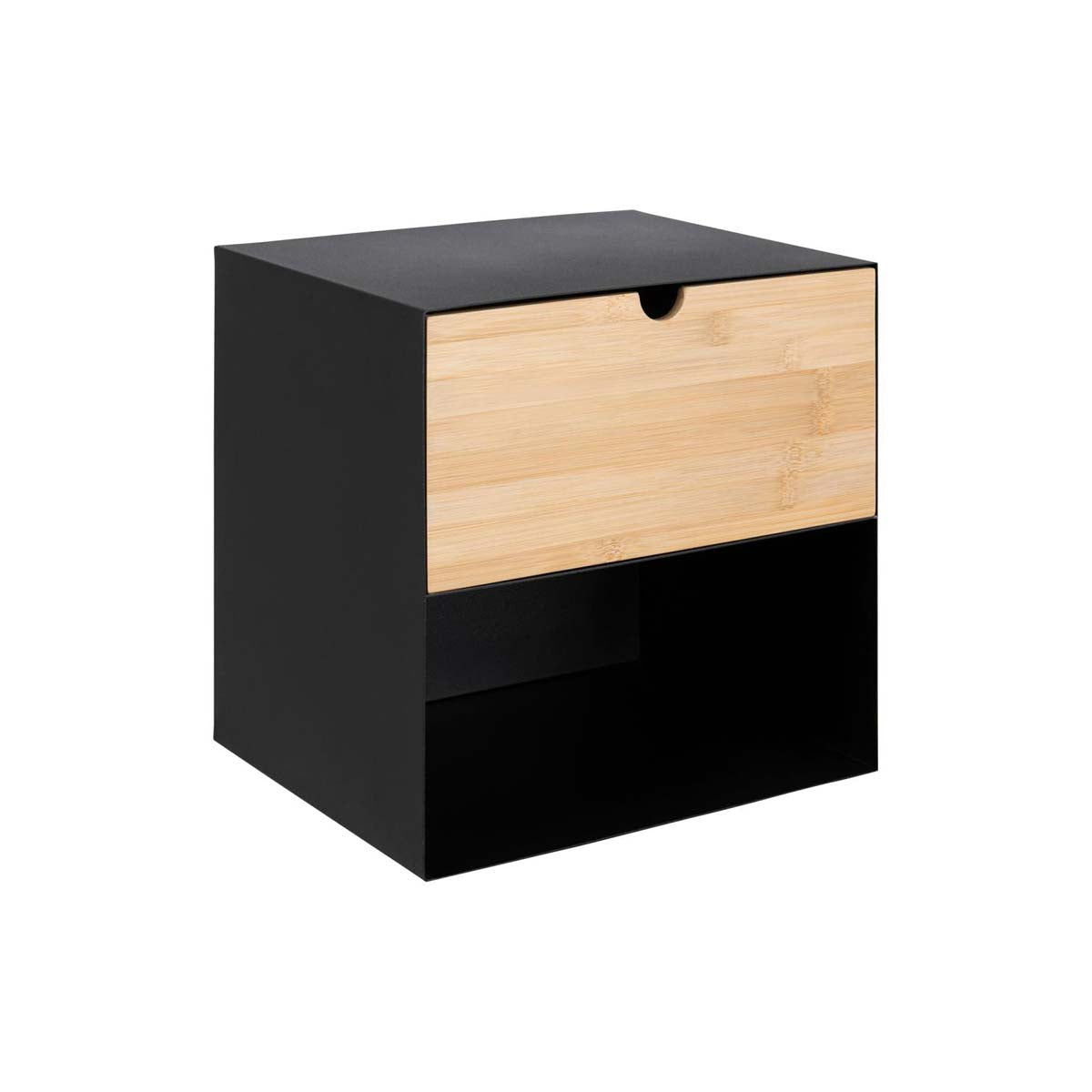 Gebruik deze wandkast als nachtkastje naast je bed. Liever alles bij de hand willen hebben tijdens het werken? Monteer deze kast aan de muur bij je bureau en creëer meer opbergruimte voor je spullen. Het frame van de wandkast is gemaakt van zwart metaal en de lade is gemaakt van bamboe hout. De bamboe lade is te verplaatsen naar zowel het onderste vak als het bovenste vak van de kast. Zo richt je de kast precies zo in zoals jij wilt!